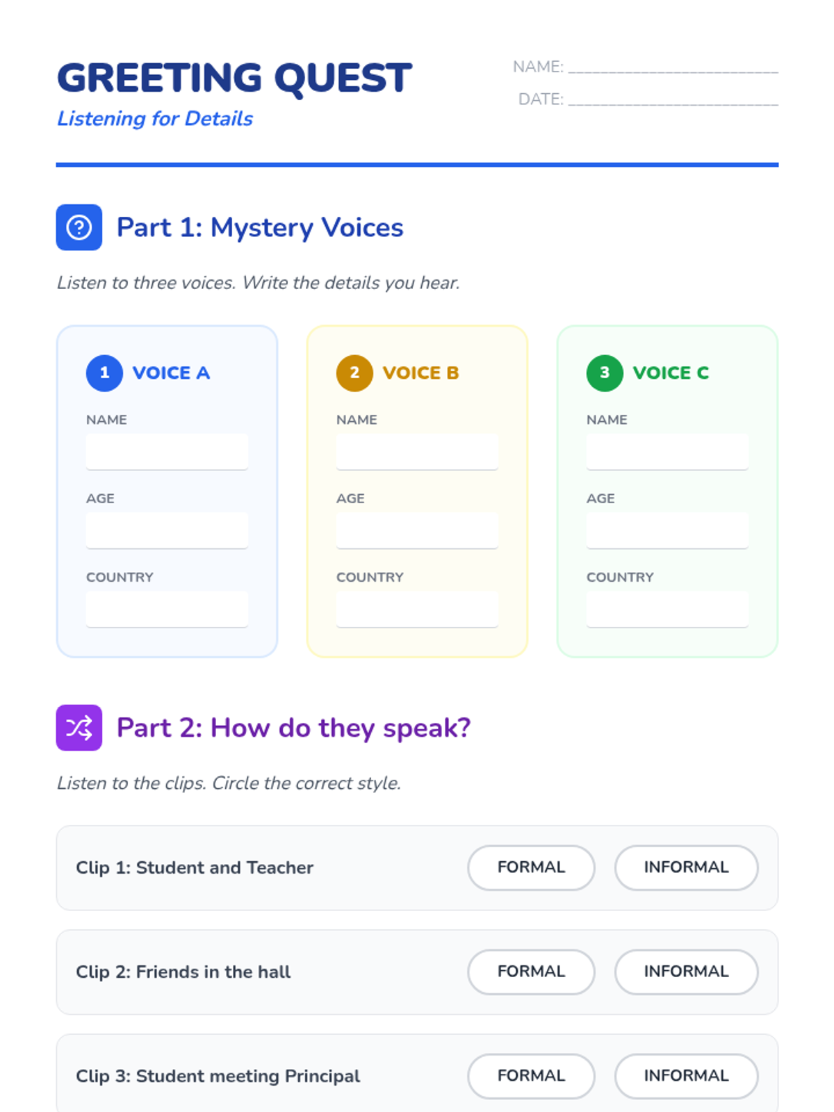 A comprehensive ESL listening sequence for 4th graders focusing on natural speech patterns, emotional tone, idioms, and social registers. Students act as 'Ear Detectives' to decode the hidden meanings in how English is actually spoken vs. how it is written.