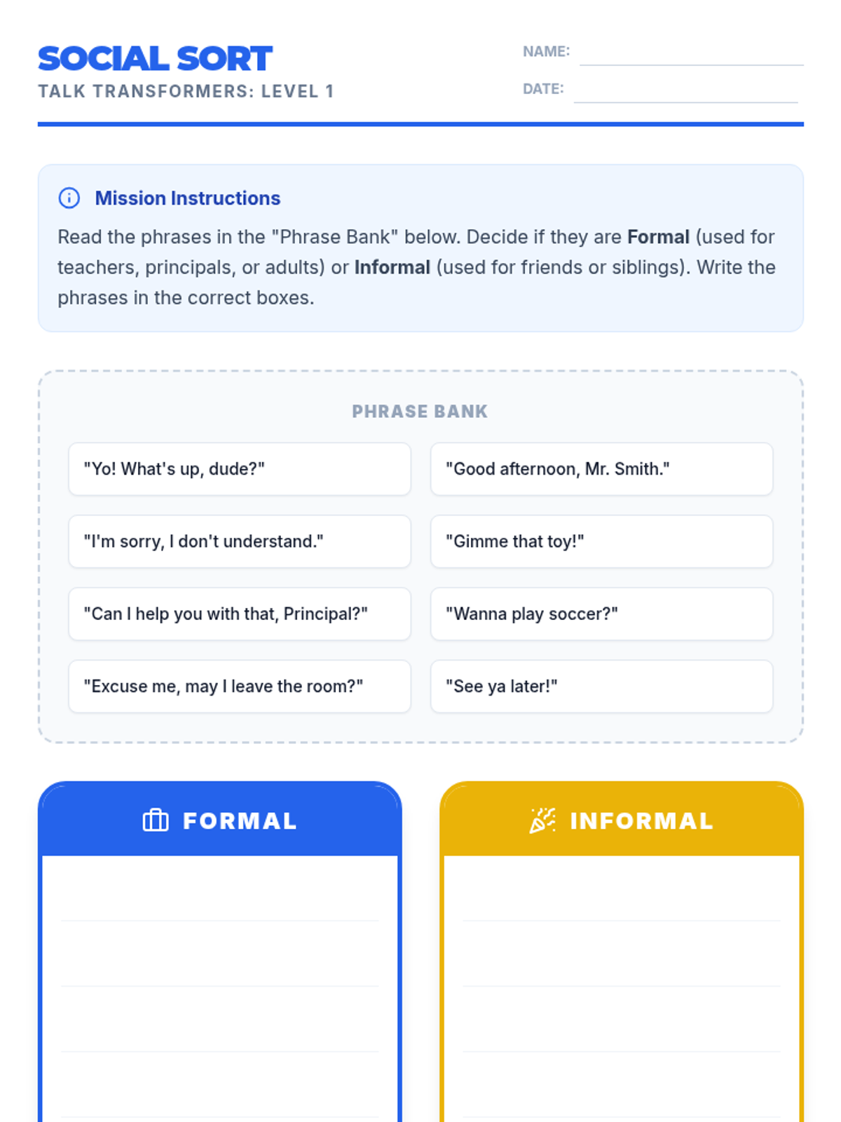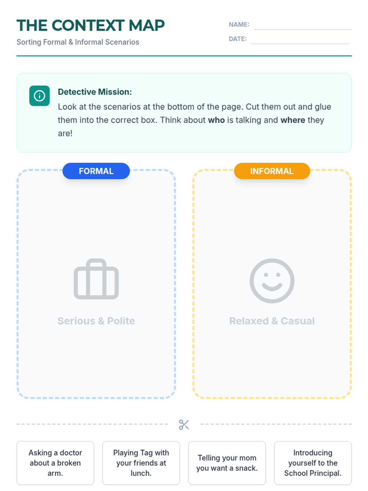 This sequence teaches 4th-grade ESL students how to navigate social situations by adjusting their register and tone. Students learn to distinguish between formal and informal language, use modal verbs for polite requests, and practice code-switching based on their audience.