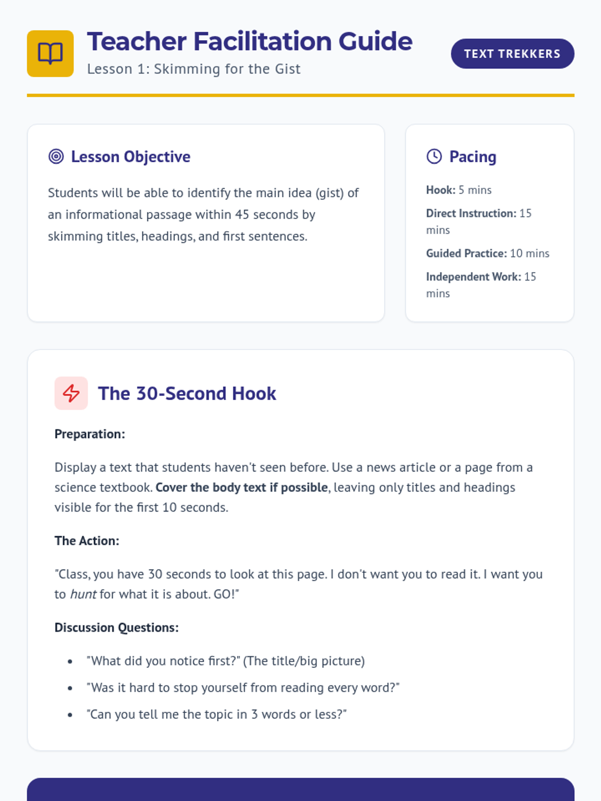 This sequence teaches 5th-grade ESL students how to navigate informational texts efficiently using skimming and scanning strategies. Students will move from understanding the big picture to locating specific keywords and using text features to answer test-style questions under time pressure.