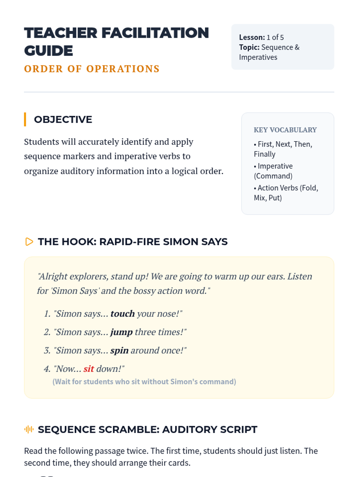 This sequence helps 4th Grade ESL students master listening skills by focusing on multi-step directions, sequence markers, spatial prepositions, and clarification strategies. Students progress from identifying simple transition words to navigating complex maps and completing an auditory scavenger hunt.