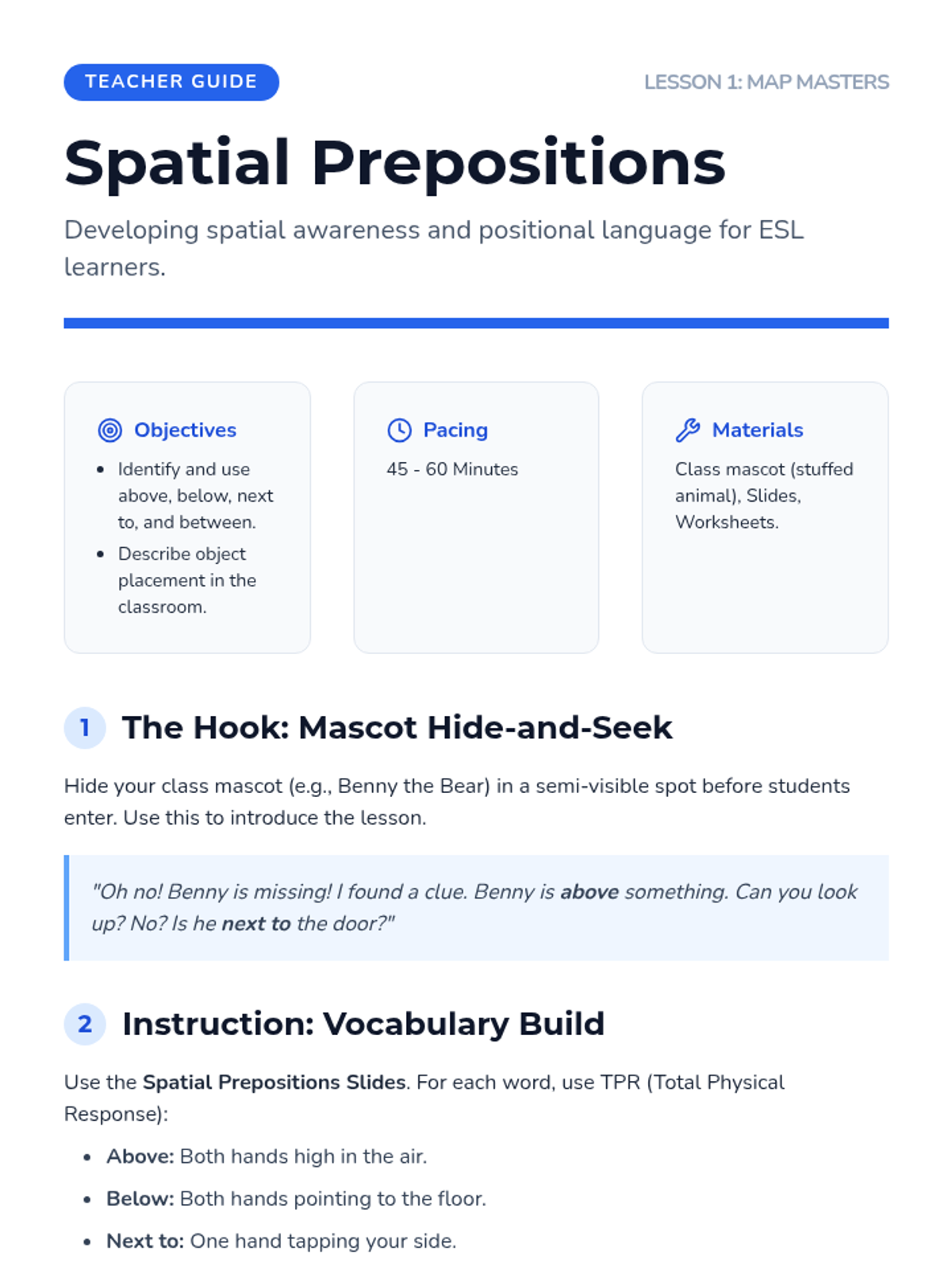 A comprehensive ESL sequence for 1st graders focusing on the academic language of spatial relationships, directional movement, and map literacy within a Social Studies context. Students progress from basic positional words to navigating and creating their own maps.