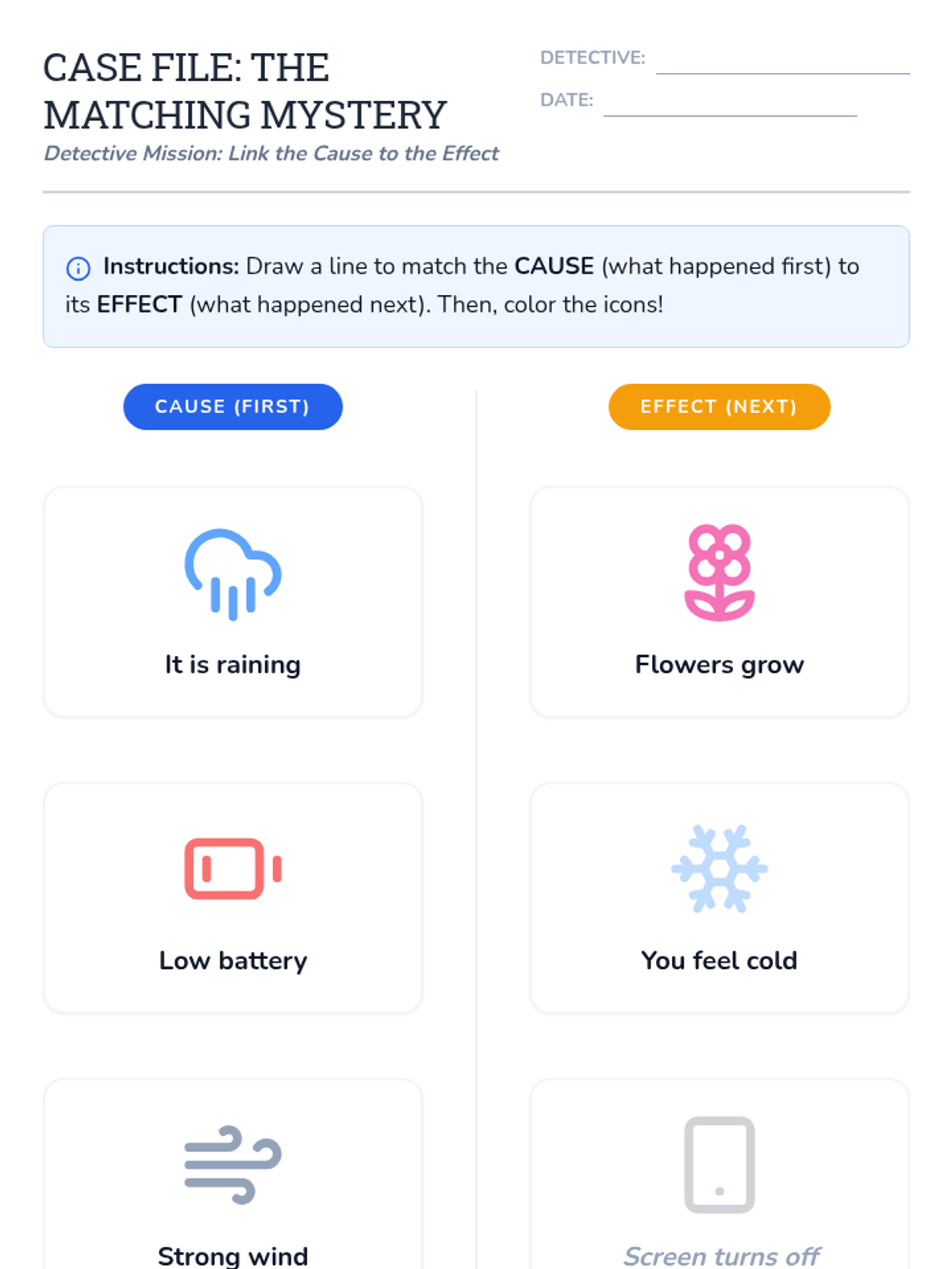 A first-grade ESL sequence focusing on academic language for cause and effect. Students move from simple identification to using complex sentence structures like 'because' and 'if... then' to explain social and scientific phenomena.