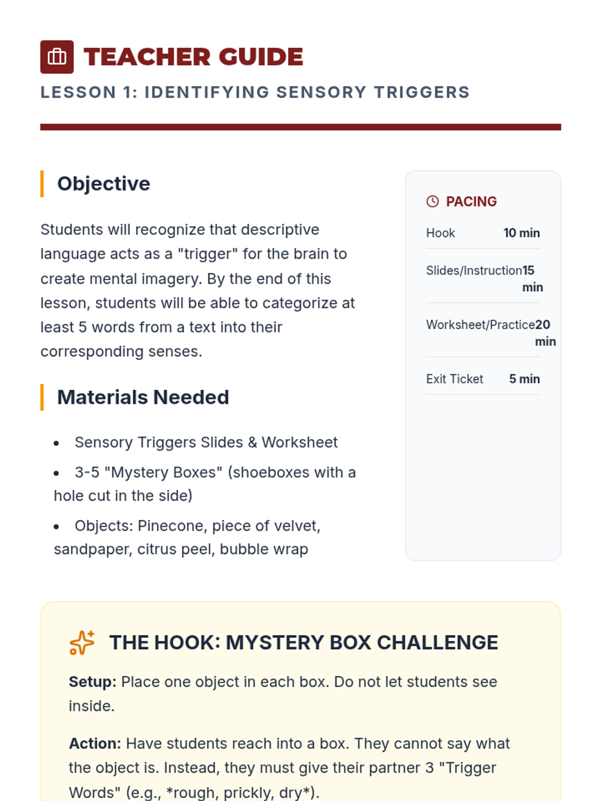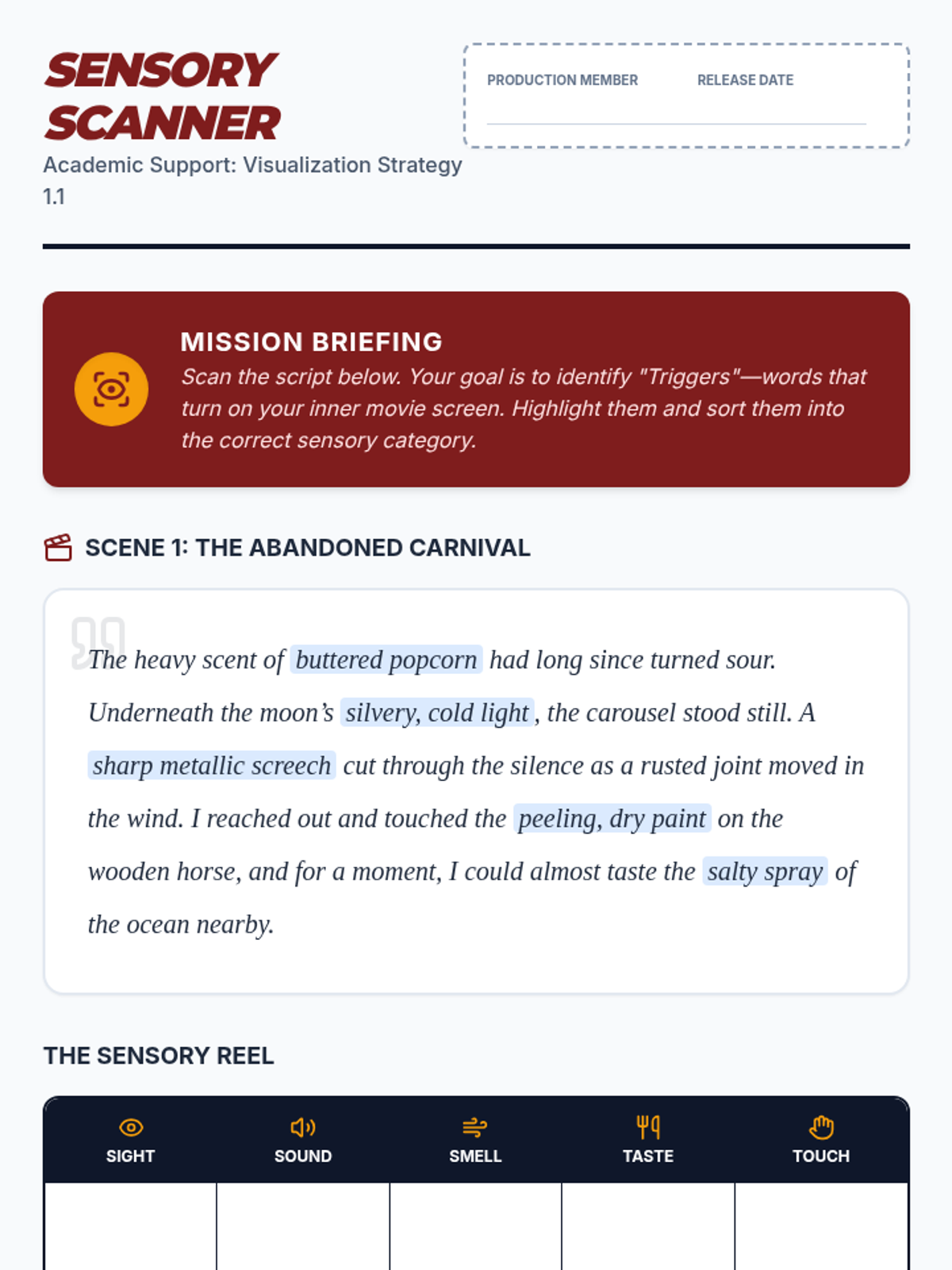 A comprehensive 5-lesson sequence designed for 8th-grade academic support, focusing on building visualization skills through the metaphor of a 'Mind Movie.' Students progress from identifying sensory triggers in text to using visualization as a metacognitive tool for self-monitoring comprehension.