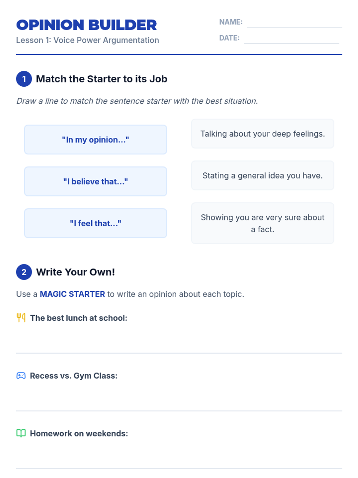 This sequence guides 3rd Grade ESL students through the process of forming opinions, justifying them with logic, and engaging in respectful debate using complex sentence structures.