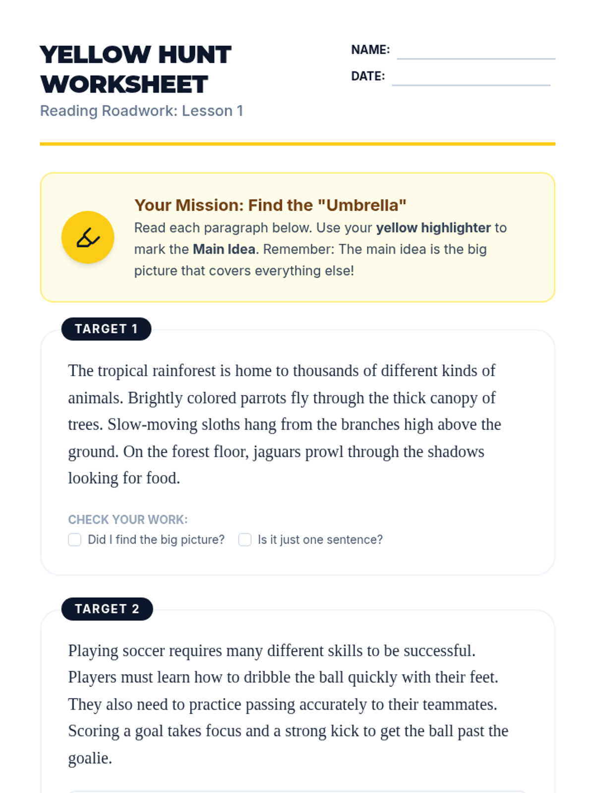 A 5-lesson sequence for 3rd-grade students focused on using a color-coded highlighting system (Yellow for 'Who', Green for 'What') to improve reading comprehension and text organization. This workshop-style unit moves from physical sorting to multi-color text annotation and summarization.