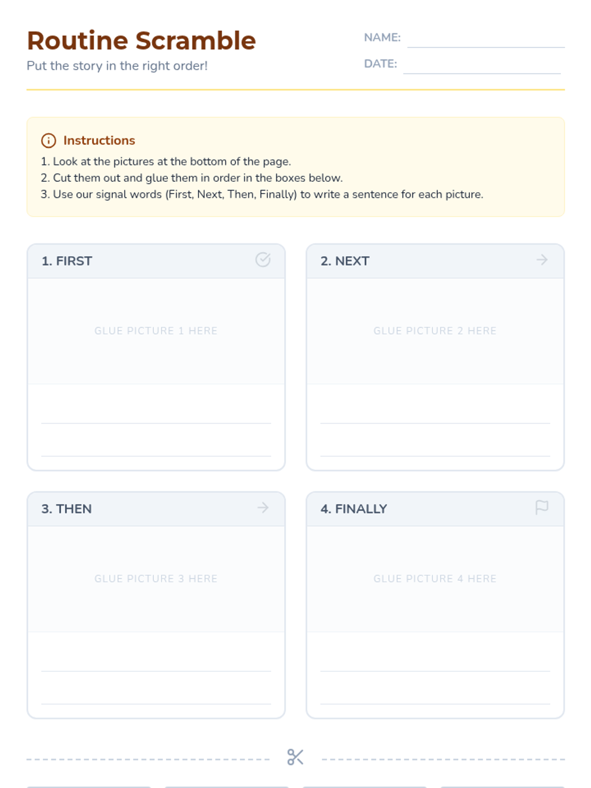 This sequence introduces 1st Grade ESL students to academic sequencing vocabulary. Students learn to use temporal transitions like 'first', 'next', 'then', and 'finally' to describe daily routines, scientific life cycles, and procedural instructions.
