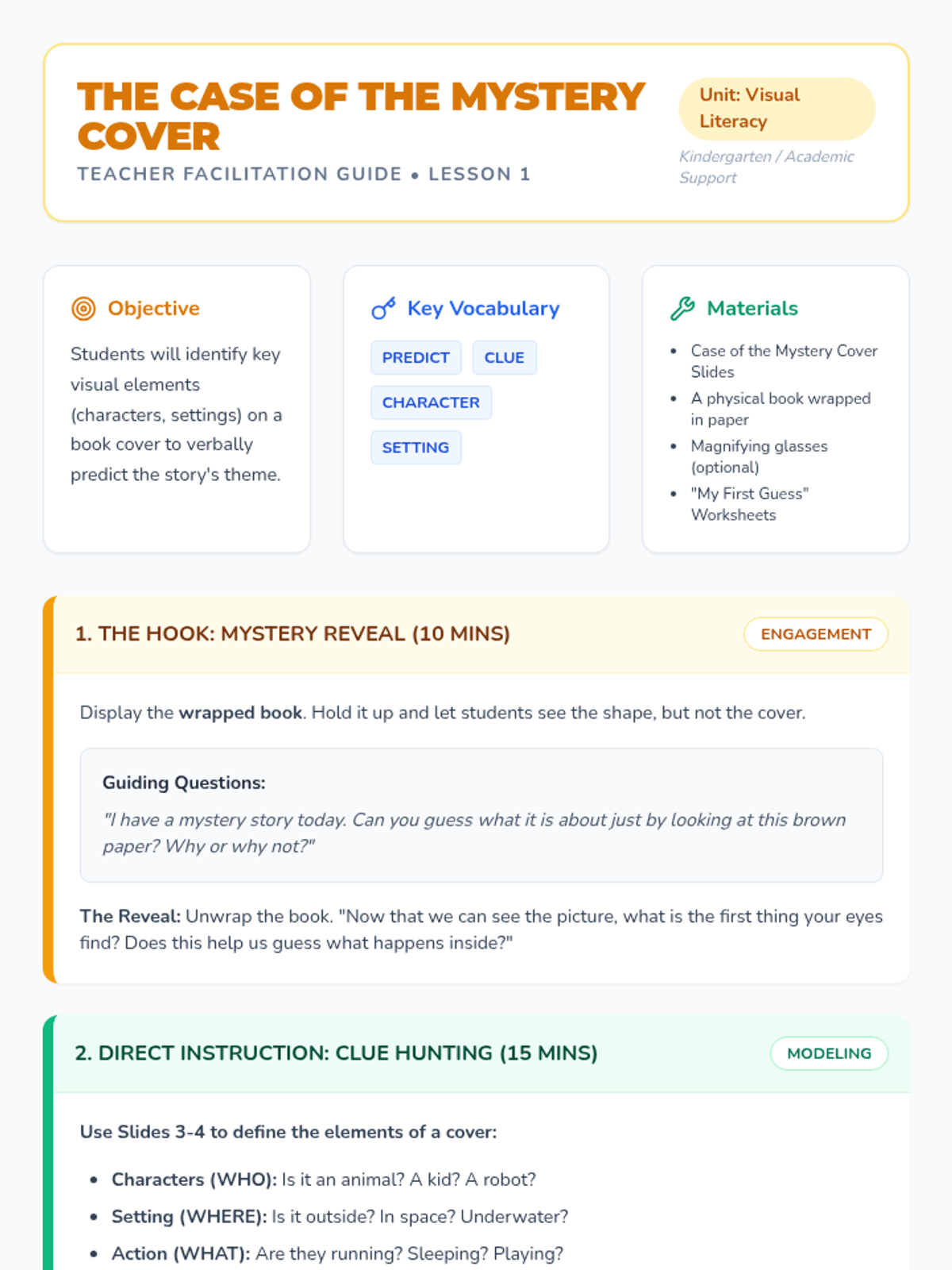 A Kindergarten sequence focused on visual literacy to teach prediction and inference. Students use picture clues from book covers and wordless stories to anticipate what happens next, developing critical thinking and observation skills through a 'Picture Detective' theme.