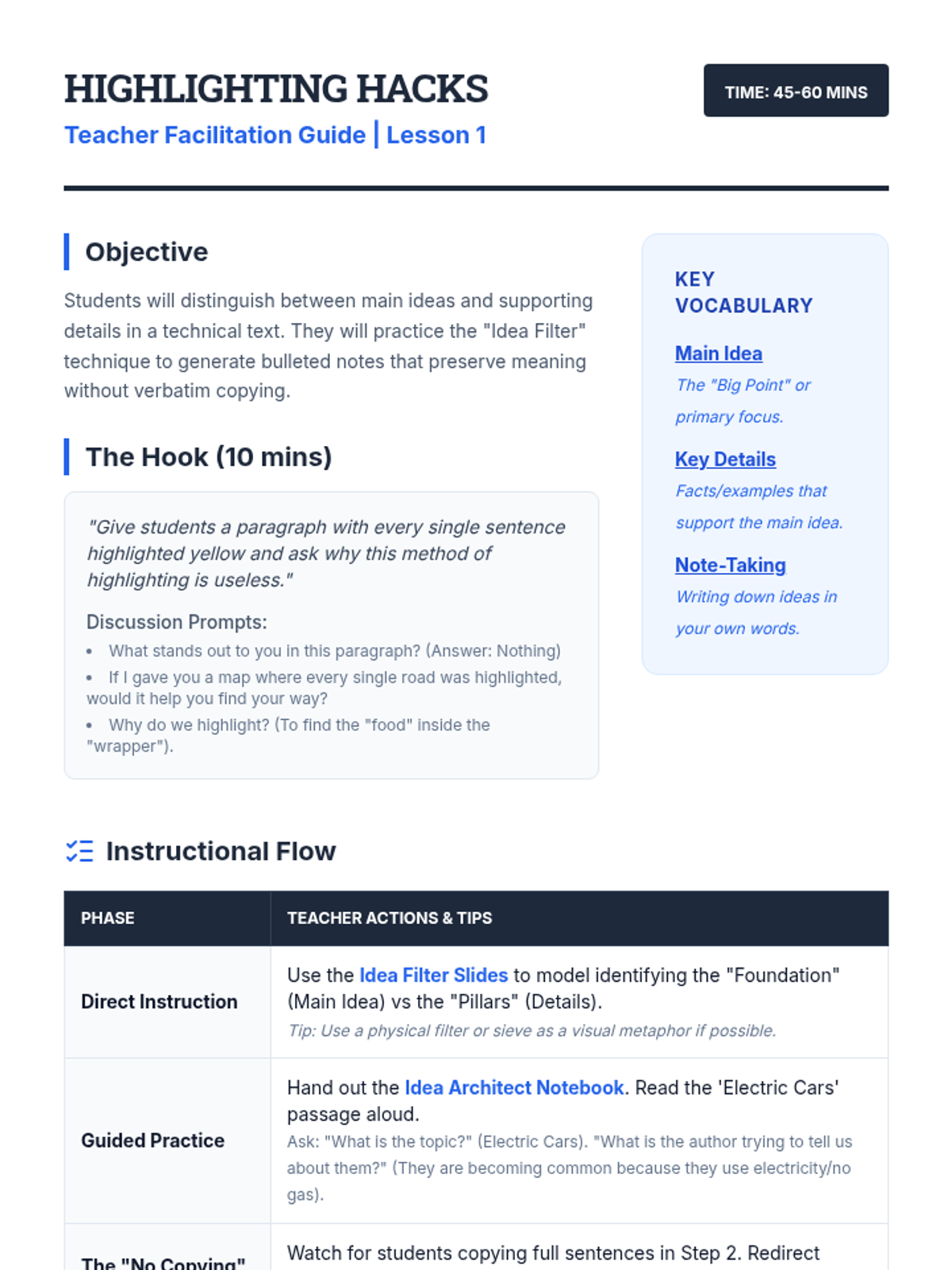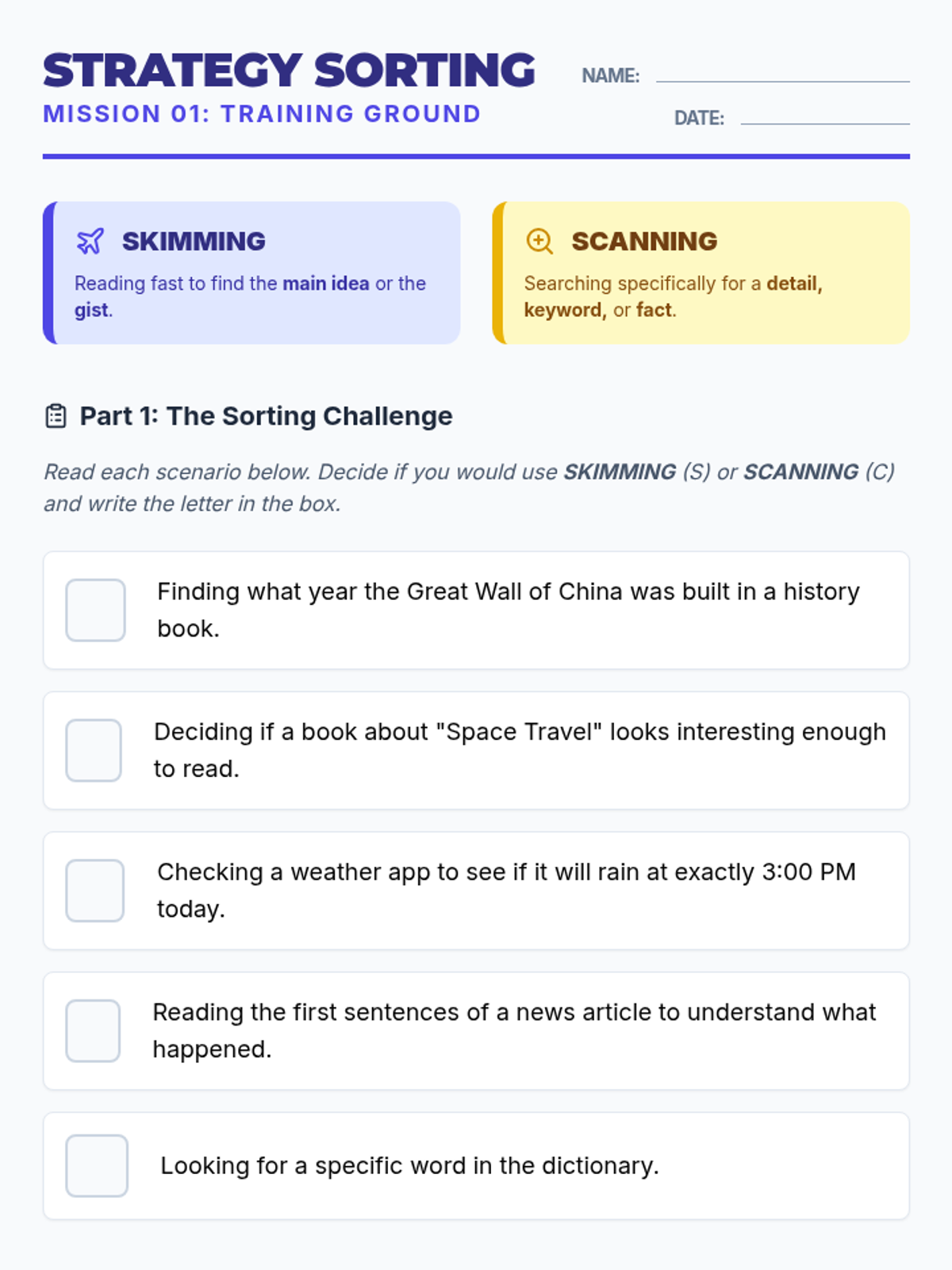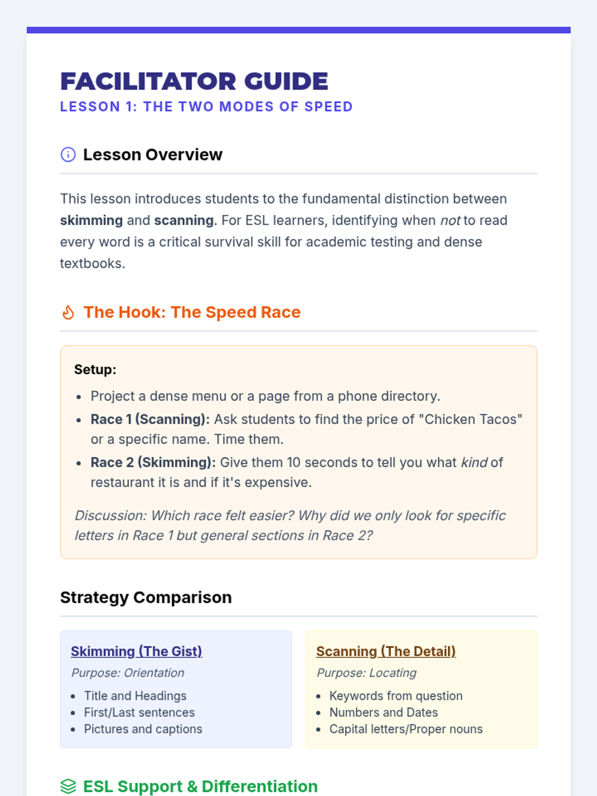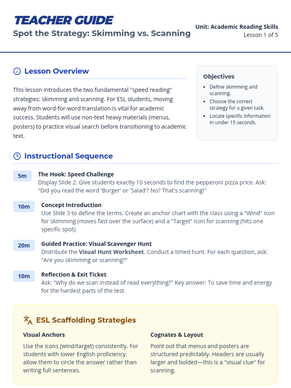 This sequence teaches 6th-grade ESL students the essential test-taking strategies of skimming and scanning. Through a 'Speed Scout' academy theme, students learn to navigate academic texts efficiently, identifying when to look for the 'gist' versus specific details to save time and improve accuracy on standardized tests.