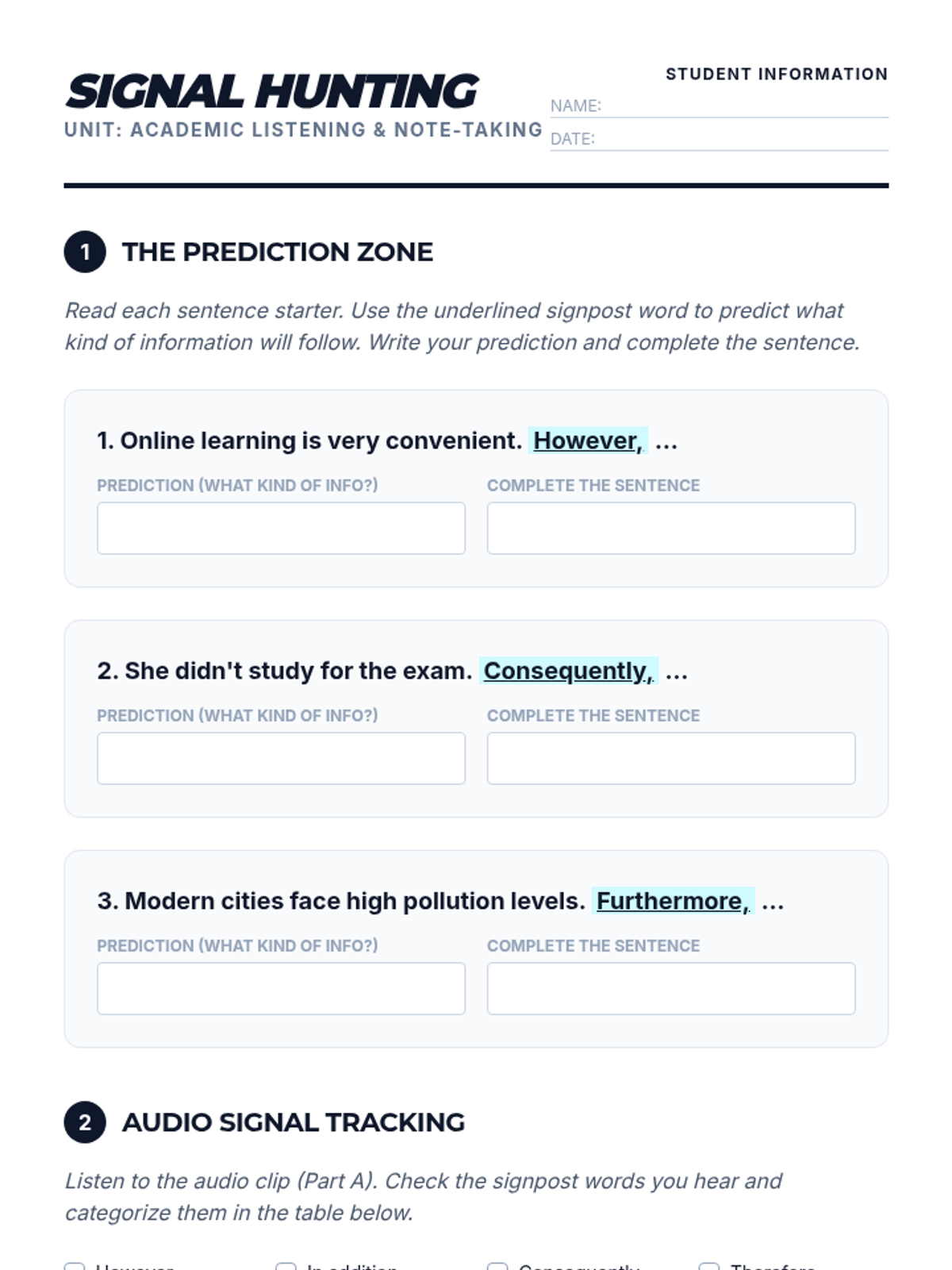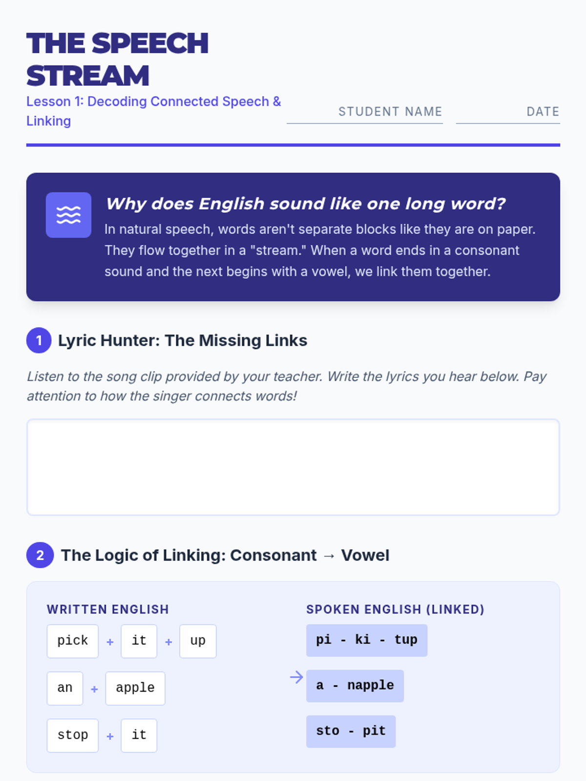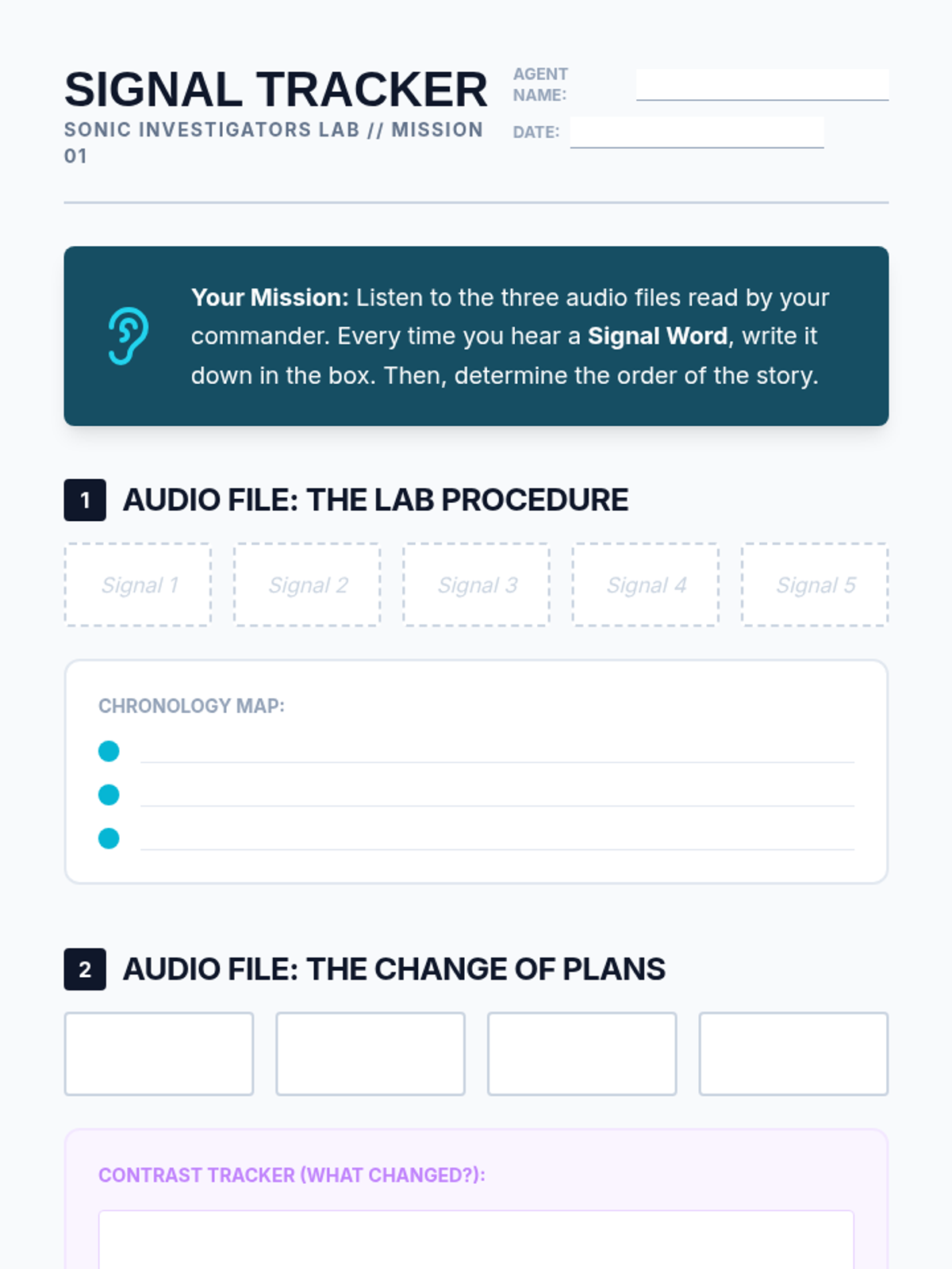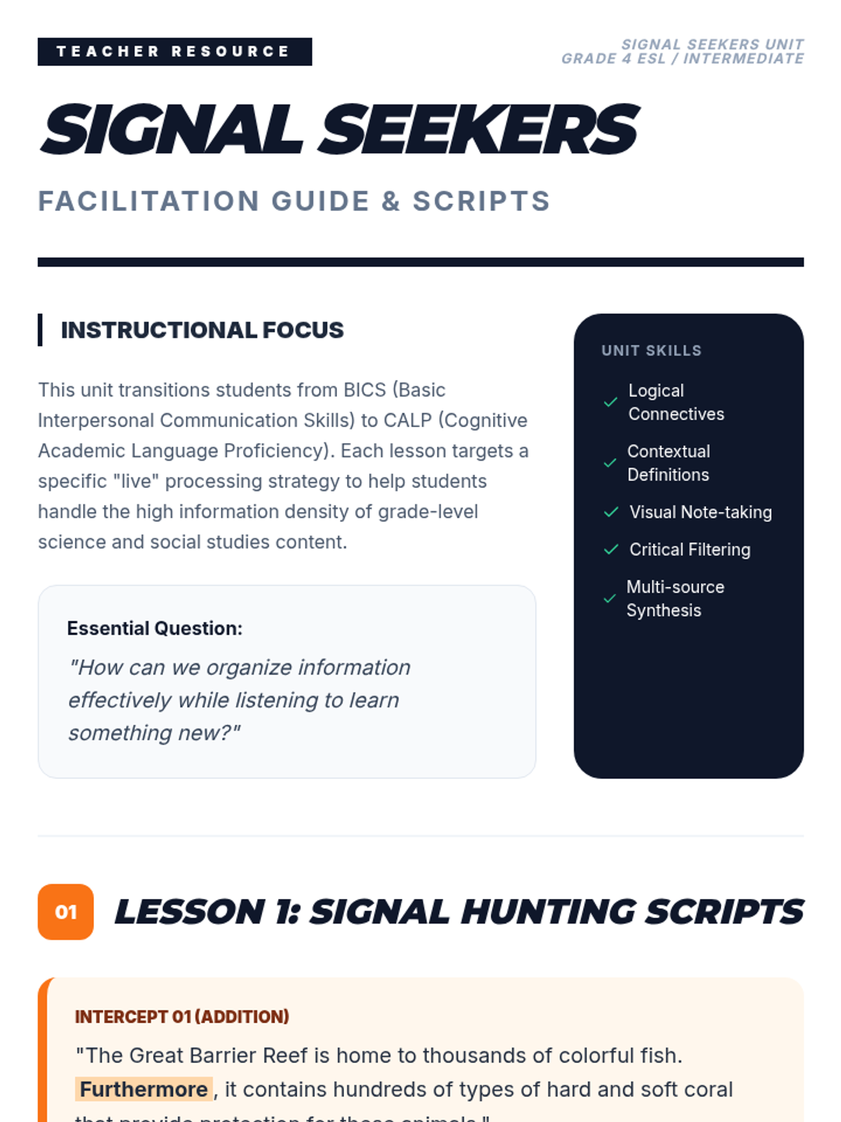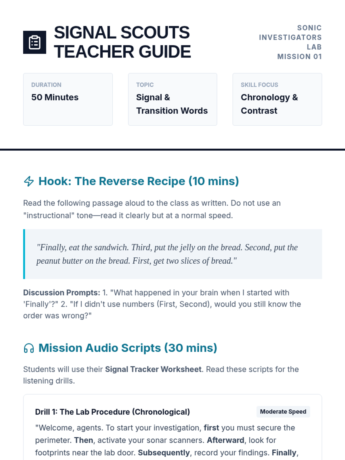 This 5th-grade ESL listening sequence focuses on academic readiness by training students to decode complex, multi-step instructions and academic lectures. Students will master signal words, spatial visualization, keyword note-taking, and natural speech reductions through a series of "Listening Agent" missions.