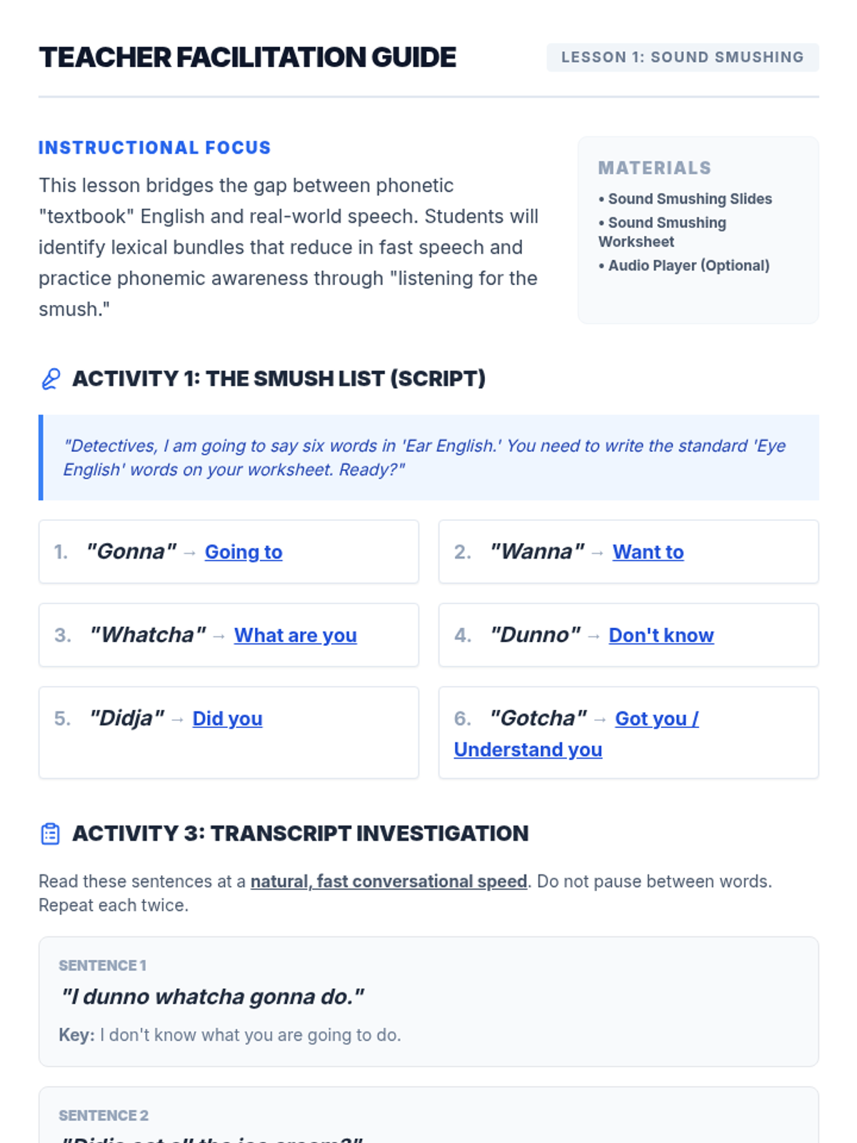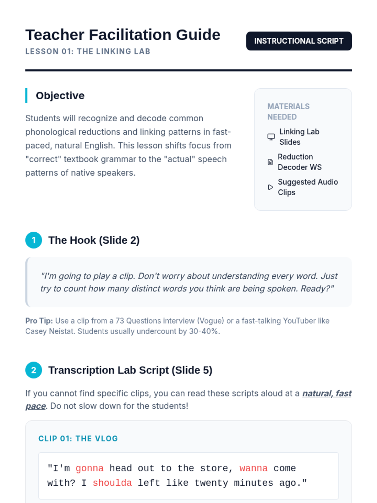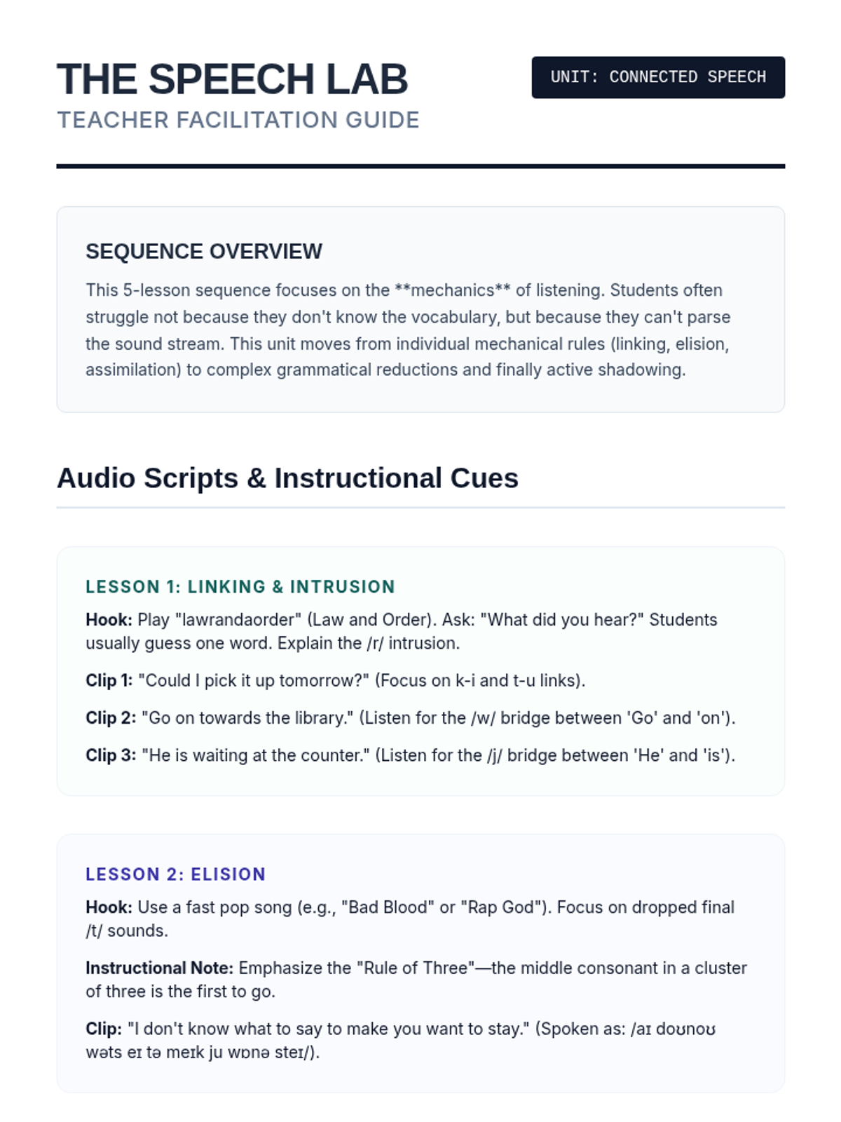 A comprehensive 5-lesson sequence for 10th-grade intermediate ESL students focused on decoding natural spoken English, including connected speech, reductions, idioms, and prosody. Students move from 'textbook' understanding to recognizing the fluid rhythms and figurative language of native speakers.