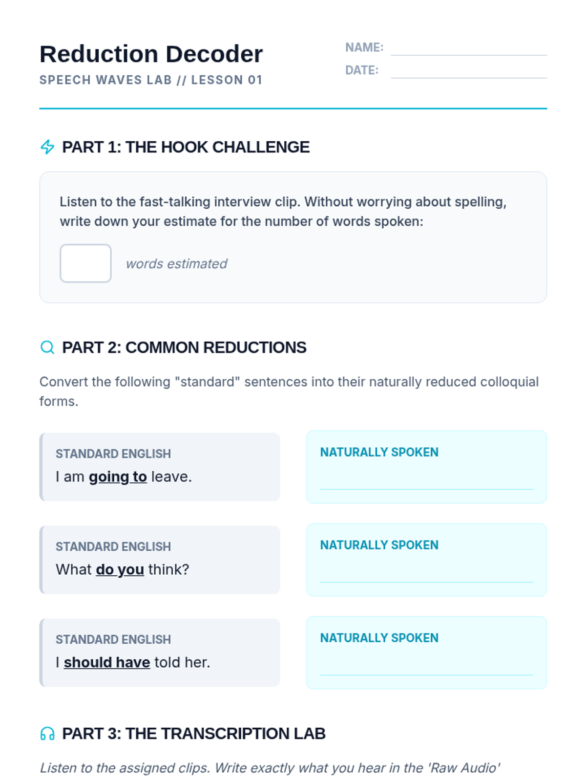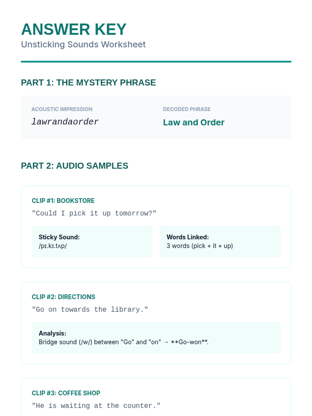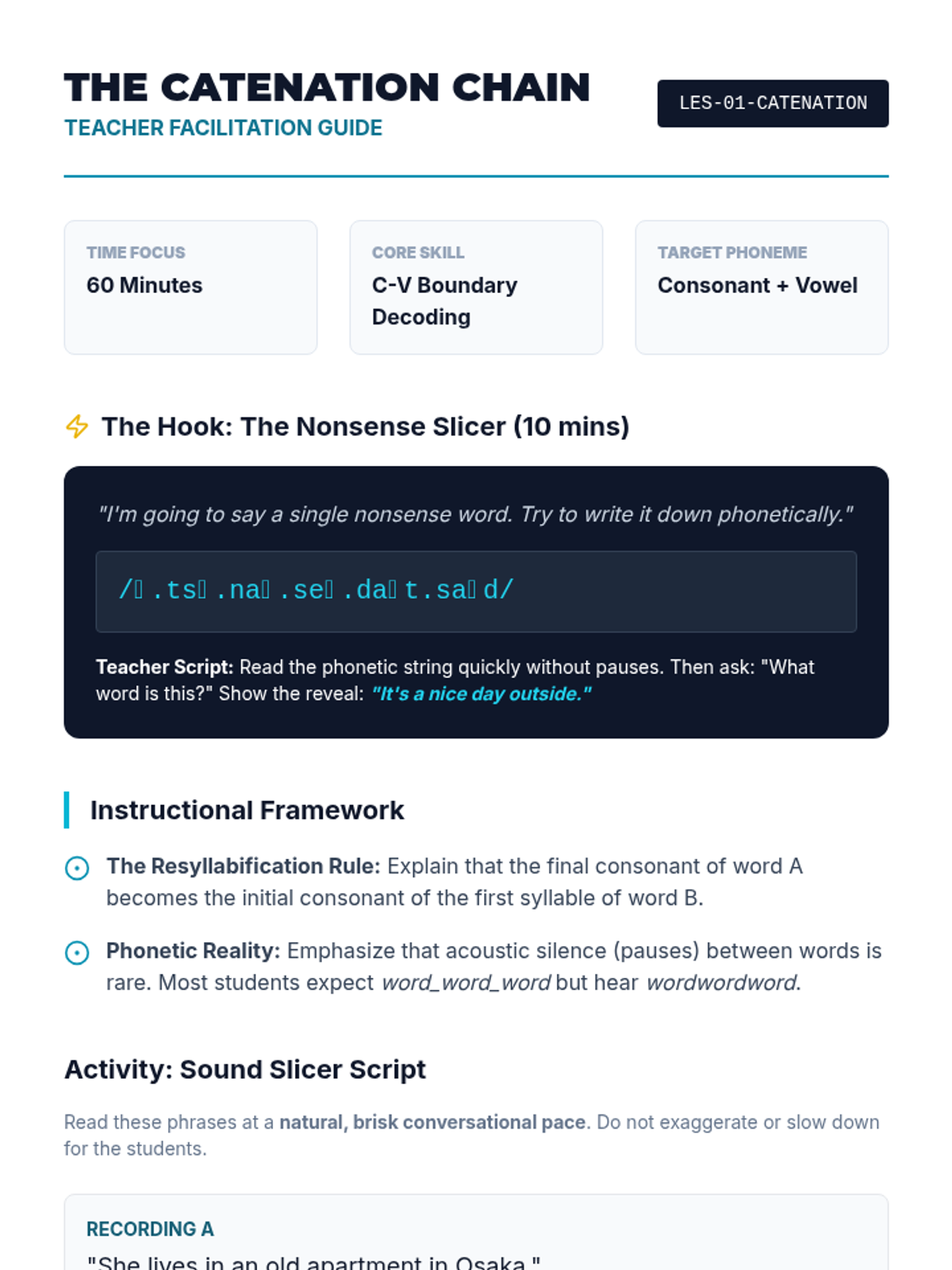 A comprehensive 5-lesson sequence for 10th-grade intermediate ESL students focused on decoding natural spoken English, including connected speech, reductions, idioms, and prosody. Students move from 'textbook' understanding to recognizing the fluid rhythms and figurative language of native speakers.