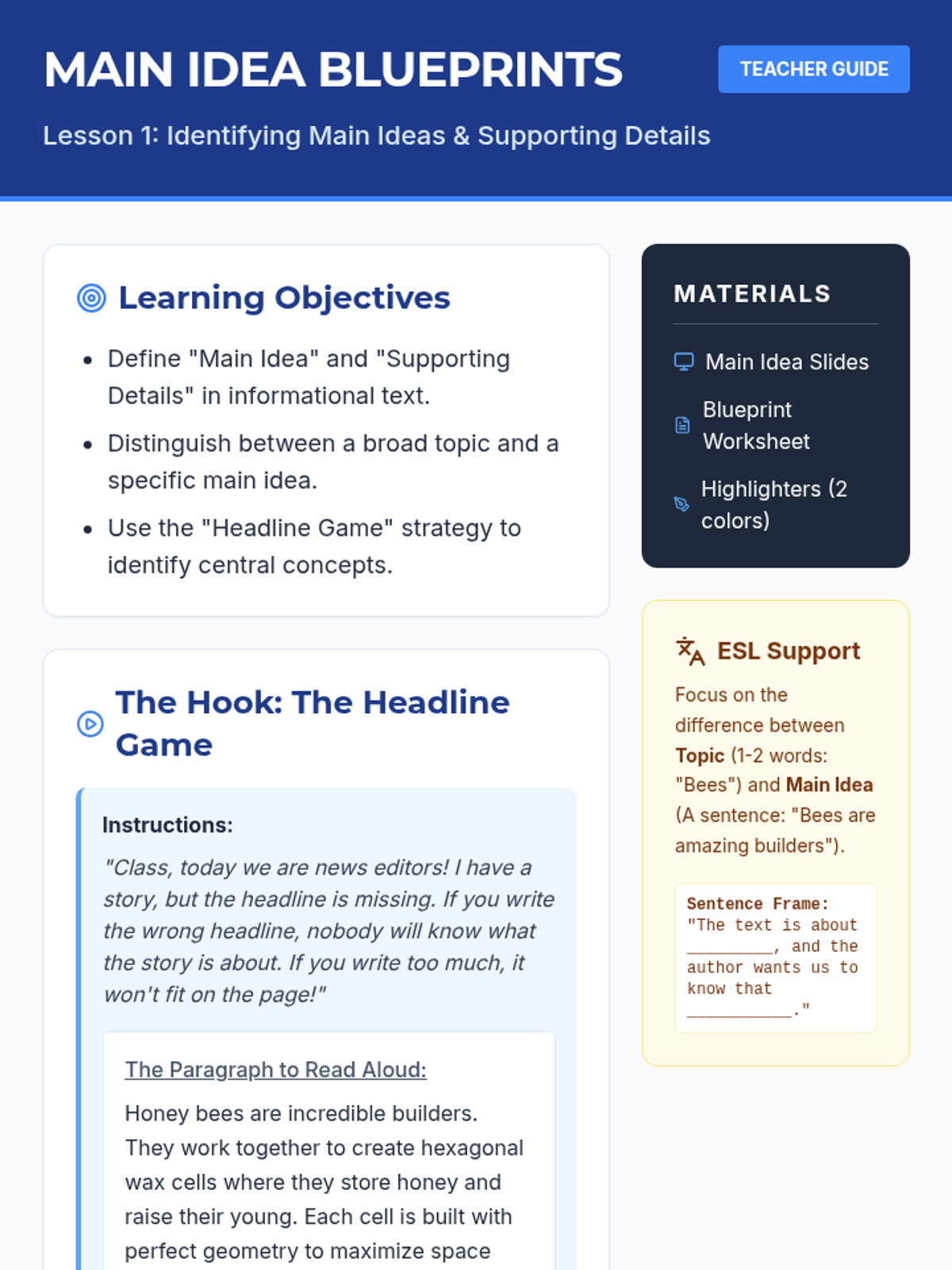 A comprehensive workshop-style unit for 6th Grade ESL students focused on the linguistic mechanics of paraphrasing and synthesizing information. Students move from identifying core concepts to orally retelling information, transforming individual sentences, and finally weaving multiple sources into a single coherent paragraph without plagiarizing.