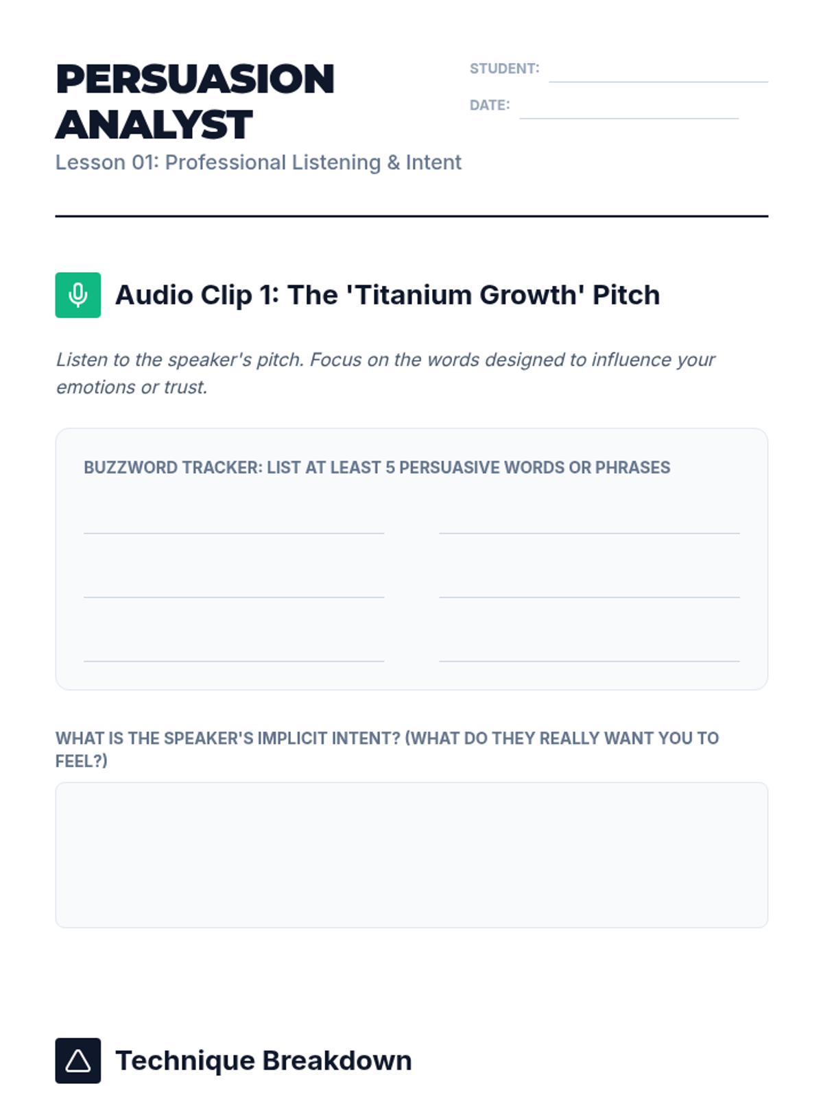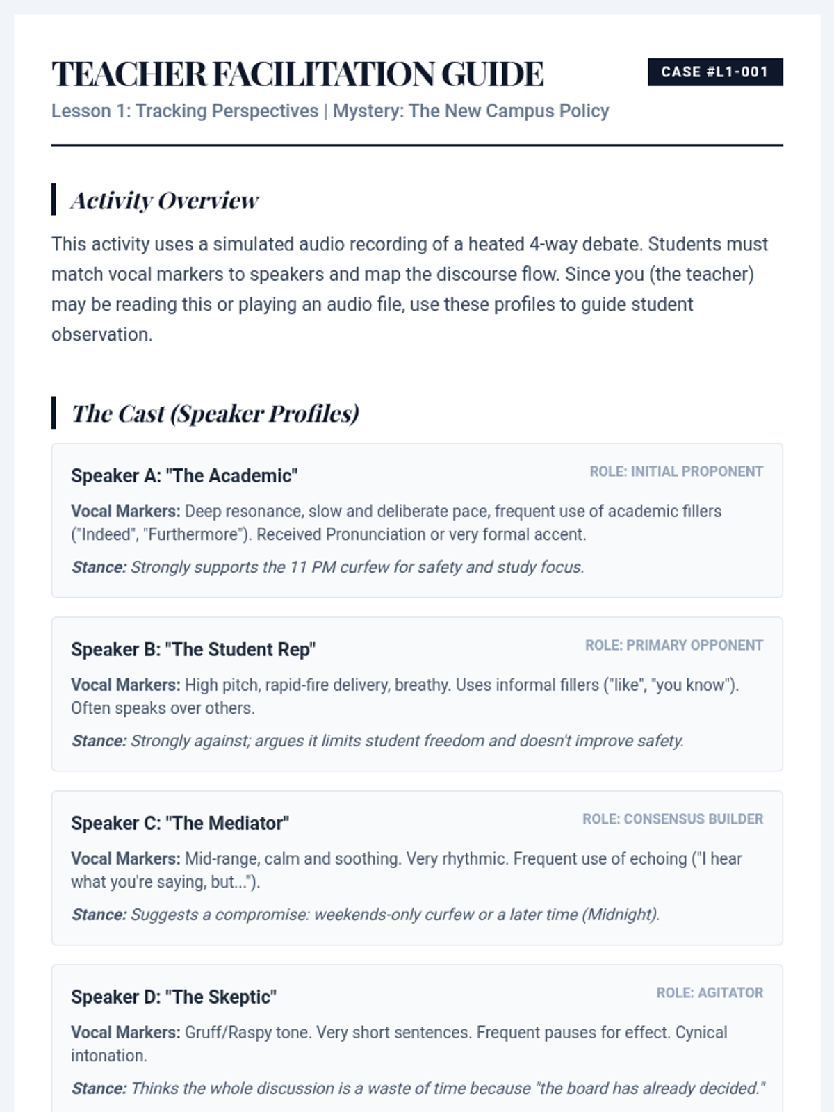 This sequence equips intermediate ESL undergraduate students with the skills to navigate complex, multi-speaker environments like seminars and debates. Students progress from basic speaker identification to tracking complex argument evolution and detecting subtle bias markers.
