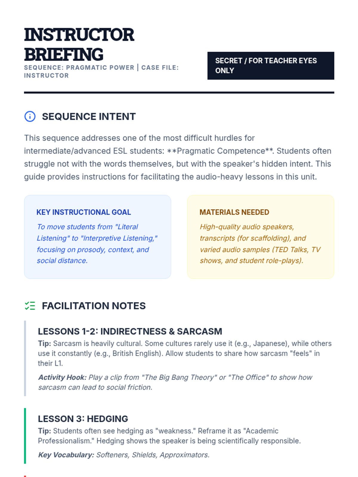 This sequence guides intermediate ESL students through the nuances of pragmatic meaning in English. Students will learn to decode indirect speech, sarcasm, hedging language, and emotional undertones in academic and social contexts to improve their listening comprehension and communicative competence.