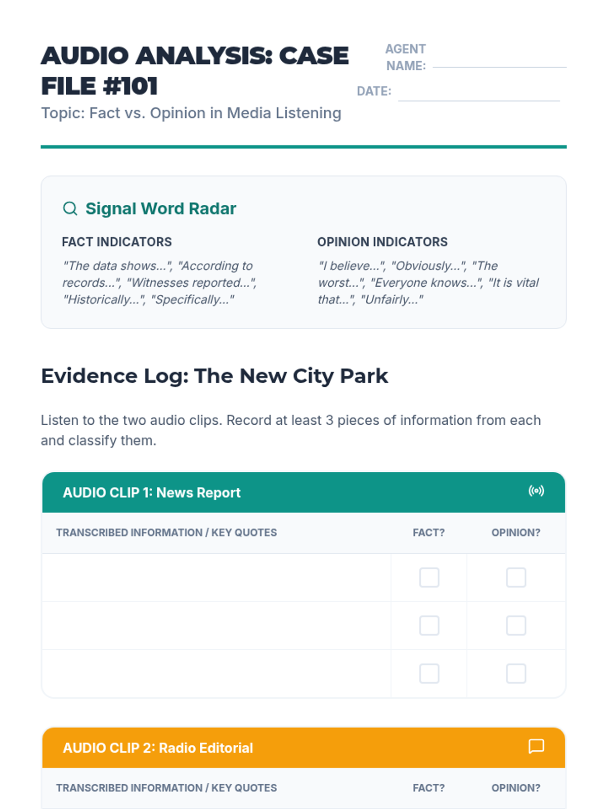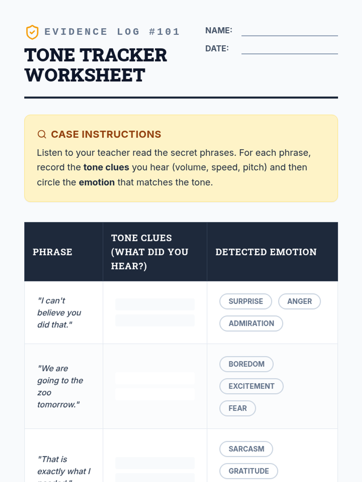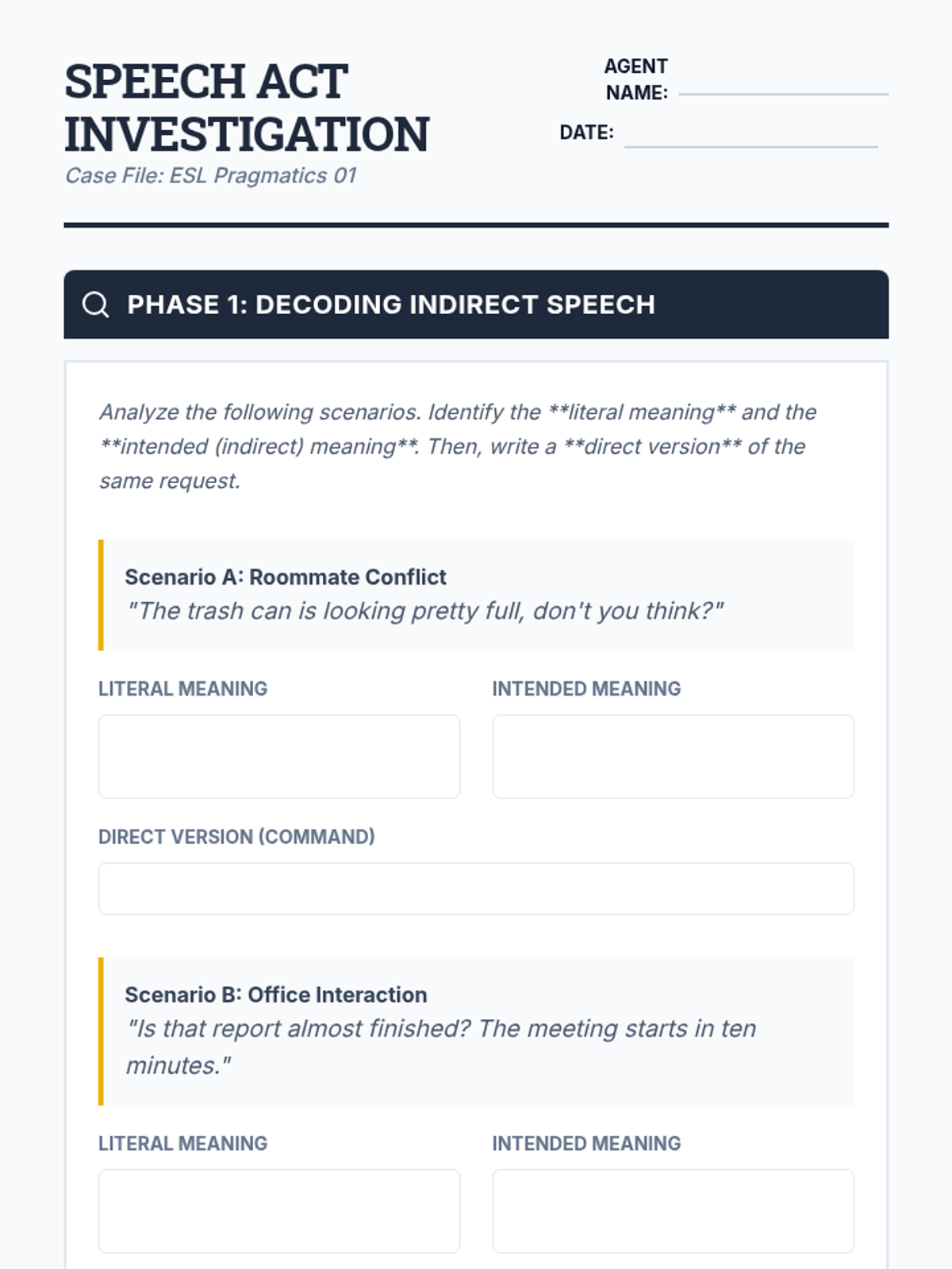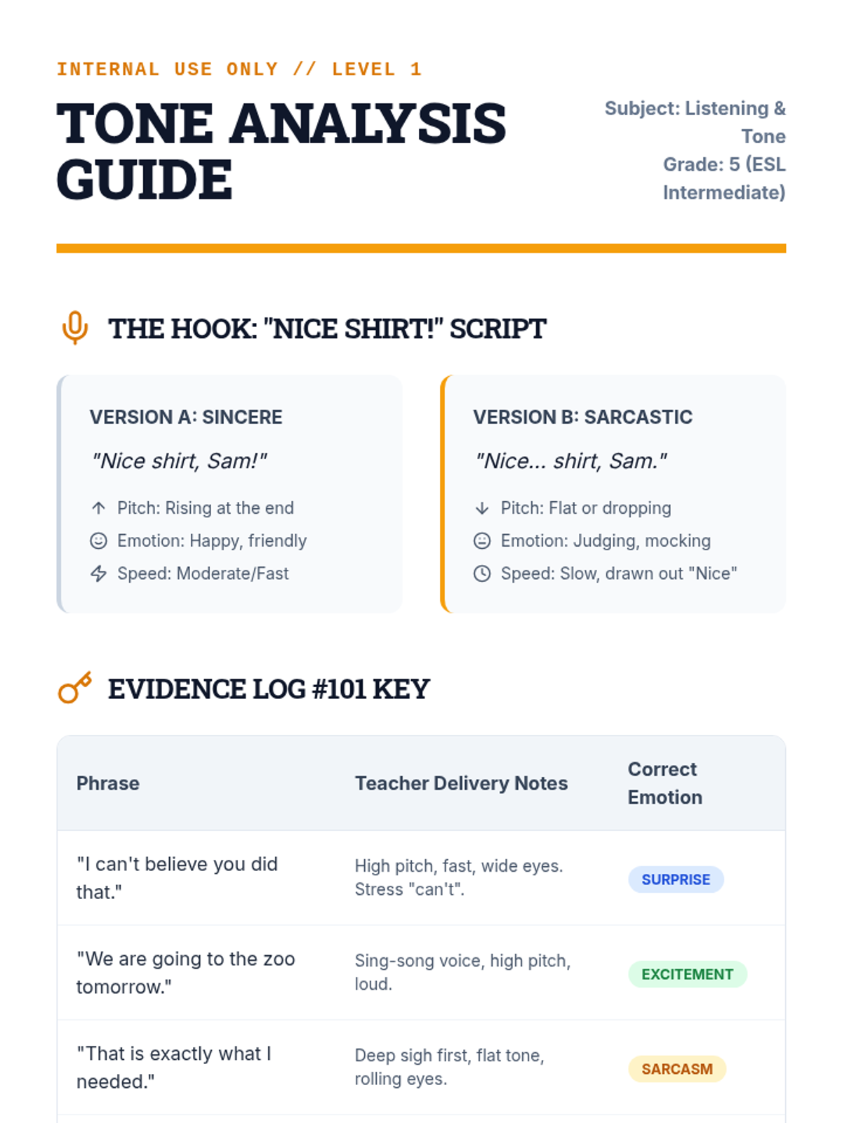 An intermediate ESL sequence where students act as 'communication detectives' to analyze tone, idioms, exaggeration, and speaker intent in spoken English. The sequence culminates in a mystery simulation requiring students to synthesize all listening skills to solve a case.