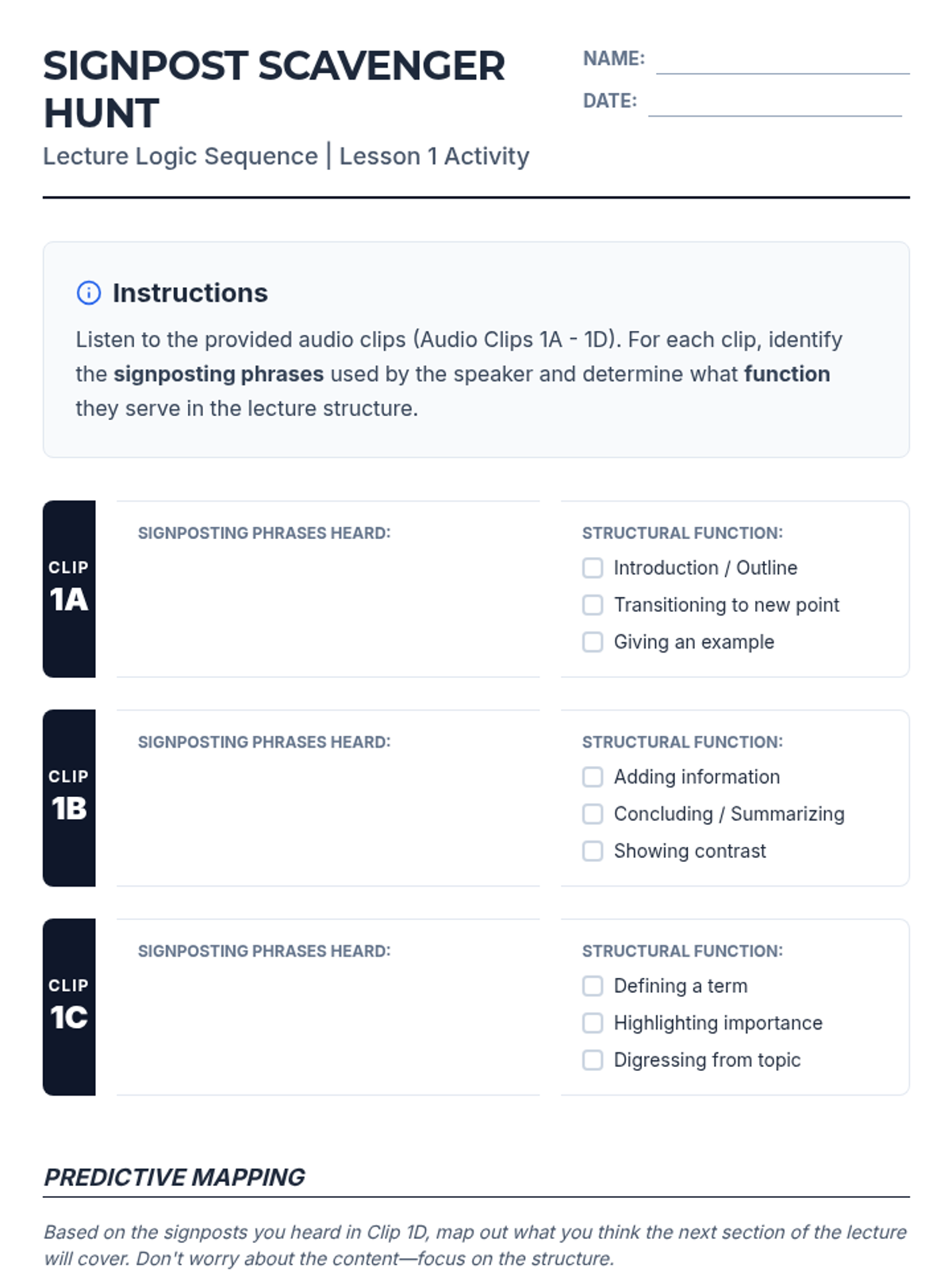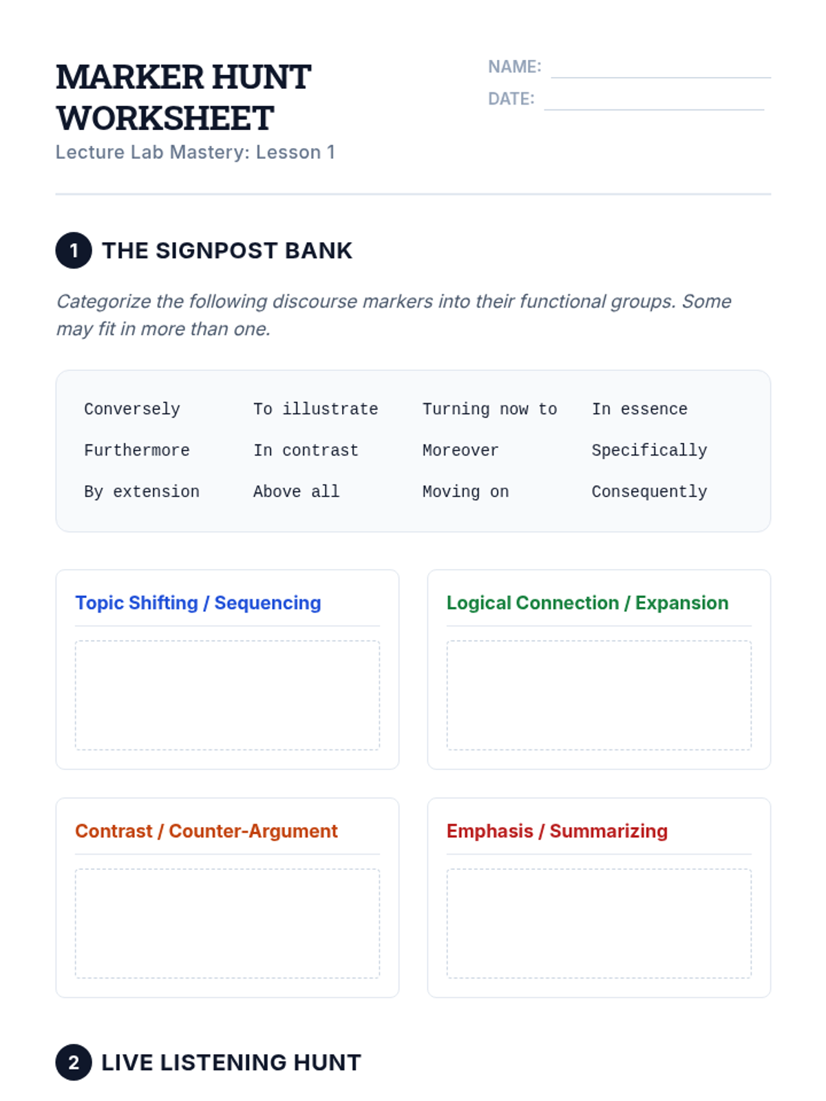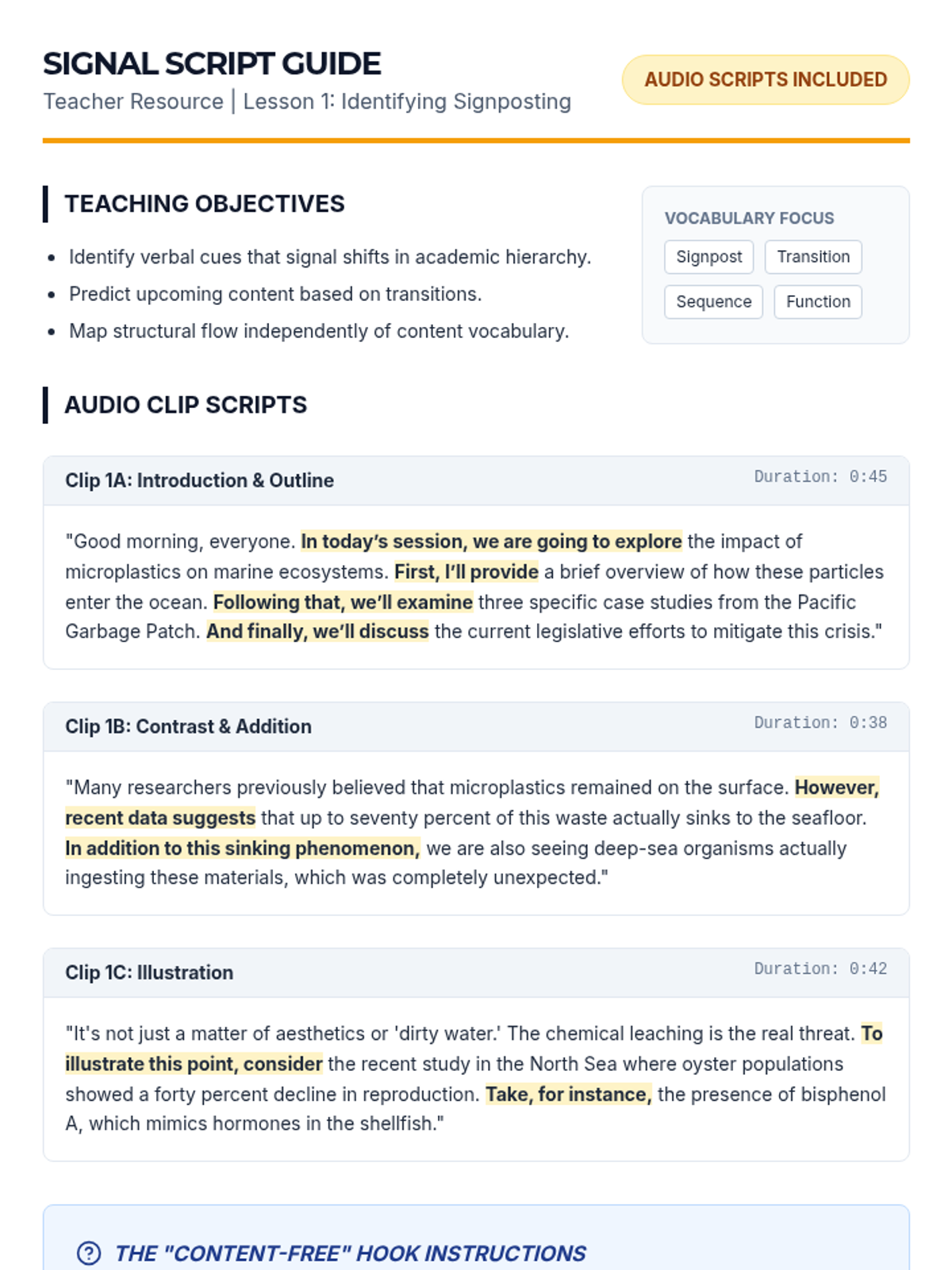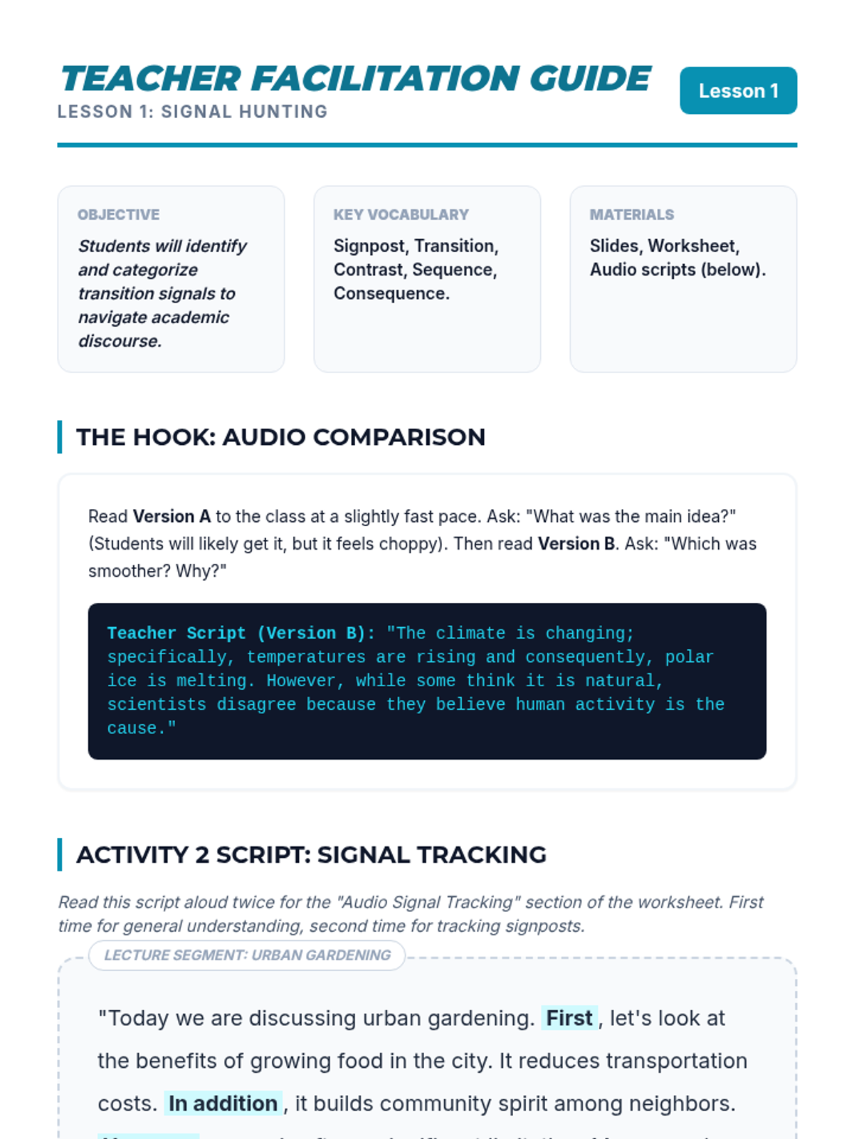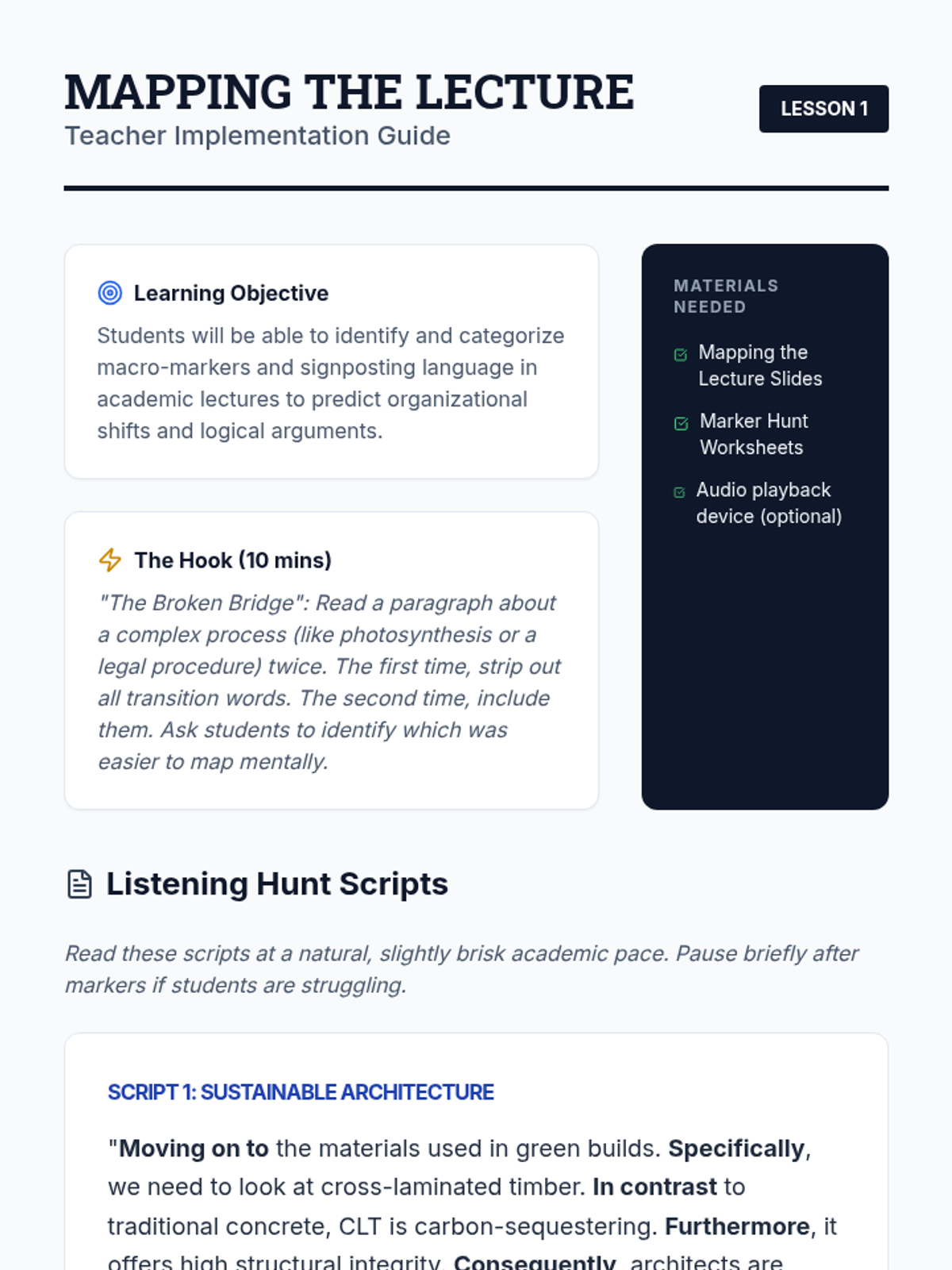 This sequence equips intermediate ESL students with the linguistic and cognitive tools needed to navigate university lectures. It covers discourse markers, hierarchy of information, identifying tangents, note-taking systems, and synthesizing long-form academic speech.