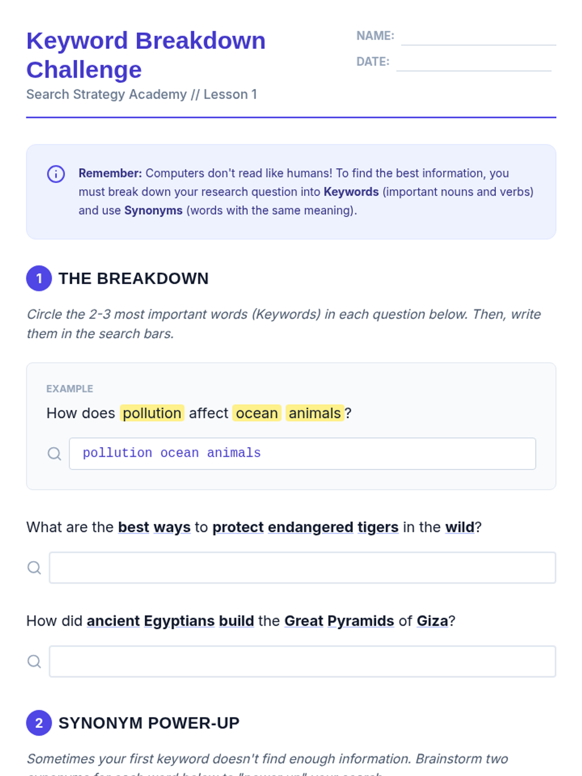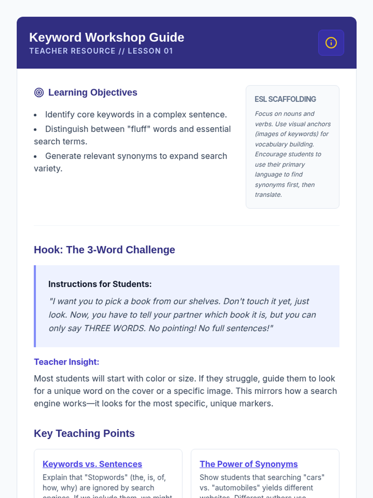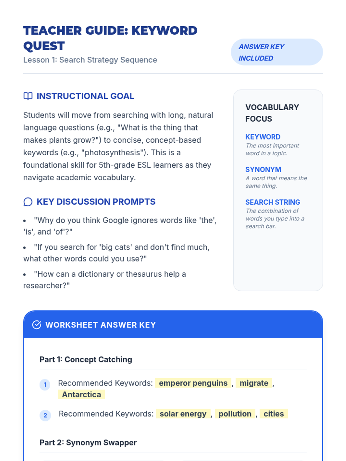 A 5-lesson unit for 6th-grade ESL students focused on transforming search habits from natural language questions to strategic keyword and Boolean operator techniques. Students move from basic vocabulary brainstorming to navigating academic databases and skimming snippets for relevance.