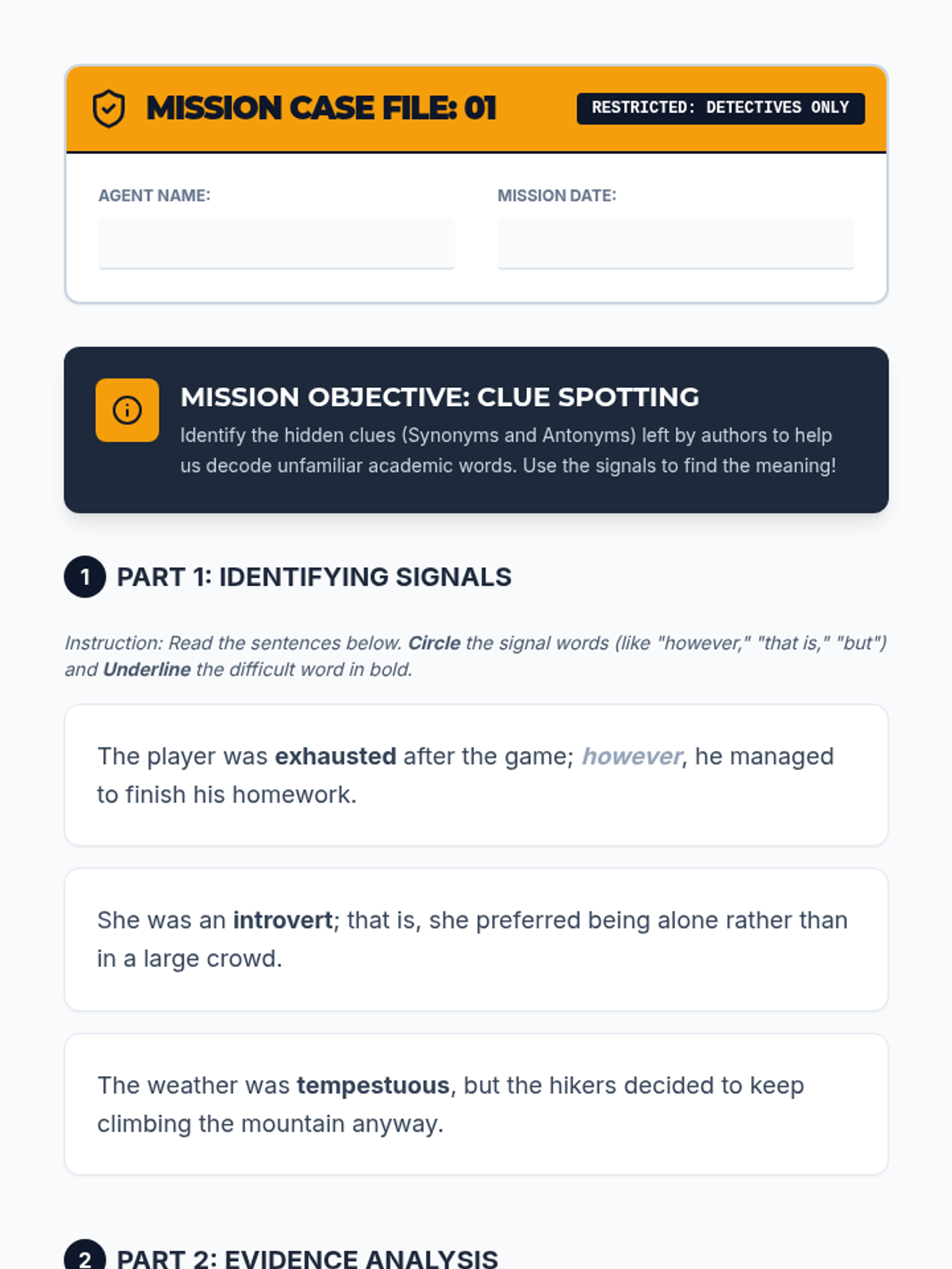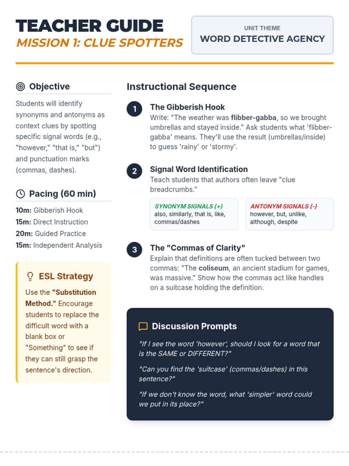 A sequence designed for 7th-grade ESL students to master the art of inferring unknown academic vocabulary through context clues, morphology, syntax, and tone analysis. This unit transforms vocabulary gaps from roadblocks into solvable puzzles using a "Word Detective" theme.