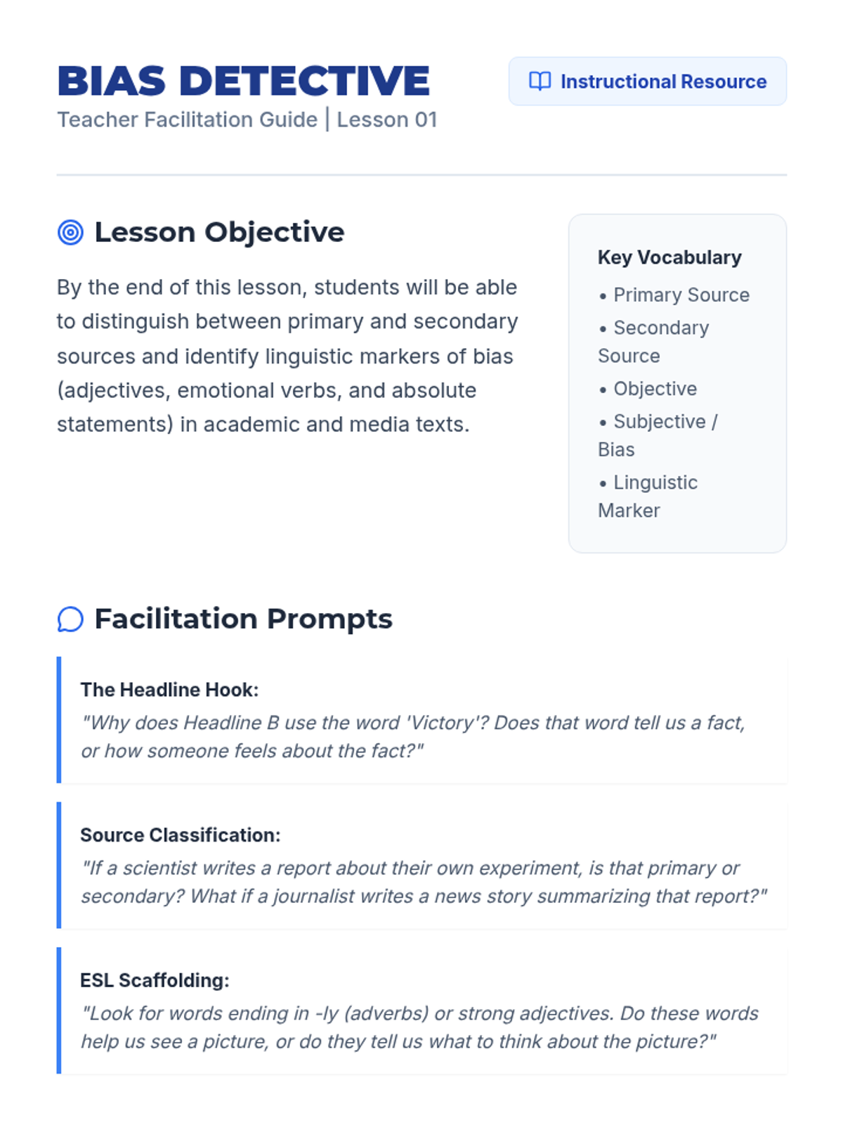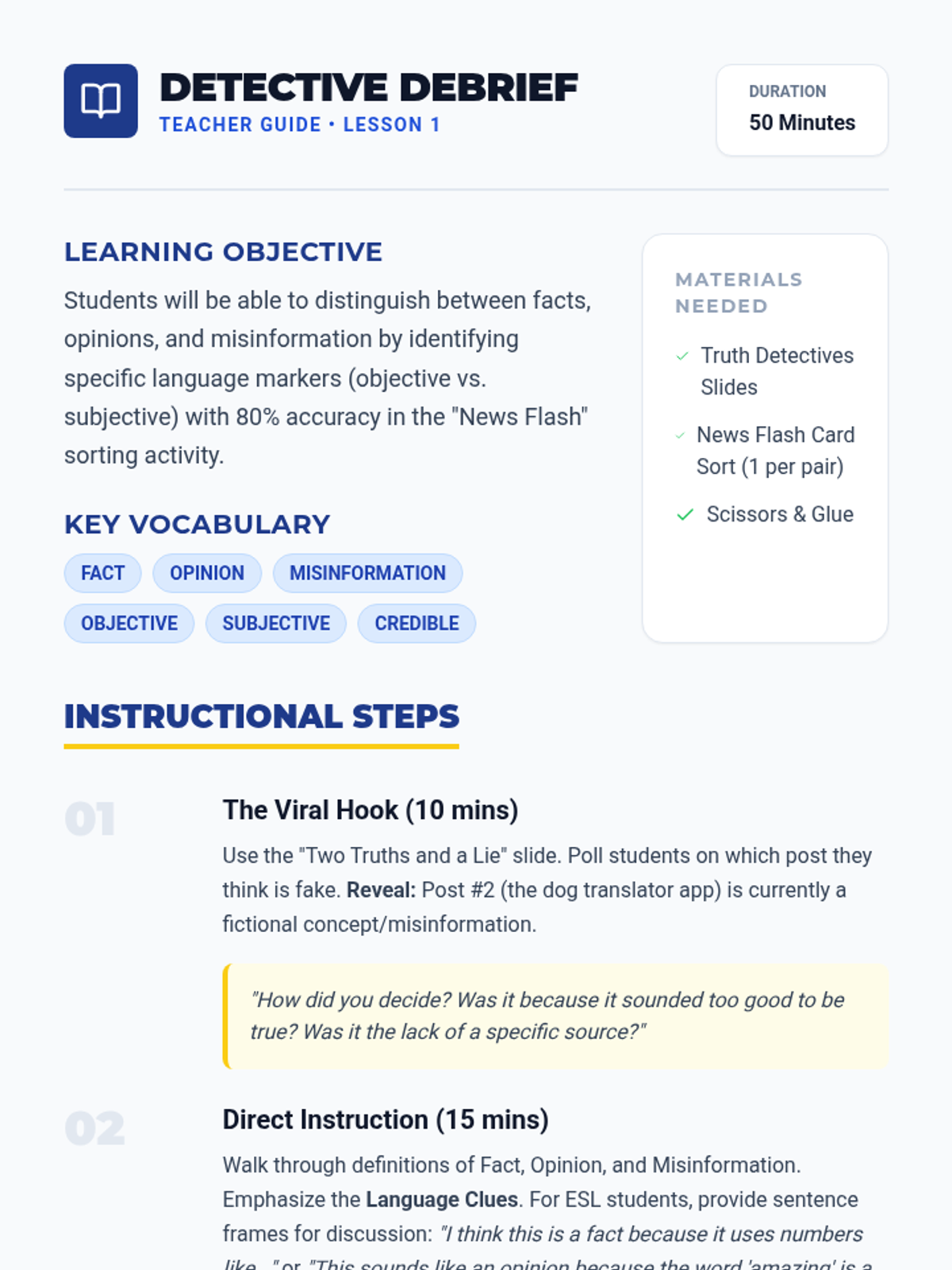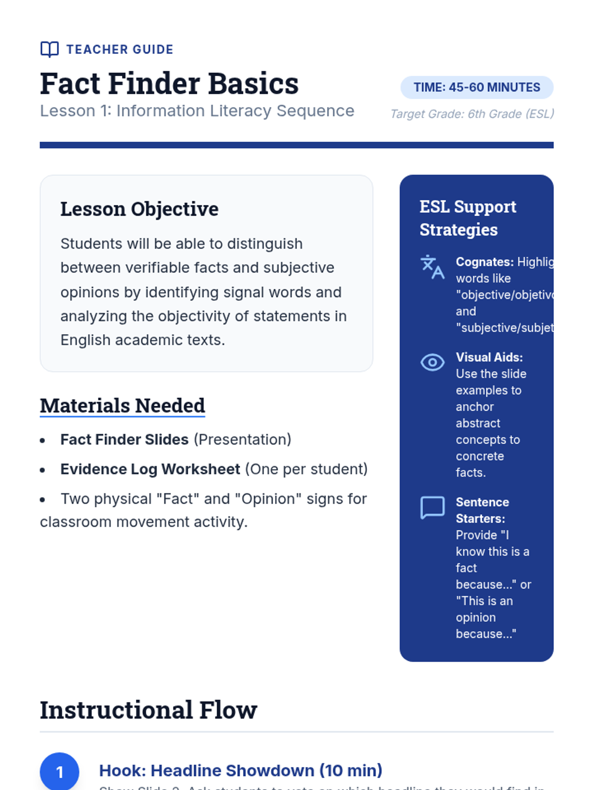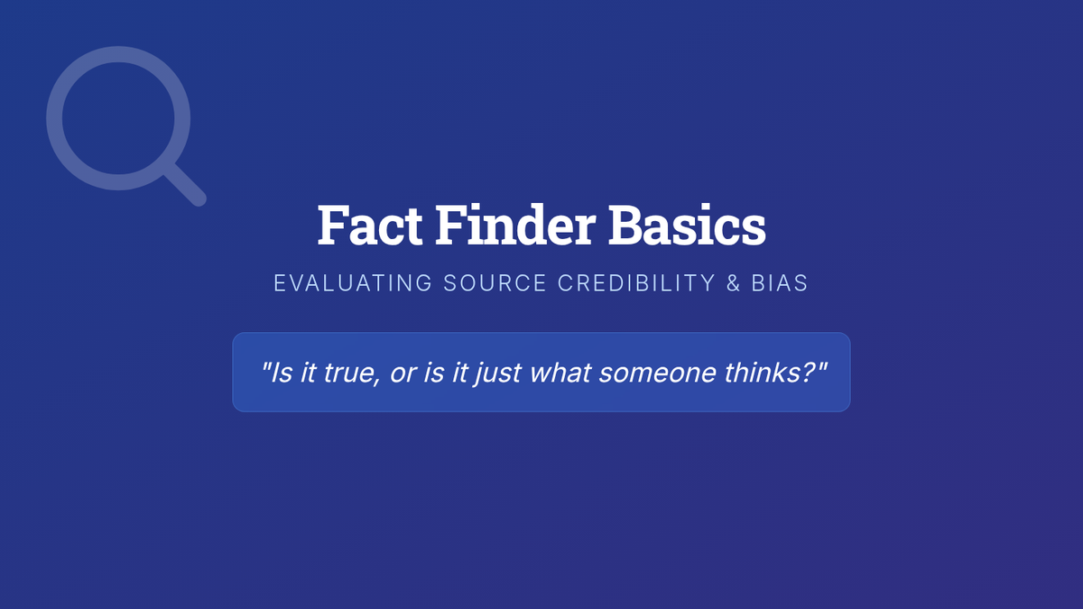 A comprehensive sequence for 6th Grade ESL students to develop critical research and information literacy skills. Students progress from distinguishing basic facts and opinions to applying professional evaluation frameworks like the CRAAP test to determine source credibility.