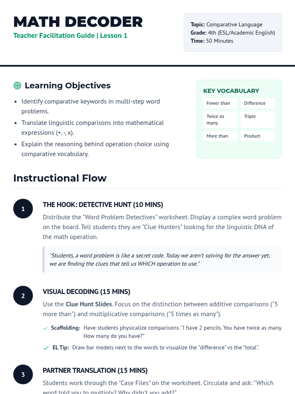 This sequence helps 4th Grade ESL students master academic language for math and social studies, focusing on comparative grammar, superlatives, evidence-based justification, and contrastive discourse. Students move from decoding word problems to participating in a structured academic debate.