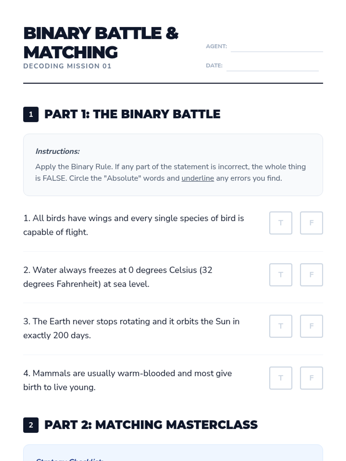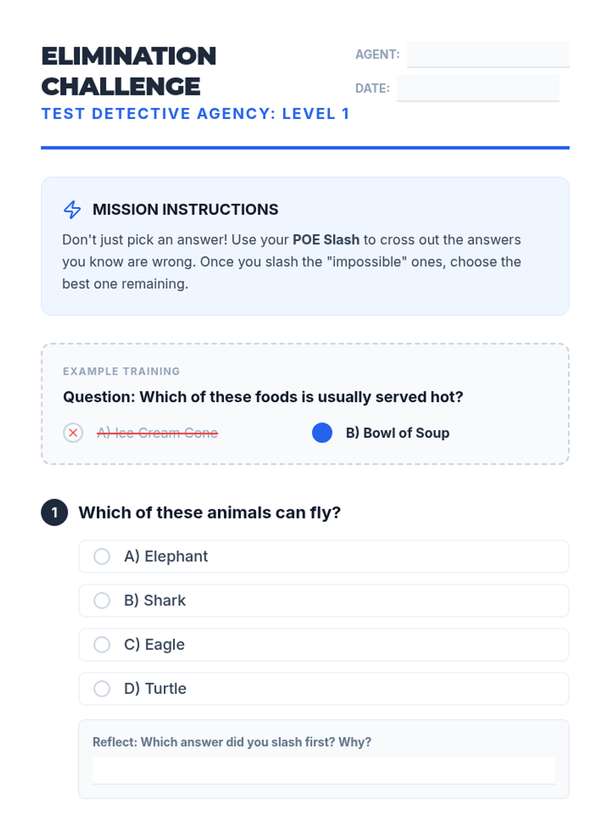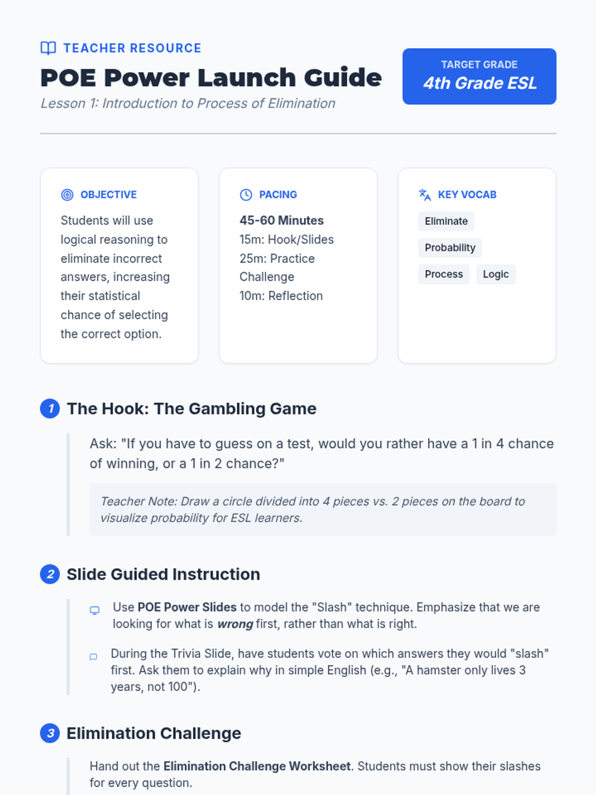 A comprehensive sequence for 4th Grade ESL students to master test-taking logic. Students learn the Process of Elimination (POE), identify extreme language red flags, categorize common distractor types, and evaluate the 'best' vs. 'correct' answers, culminating in a creative workshop where they design their own distractors.