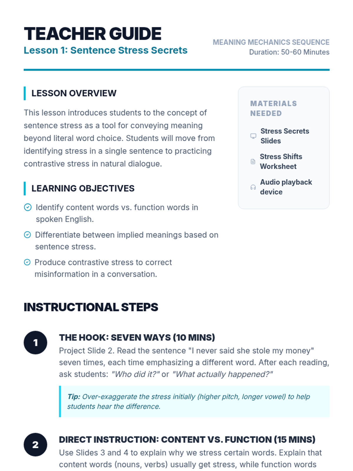 This sequence guides intermediate ESL students through the complexities of spoken English, moving from basic sentence stress to the nuances of sarcasm, idioms, and academic signposting. Students will develop the ability to infer speaker intent and respond appropriately in real-world scenarios.