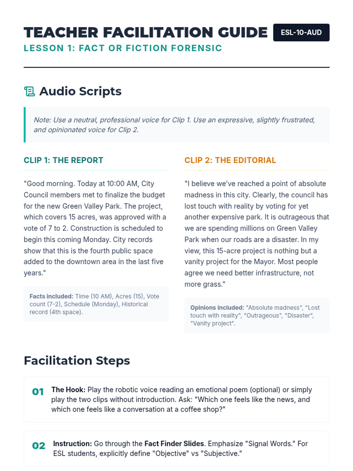A comprehensive unit for 4th Grade ESL learners to master academic listening. Students transition from social conversation to processing informational texts by identifying signal words, capturing vocabulary definitions in context, using graphic organizers, and distinguishing fact from opinion to synthesize complex information.