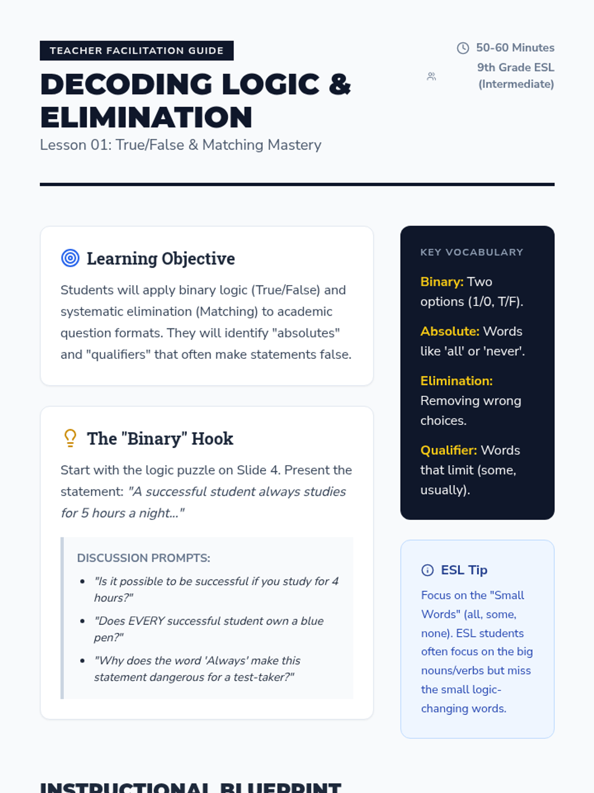 A comprehensive 9th Grade ESL sequence focusing on academic test-taking strategies. Students learn to decode diverse question formats, from True/False logic to data interpretation, using a workshop-based 'Test Decoder' approach.
