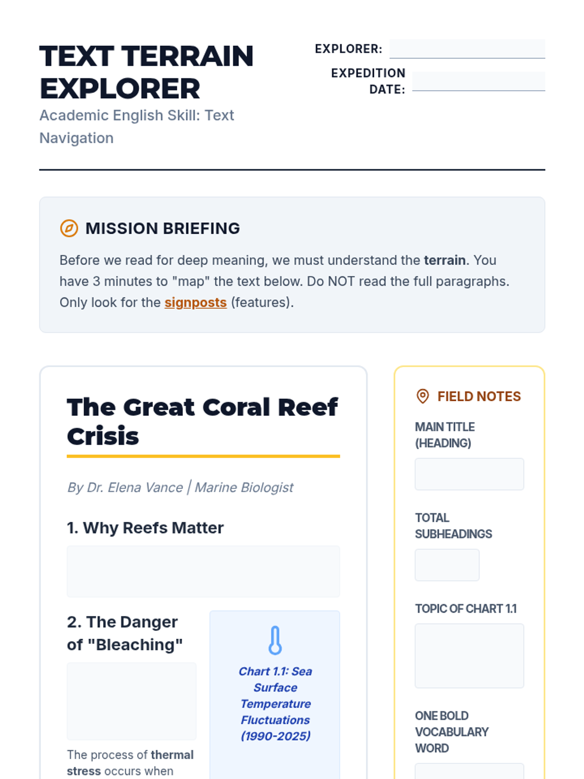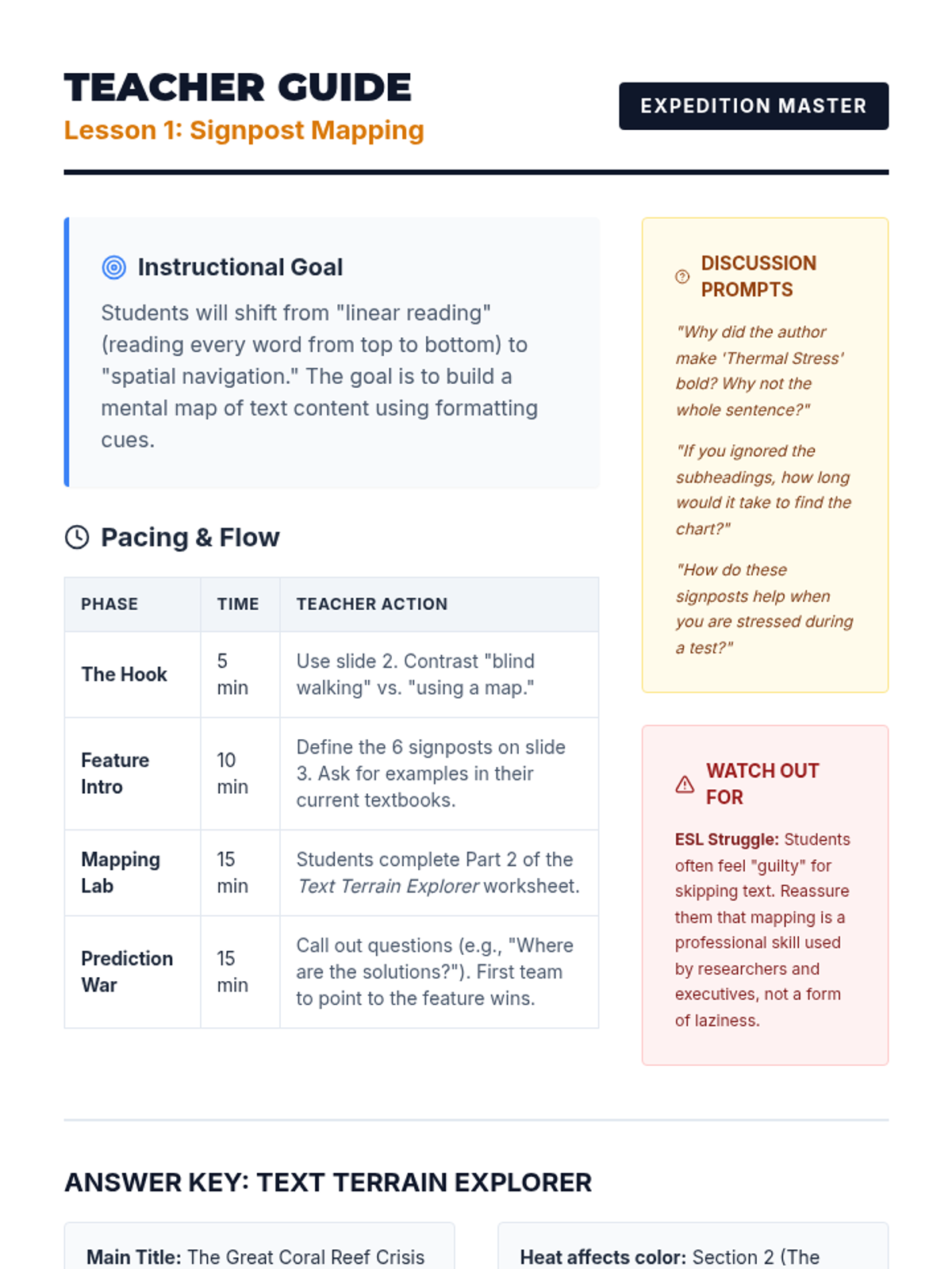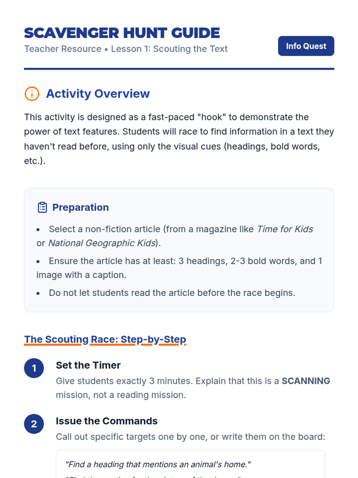 A comprehensive sequence for 10th-grade ESL students focusing on academic text navigation. Students learn to use text features, skimming, scanning, and transition words to retrieve information rapidly and accurately, culminating in a timed retrieval challenge.