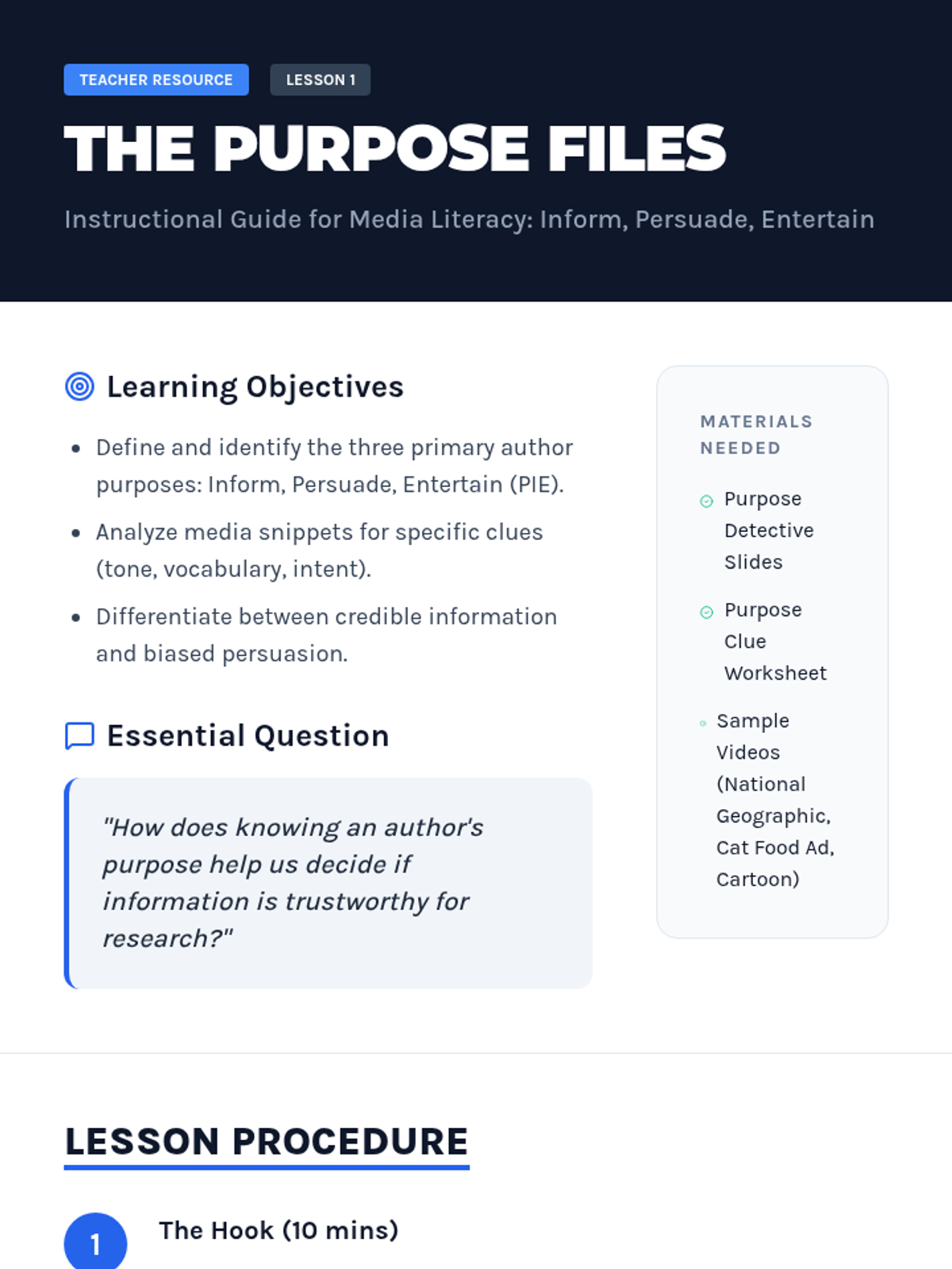 A 5-lesson sequence for 5th-grade ESL students to develop media literacy and research skills. Students learn to distinguish author purpose, evaluate website credibility using the 5 W's, identify bias, and corroborate information across multiple sources.