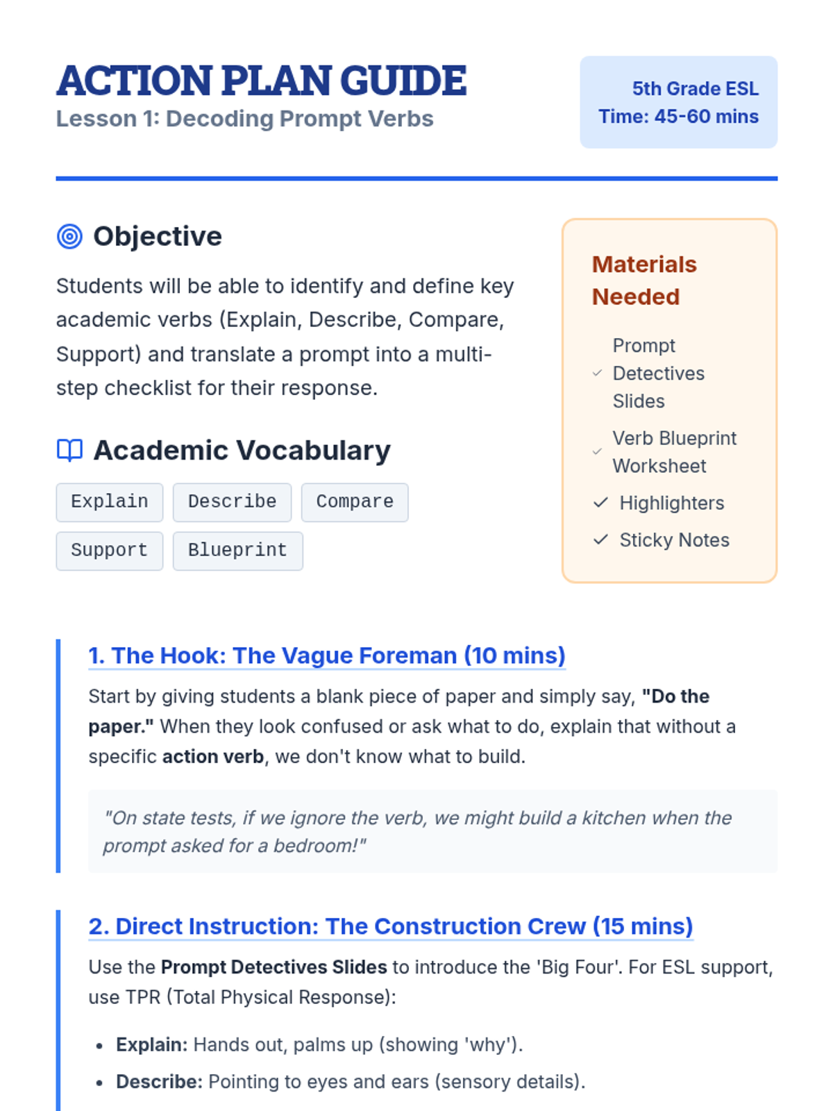 A 5-lesson sequence for 5th-grade ESL students focused on the R.A.C.E. strategy for constructing high-scoring, evidence-based written responses on academic assessments. Students progress from decoding prompt verbs to mastering restatement, evidence citation, and explanation through a 'blueprint and construction' theme.