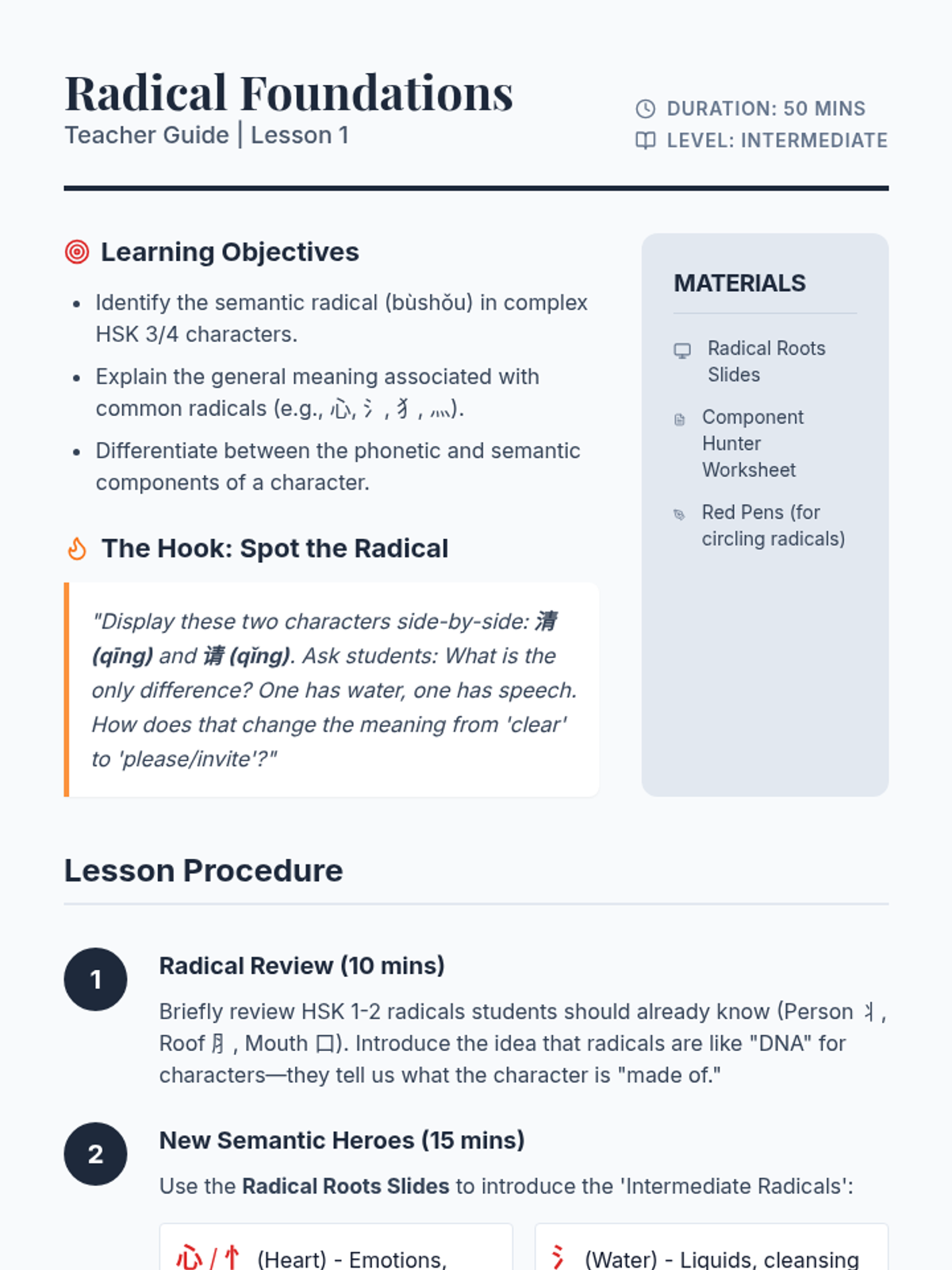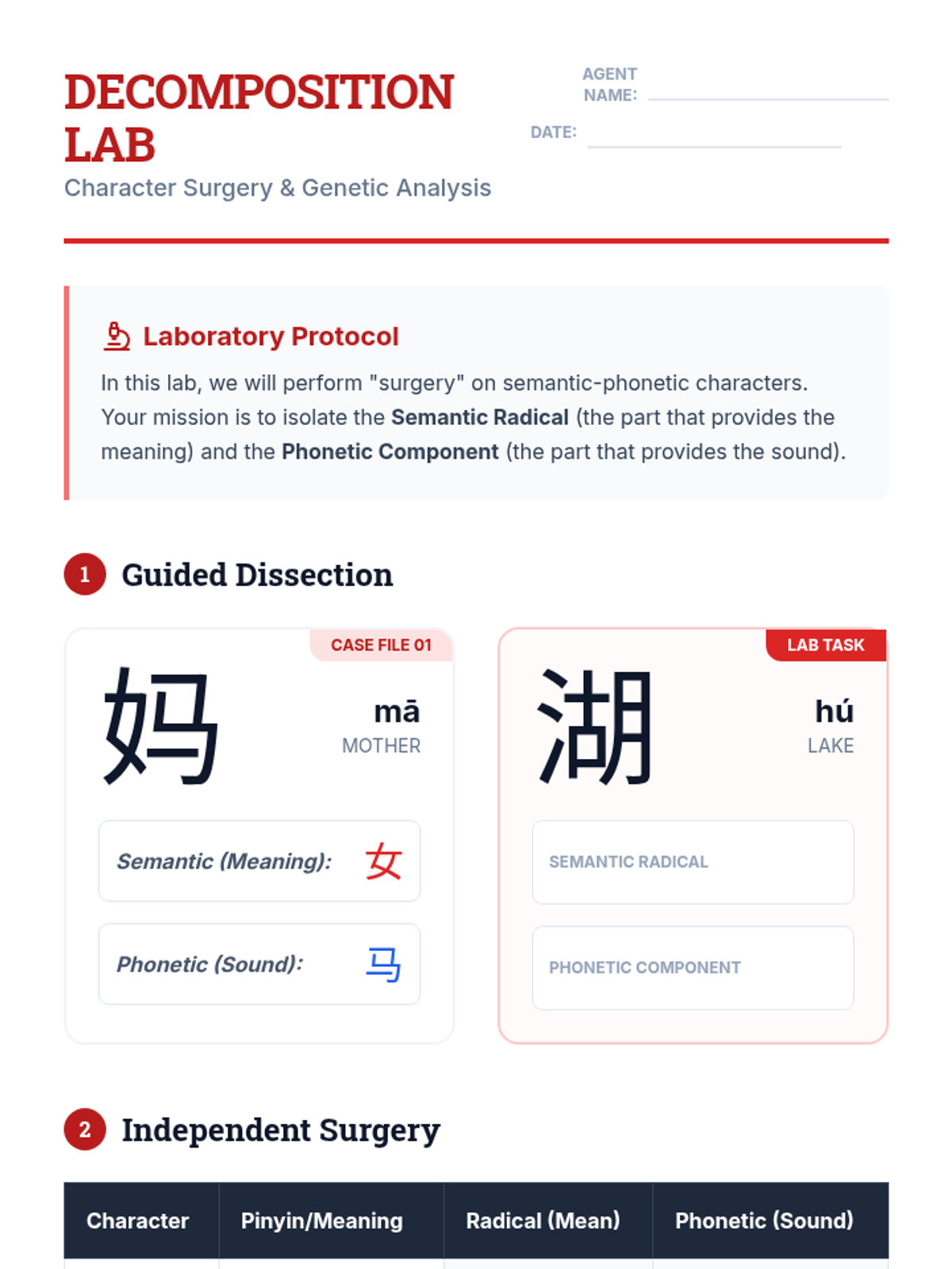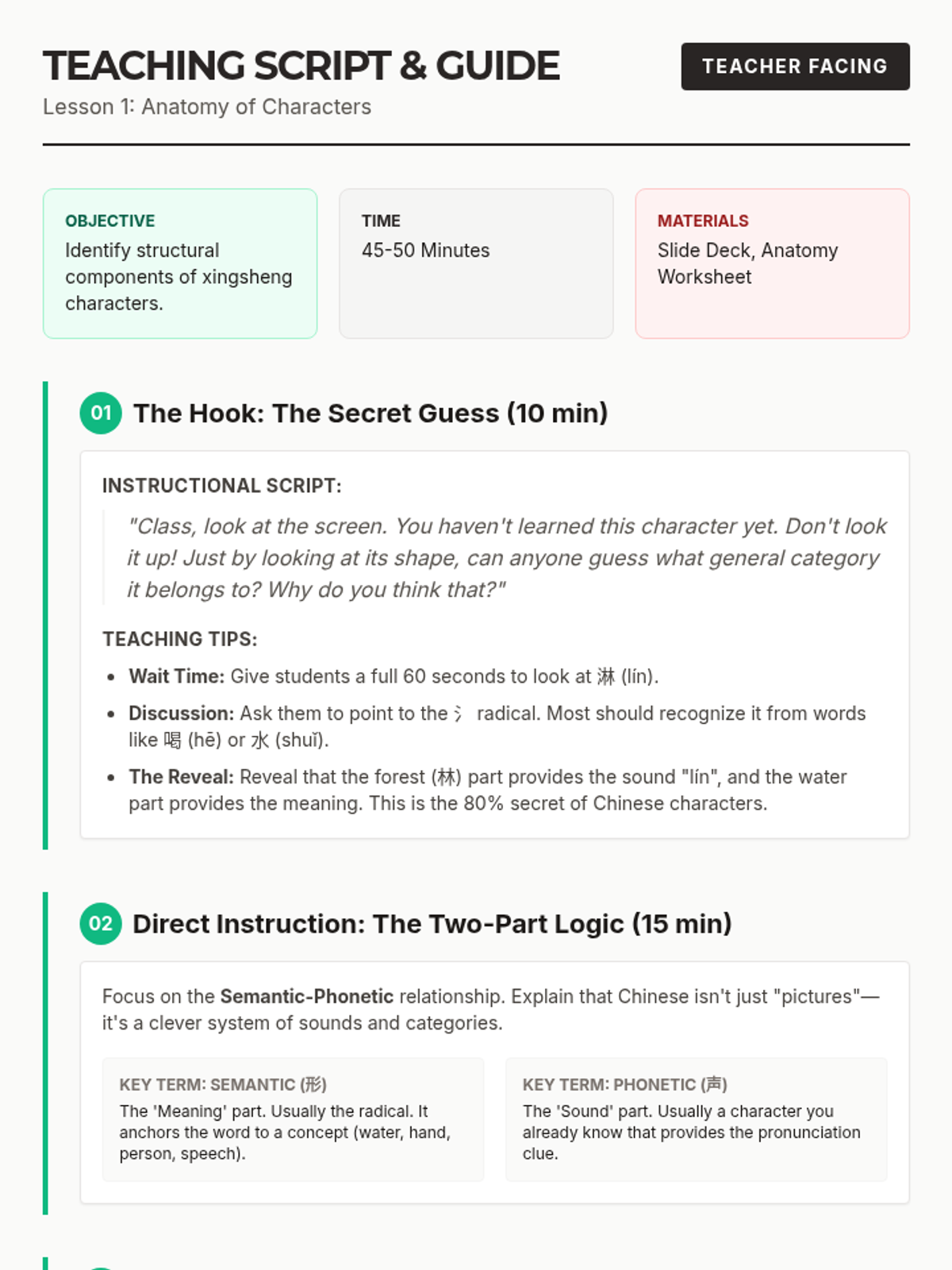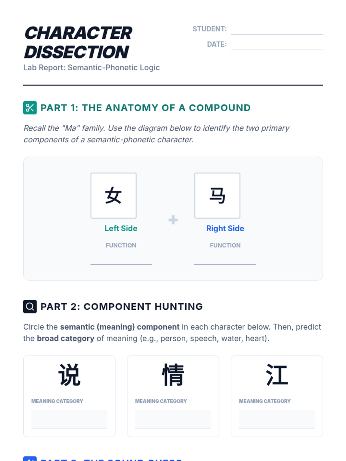 This inquiry-based sequence demystifies the structure of semantic-phonetic characters, which make up the vast majority of the Chinese writing system. Students move from rote memorization to analytical decoding by identifying the 'meaning' component (radical) and the 'sound' component (phonetic) within intermediate-level characters.