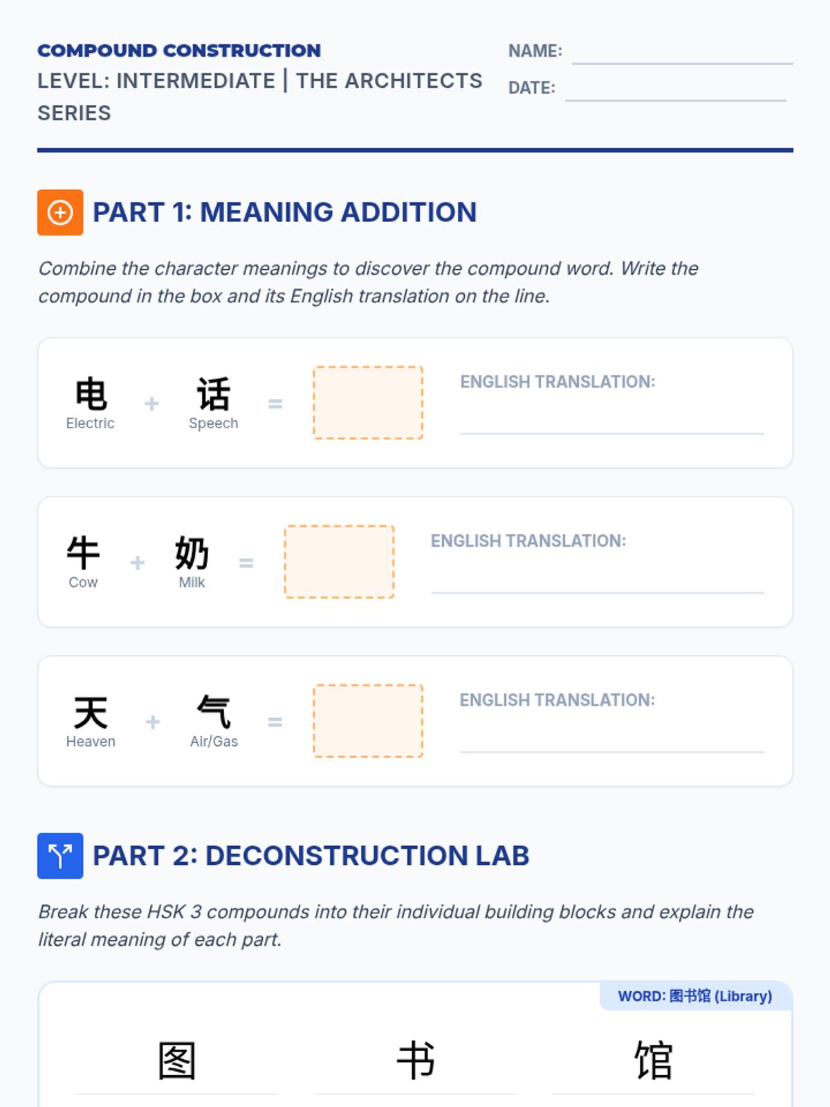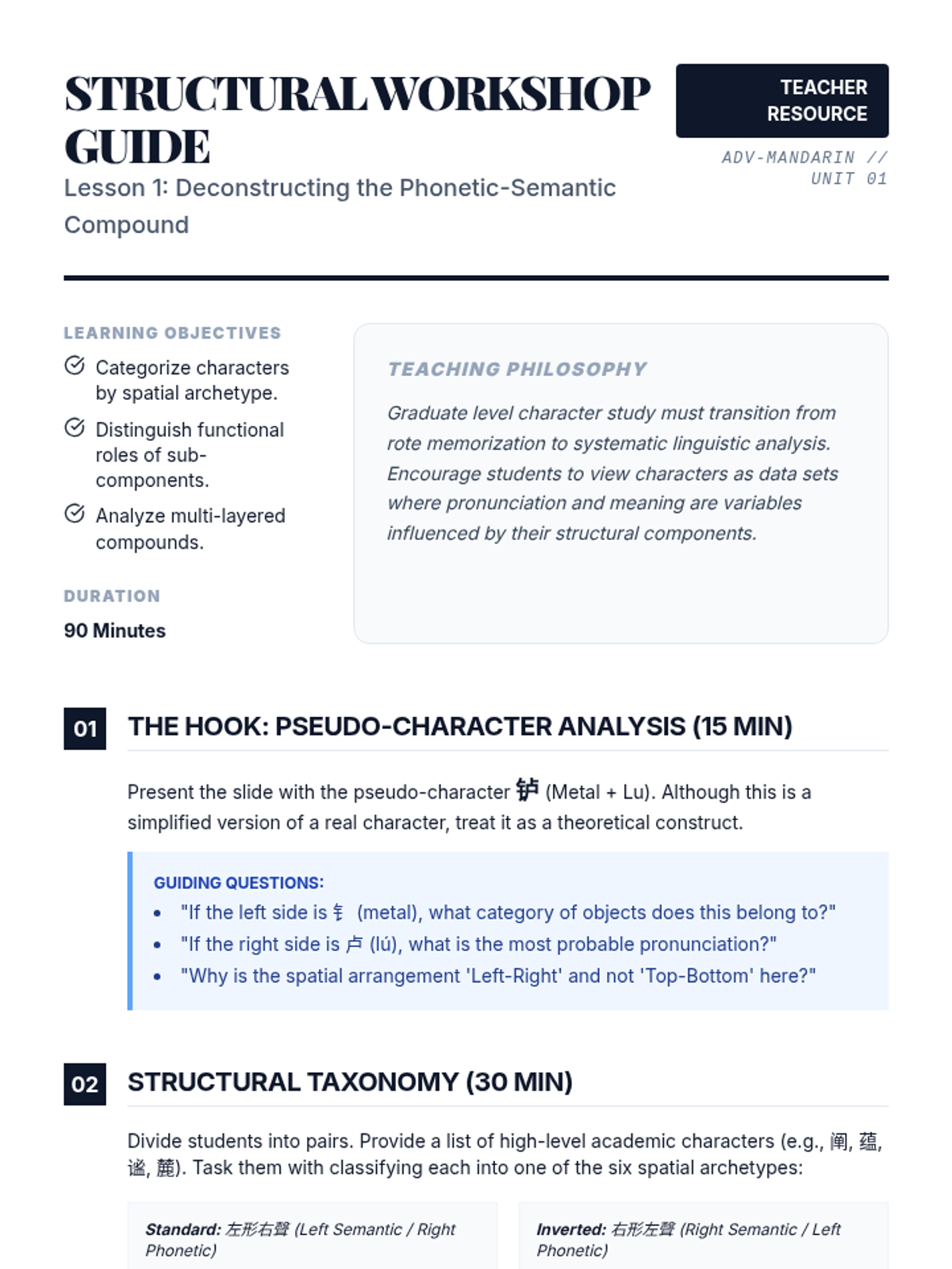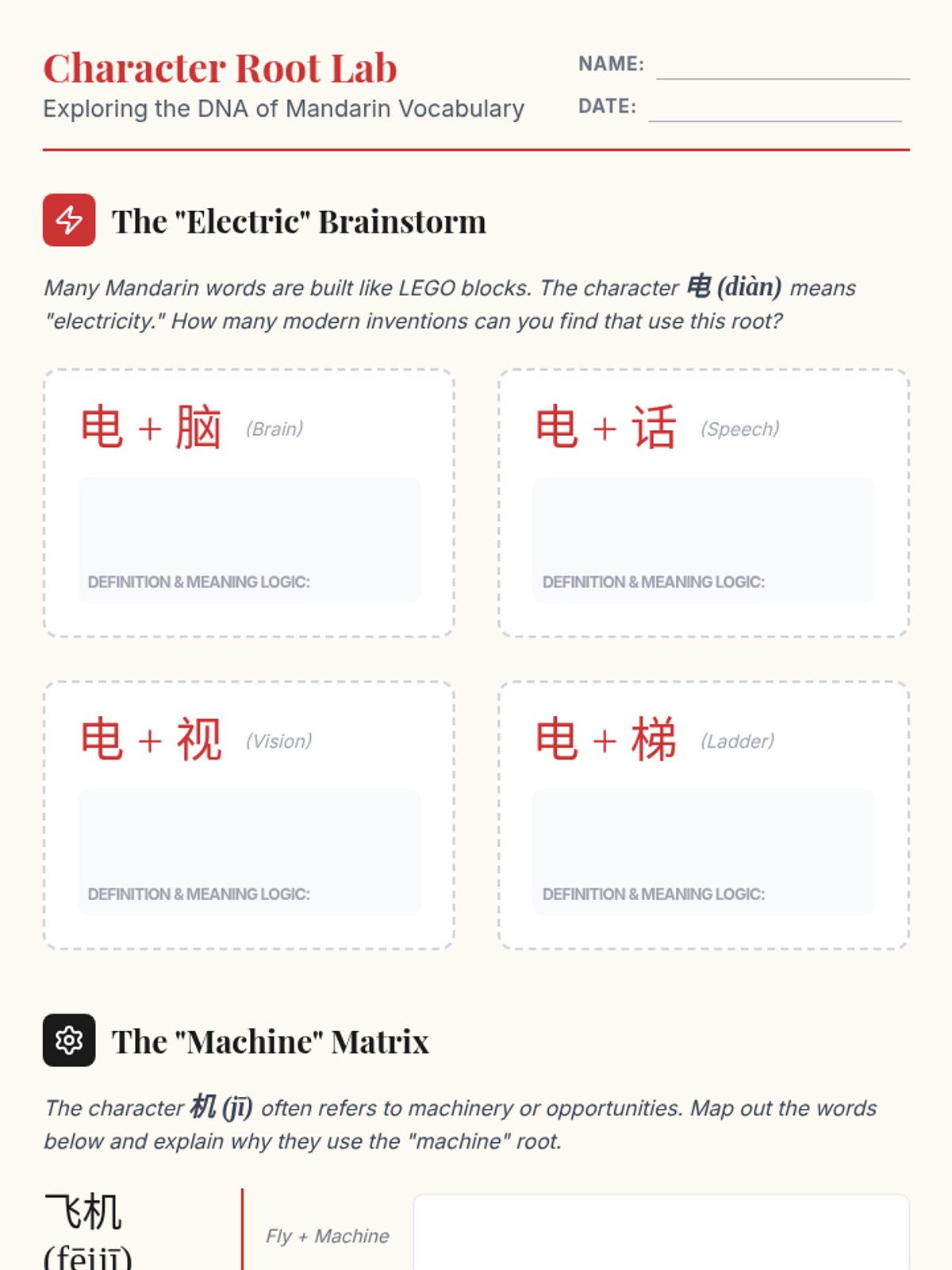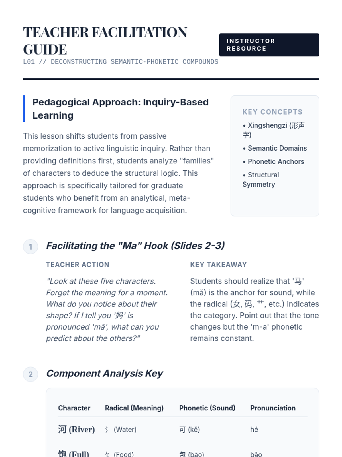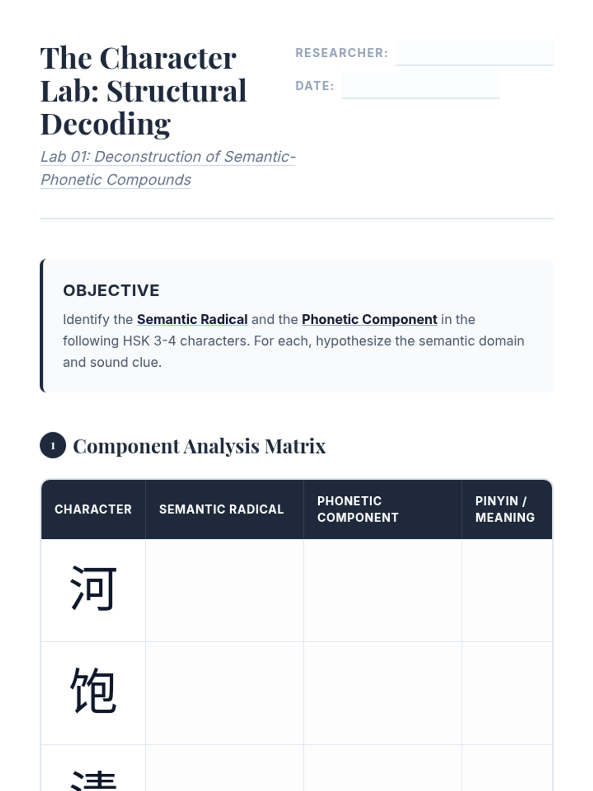 This inquiry-based sequence demystifies the structure of semantic-phonetic characters, which make up the vast majority of the Chinese writing system. Students move from rote memorization to analytical decoding by identifying the 'meaning' component (radical) and the 'sound' component (phonetic) within intermediate-level characters.