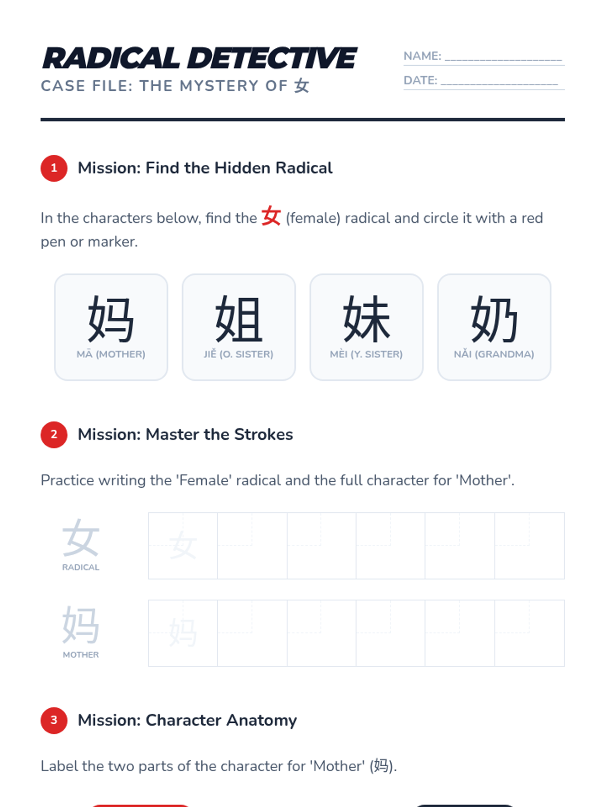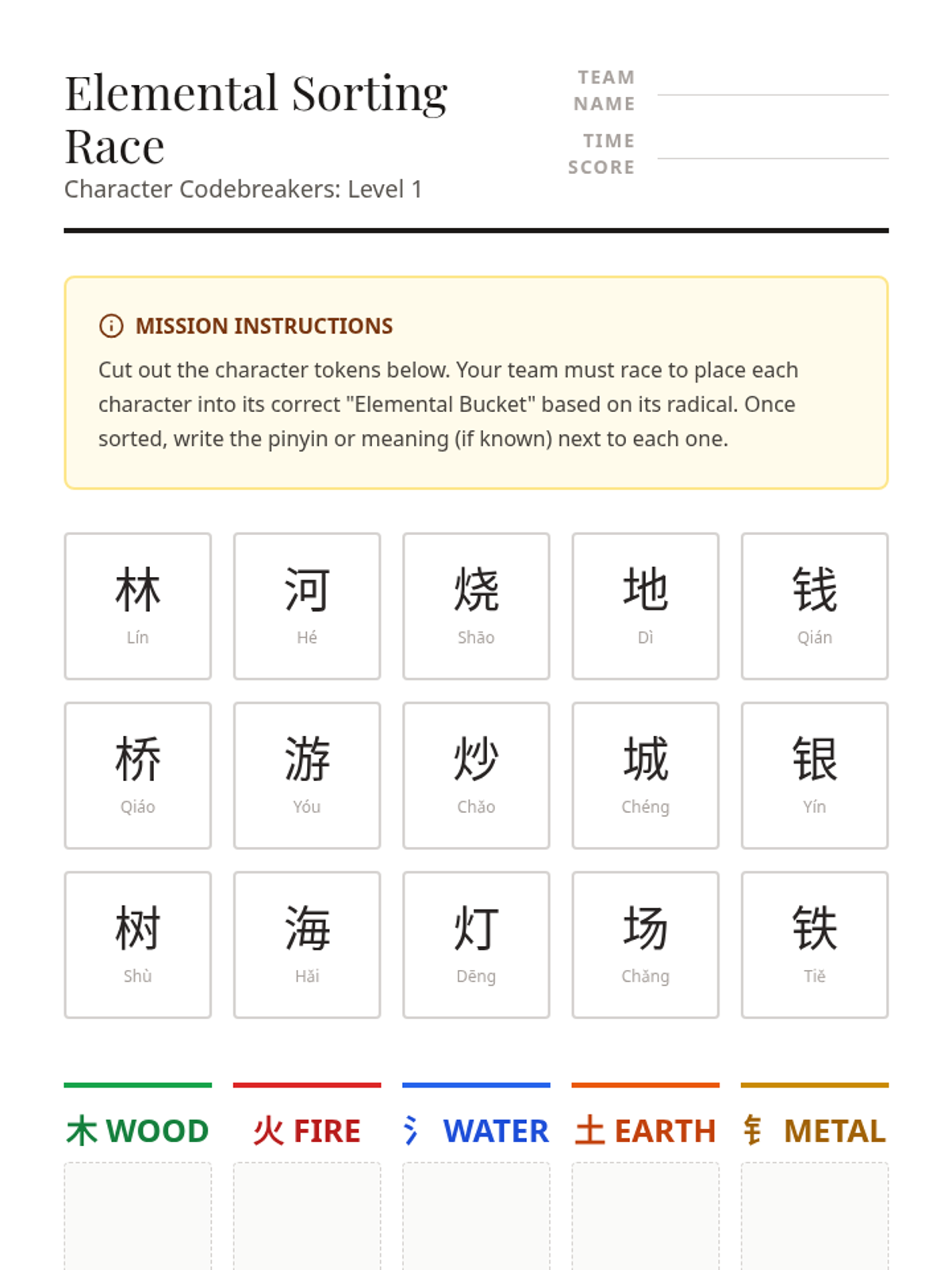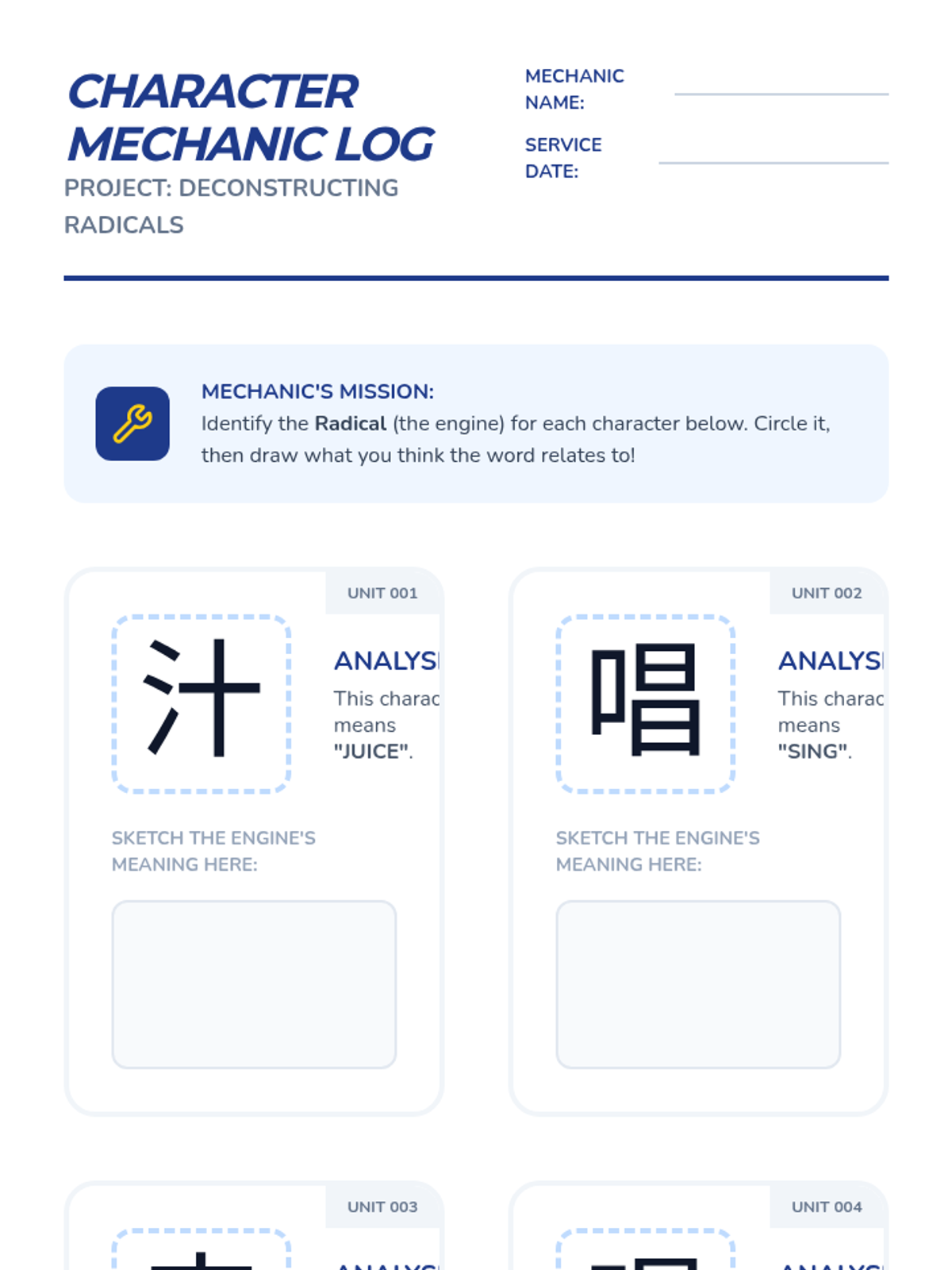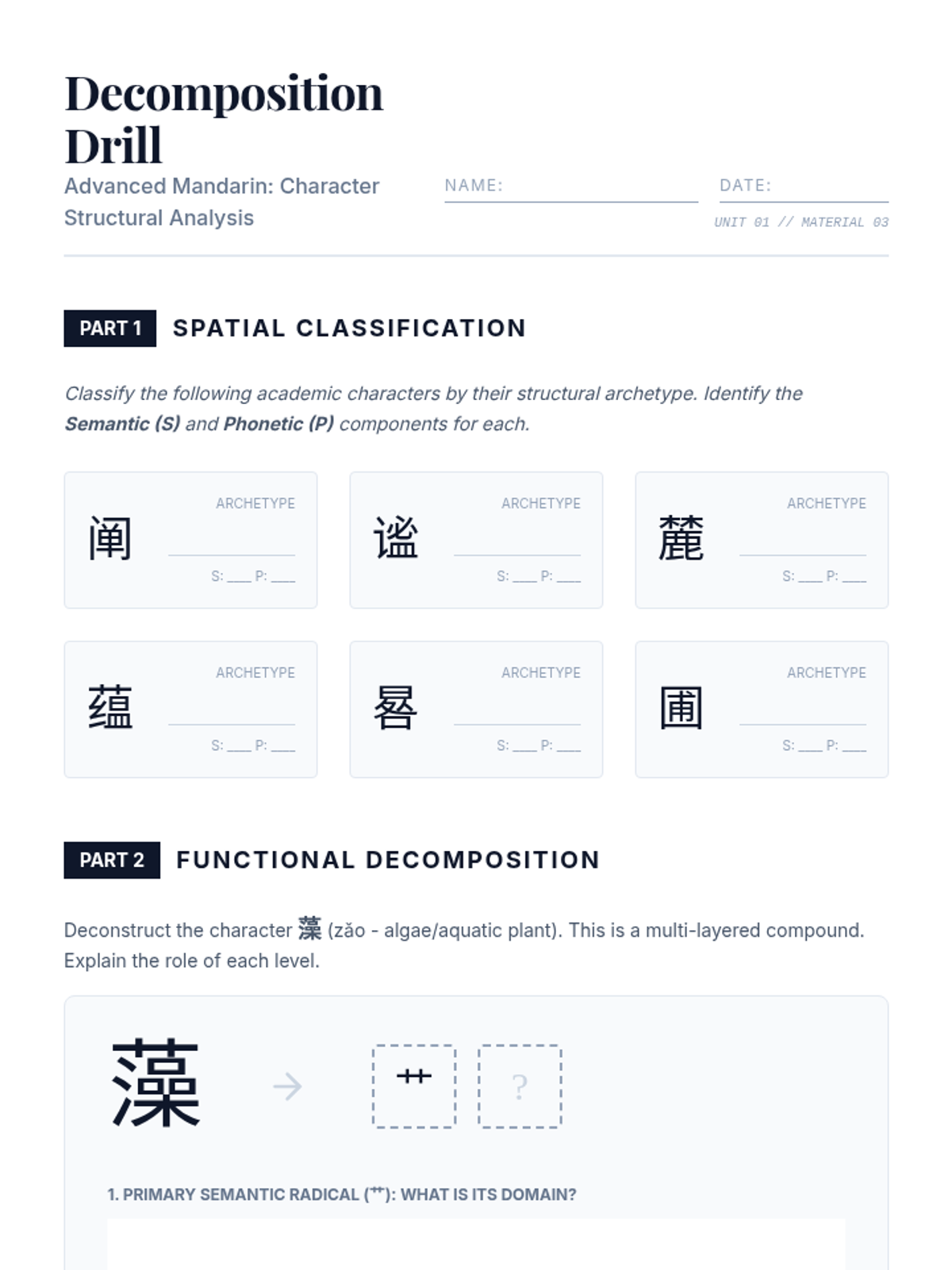 This inquiry-based sequence demystifies the structure of semantic-phonetic characters, which make up the vast majority of the Chinese writing system. Students move from rote memorization to analytical decoding by identifying the 'meaning' component (radical) and the 'sound' component (phonetic) within intermediate-level characters.
