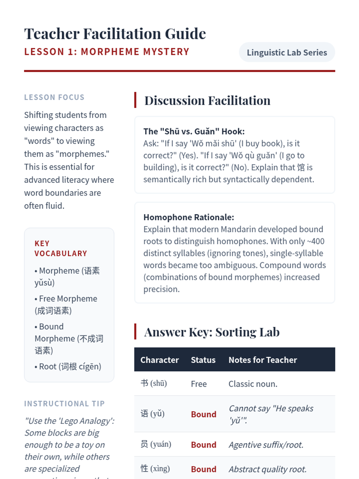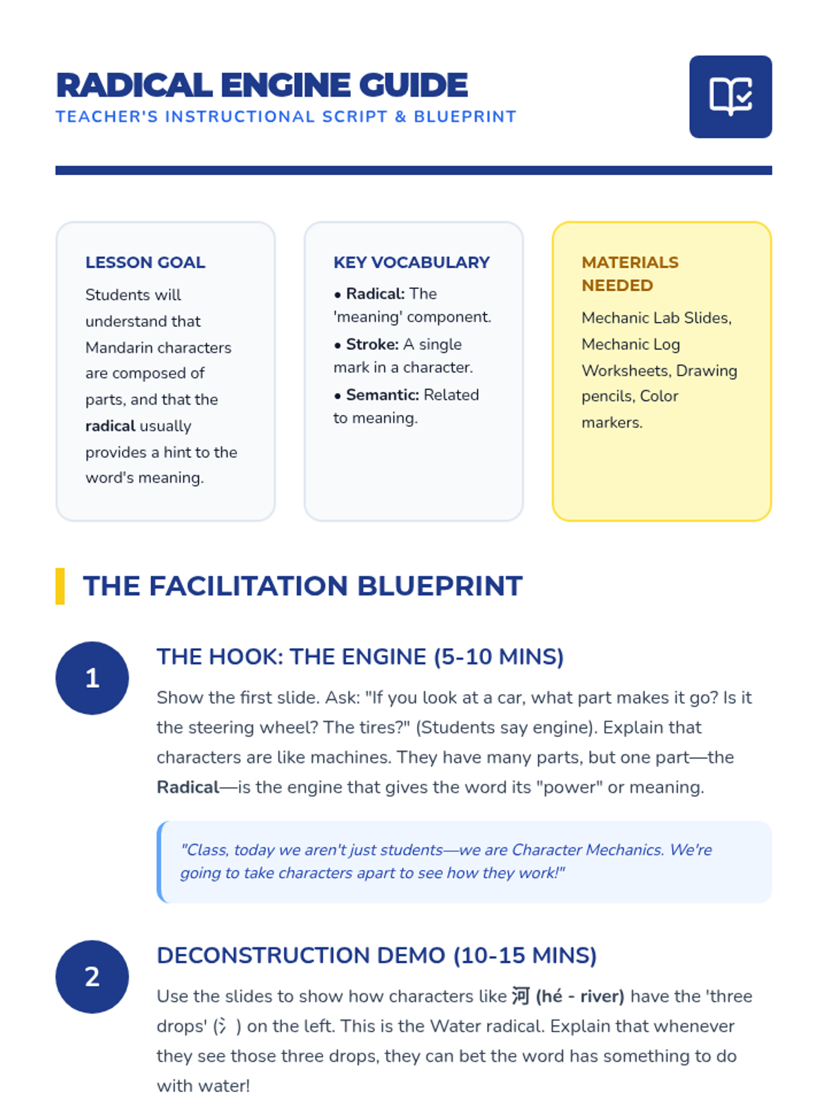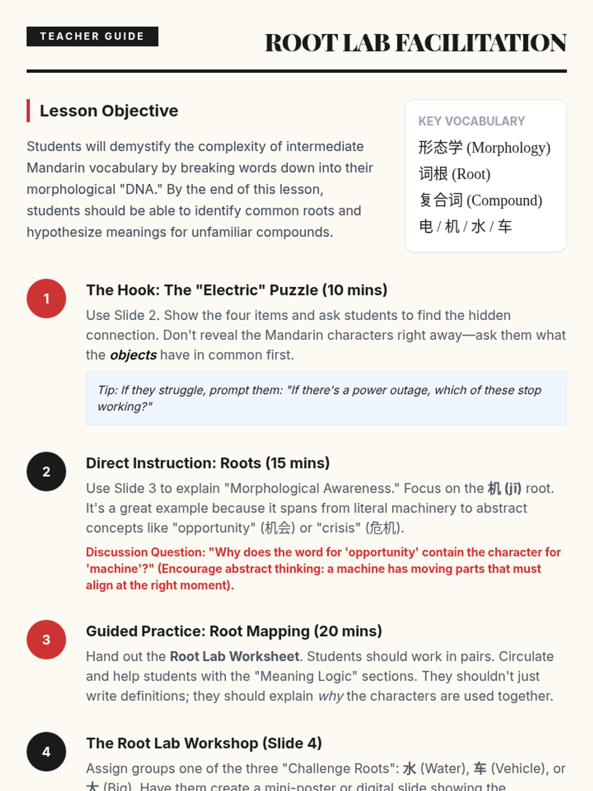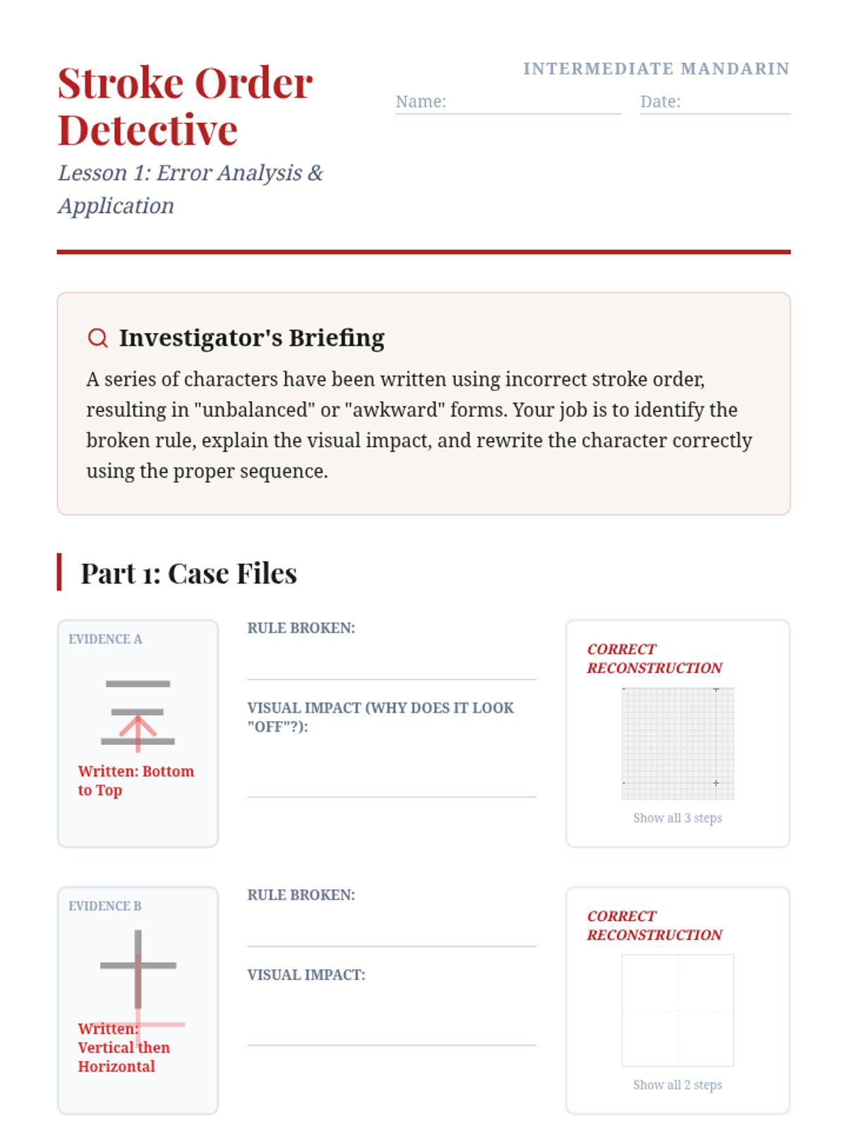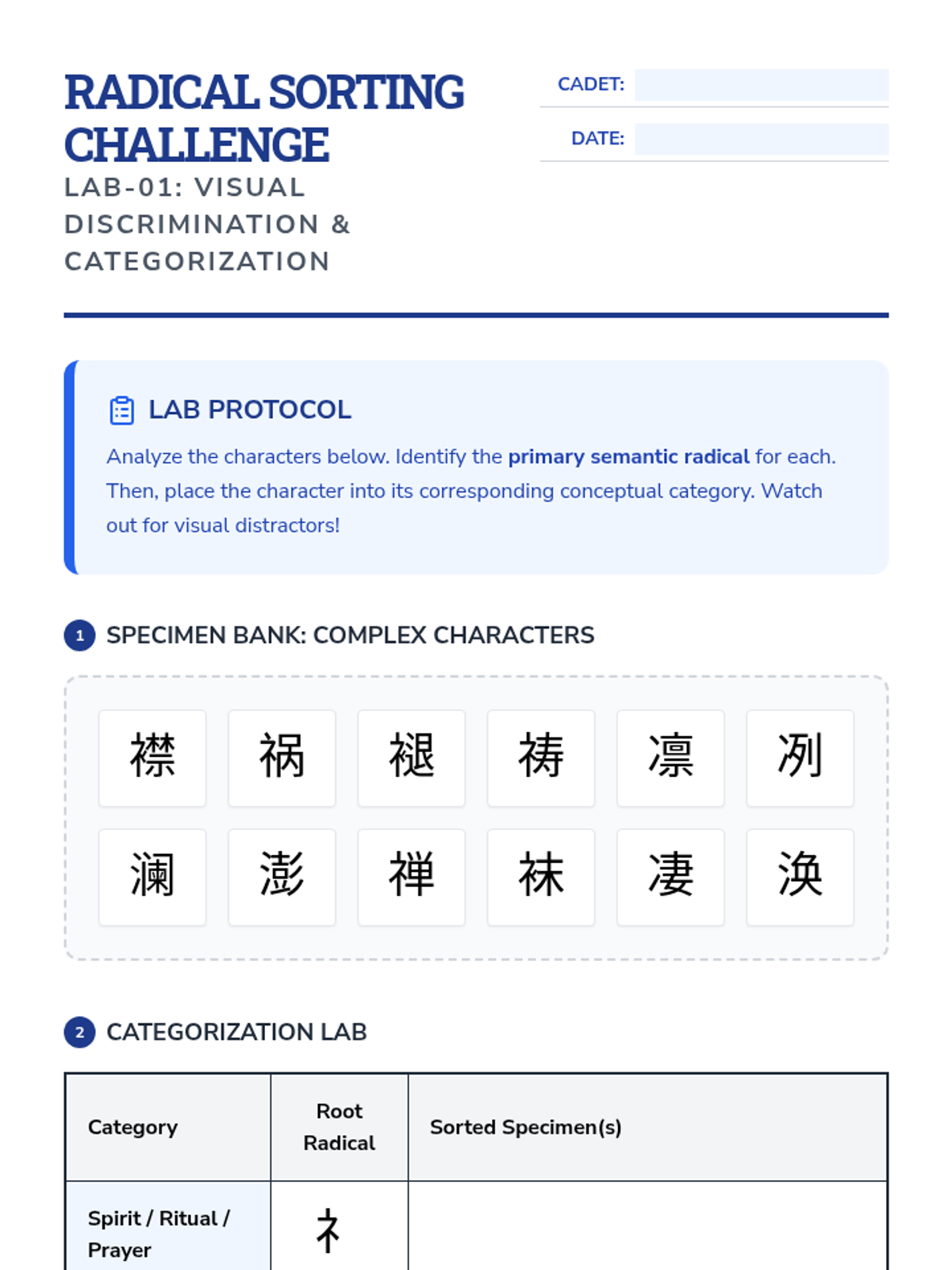 This inquiry-based sequence demystifies the structure of semantic-phonetic characters, which make up the vast majority of the Chinese writing system. Students move from rote memorization to analytical decoding by identifying the 'meaning' component (radical) and the 'sound' component (phonetic) within intermediate-level characters.