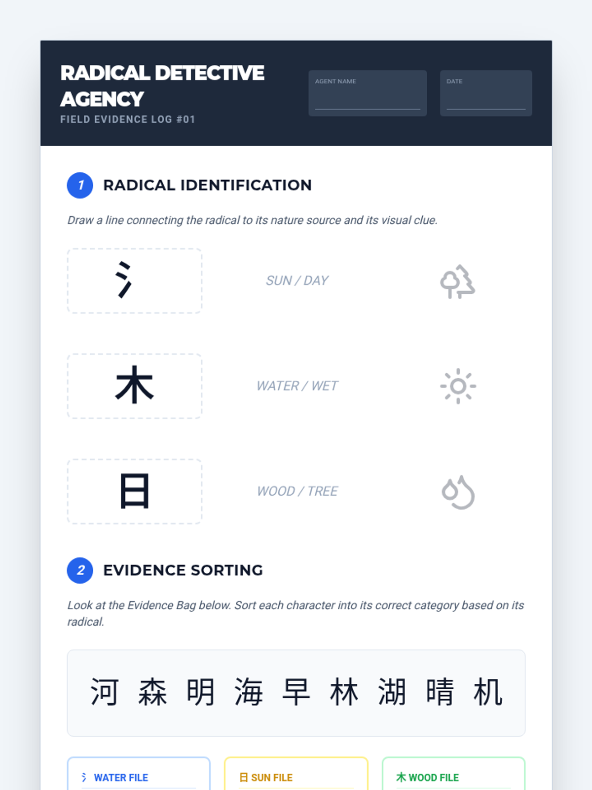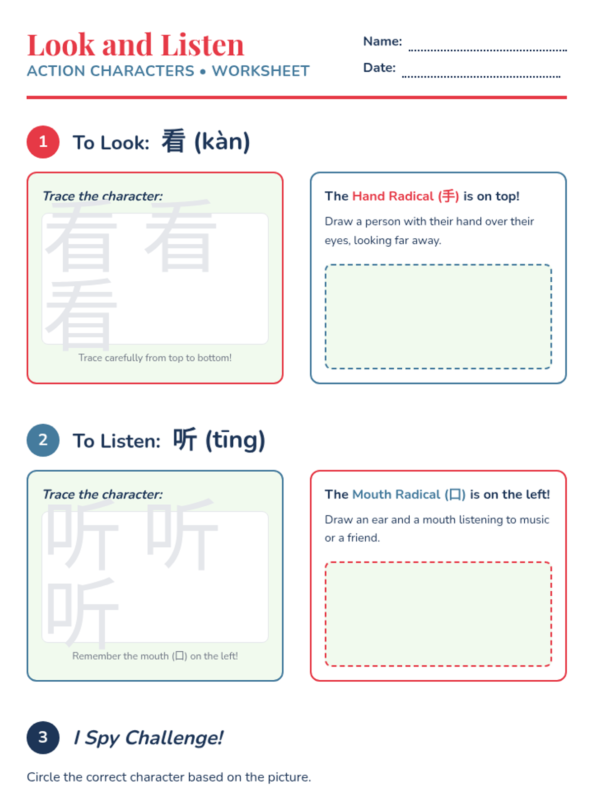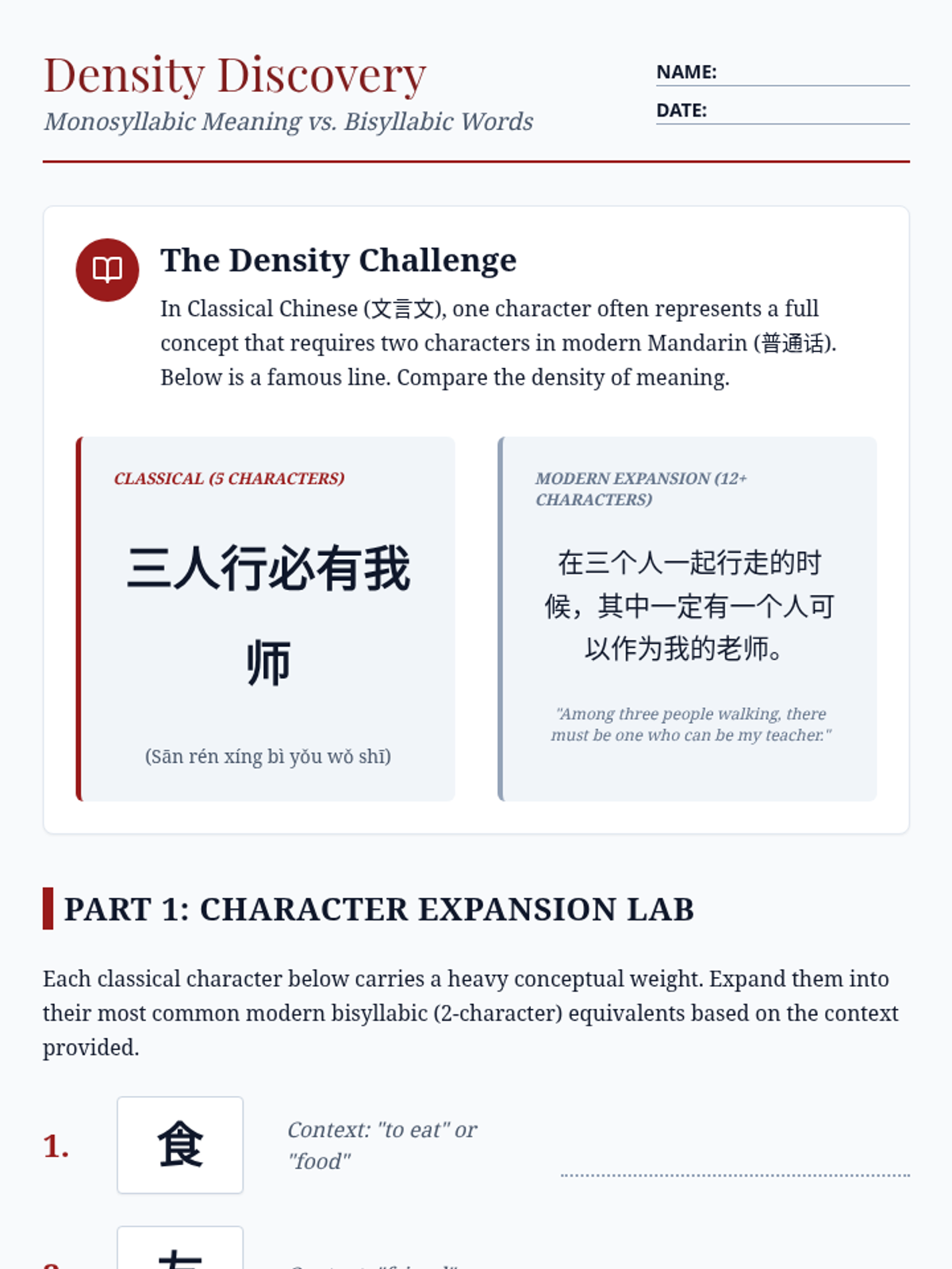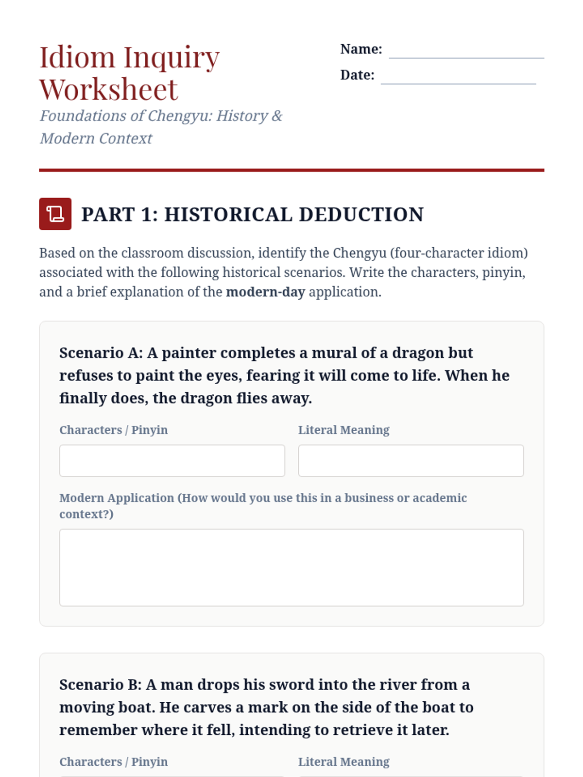 This inquiry-based sequence demystifies the structure of semantic-phonetic characters, which make up the vast majority of the Chinese writing system. Students move from rote memorization to analytical decoding by identifying the 'meaning' component (radical) and the 'sound' component (phonetic) within intermediate-level characters.