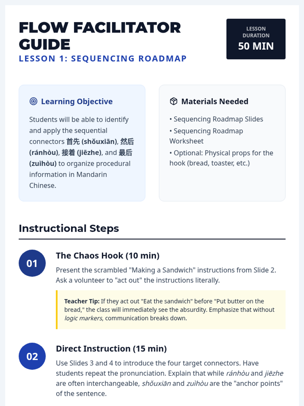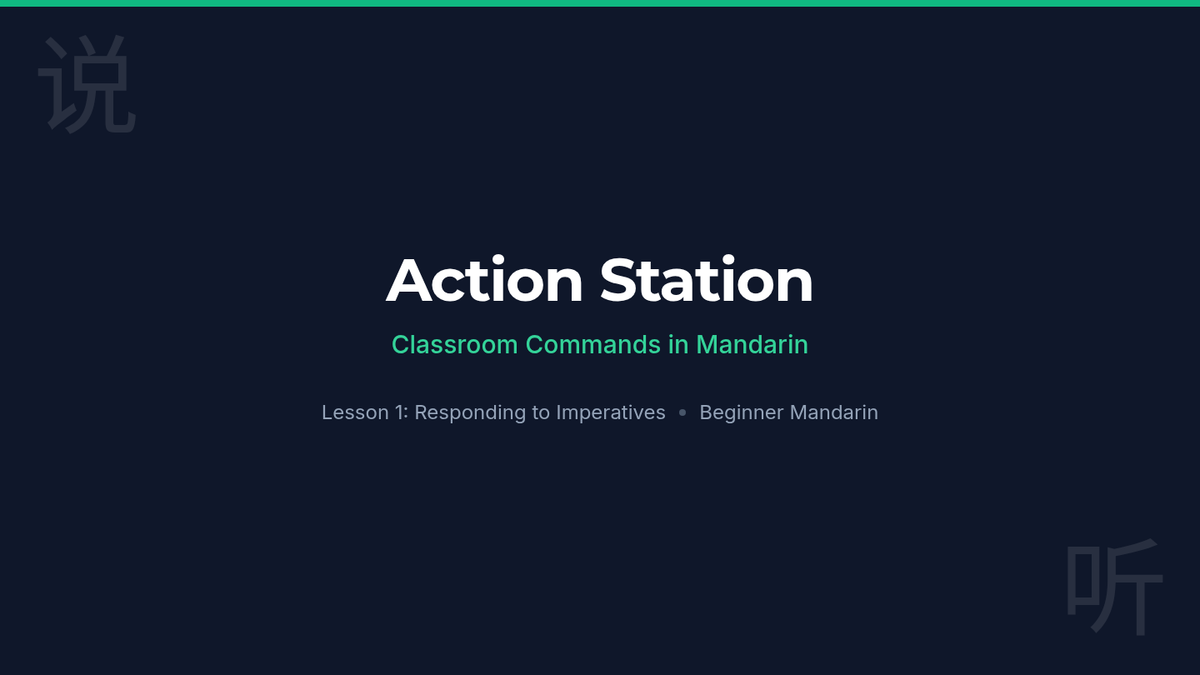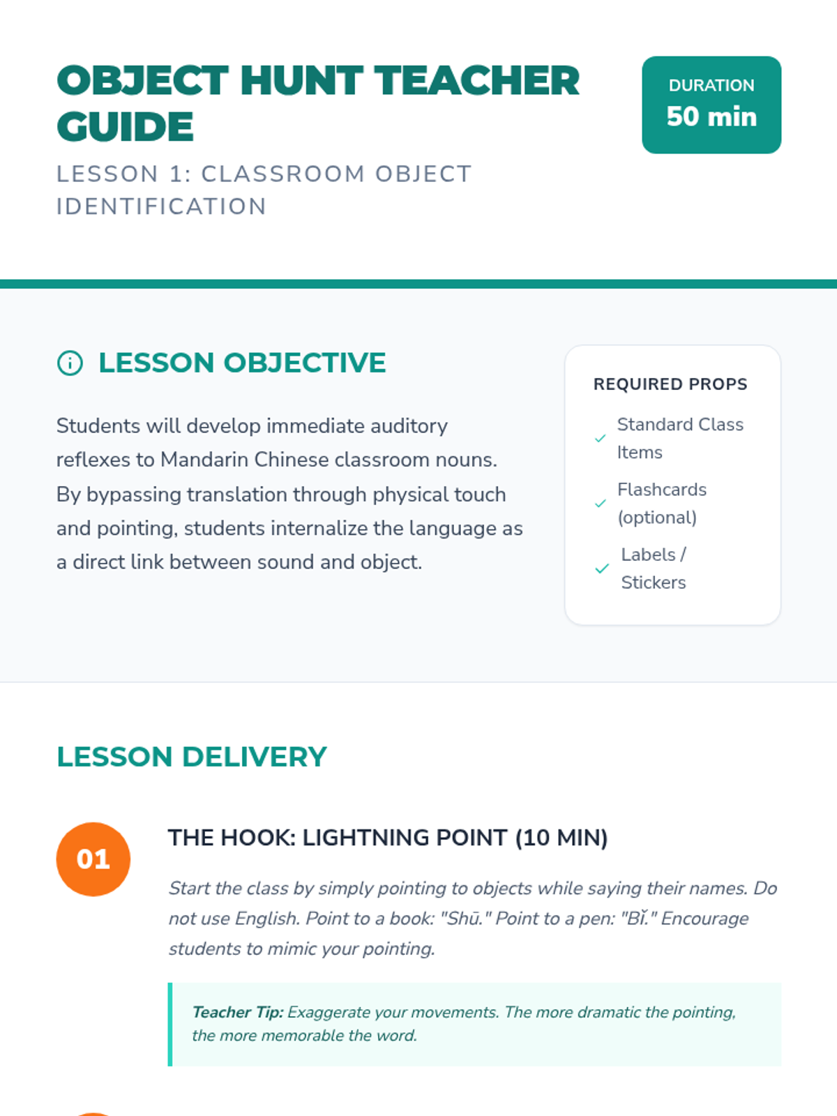 A TPR-based Mandarin listening sequence for 8th graders, focusing on classroom commands, object identification, and multi-step routines. Students build auditory reflexes and comprehension through physical movement and interactive activities.