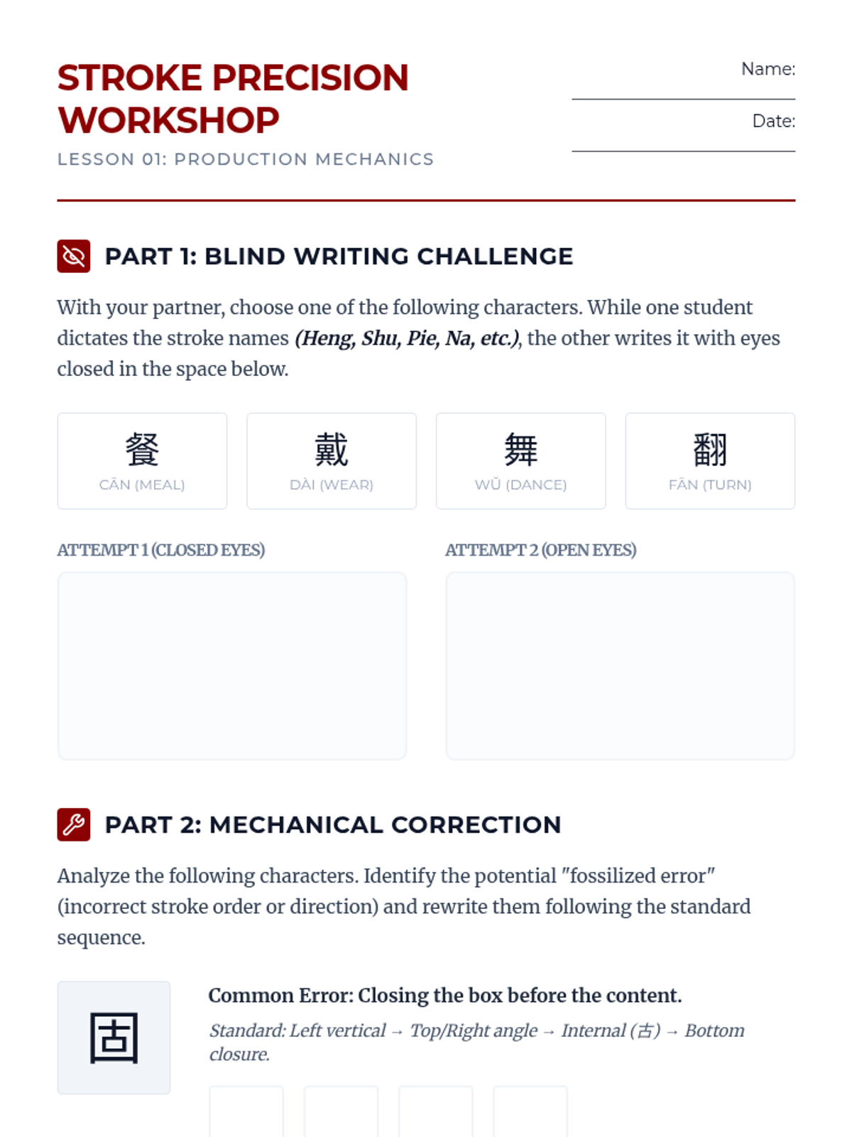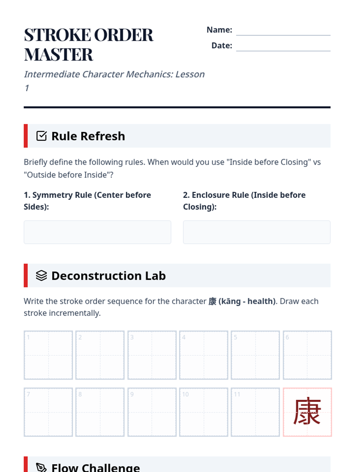 This workshop-style sequence focuses on the physical mechanics and aesthetics of writing intermediate Mandarin characters. Students move from basic stroke order rules to mastering complex HSK 3-4 character structures, digital handwriting recognition, and writing fluidity.