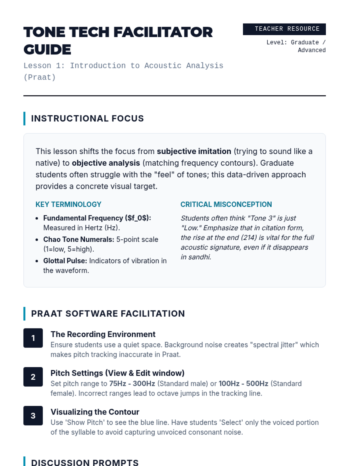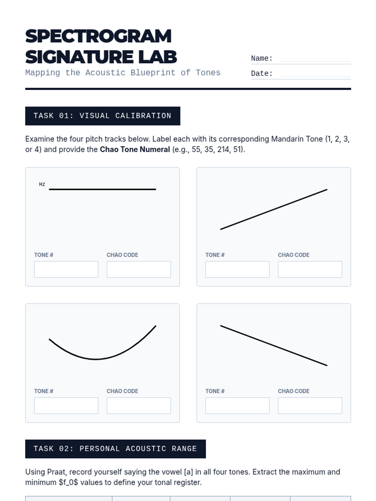 This graduate-level sequence bridges phonetic theory and acoustic analysis, using software visualization to master Mandarin Chinese tones. Students use pitch tracking and spectrogram data to move beyond auditory imitation into objective, data-driven speech correction.