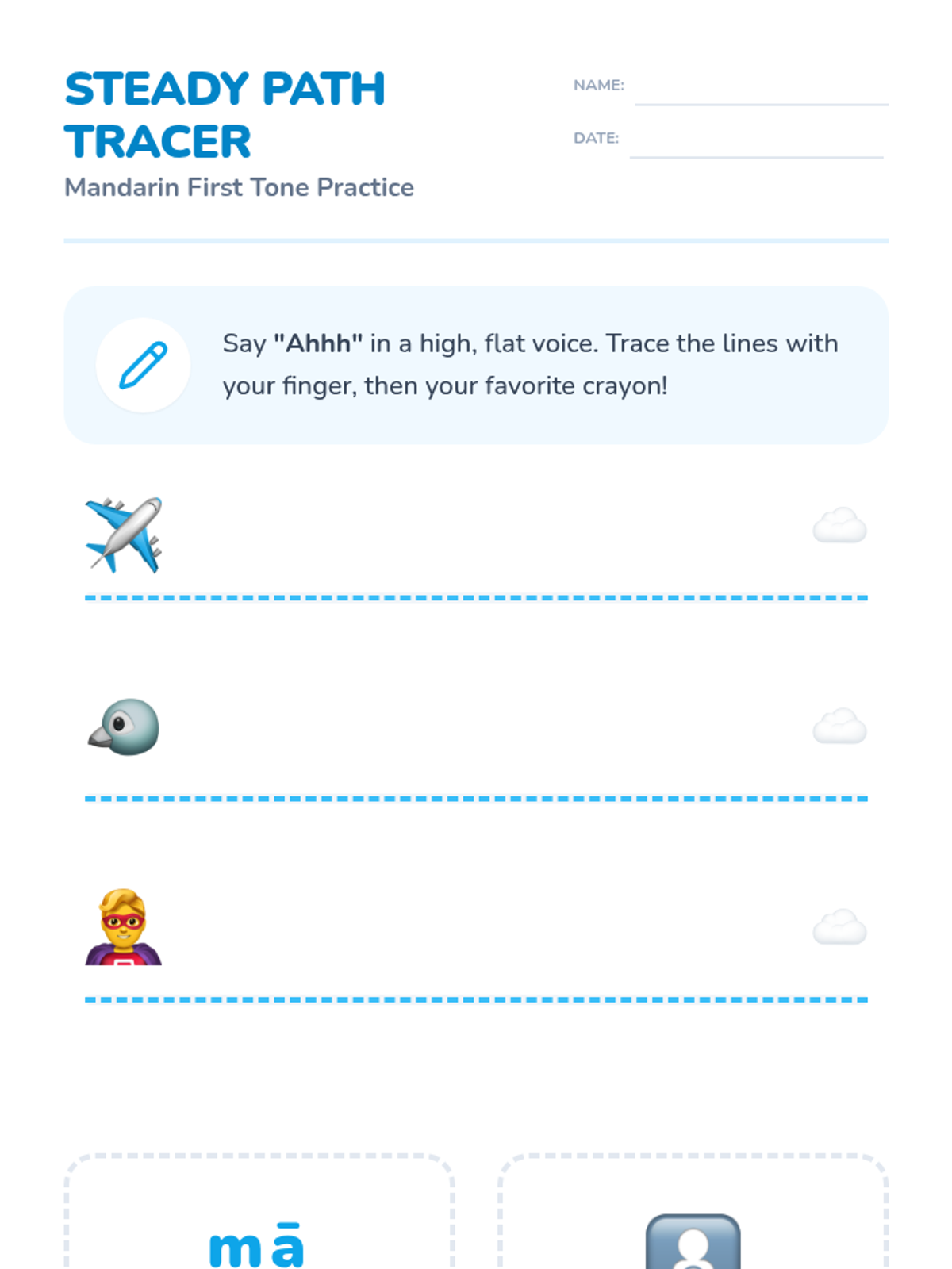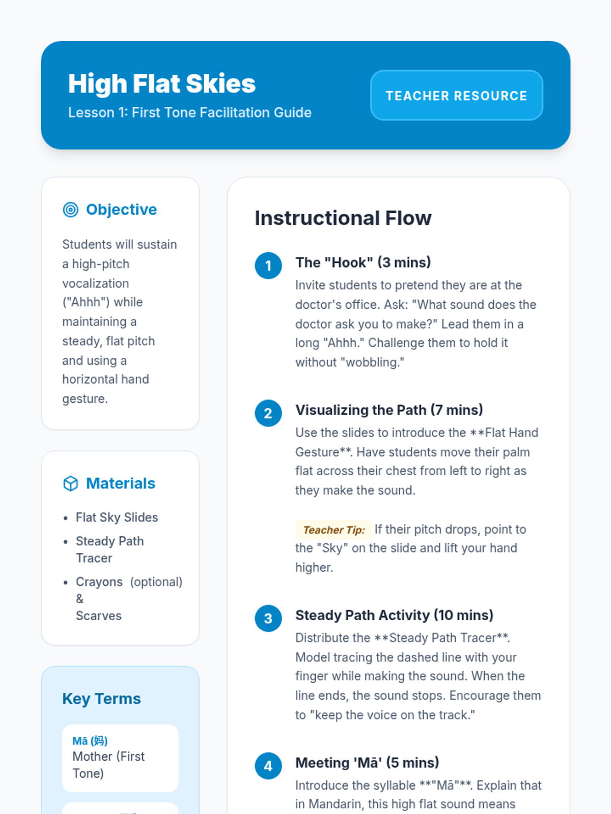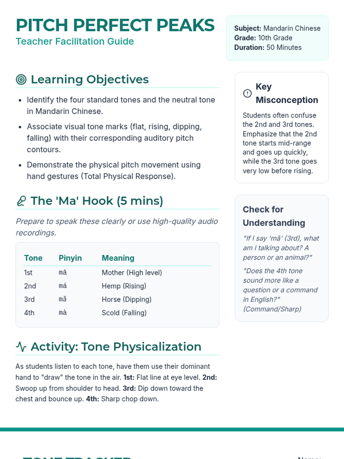 A foundational sequence for Pre-K learners to explore the four tones of Mandarin Chinese through auditory play, physical movement, and vocal exploration. Students learn to associate pitch changes with meaning using relatable sounds like questioning 'Huh?' or firm 'No!' gestures.