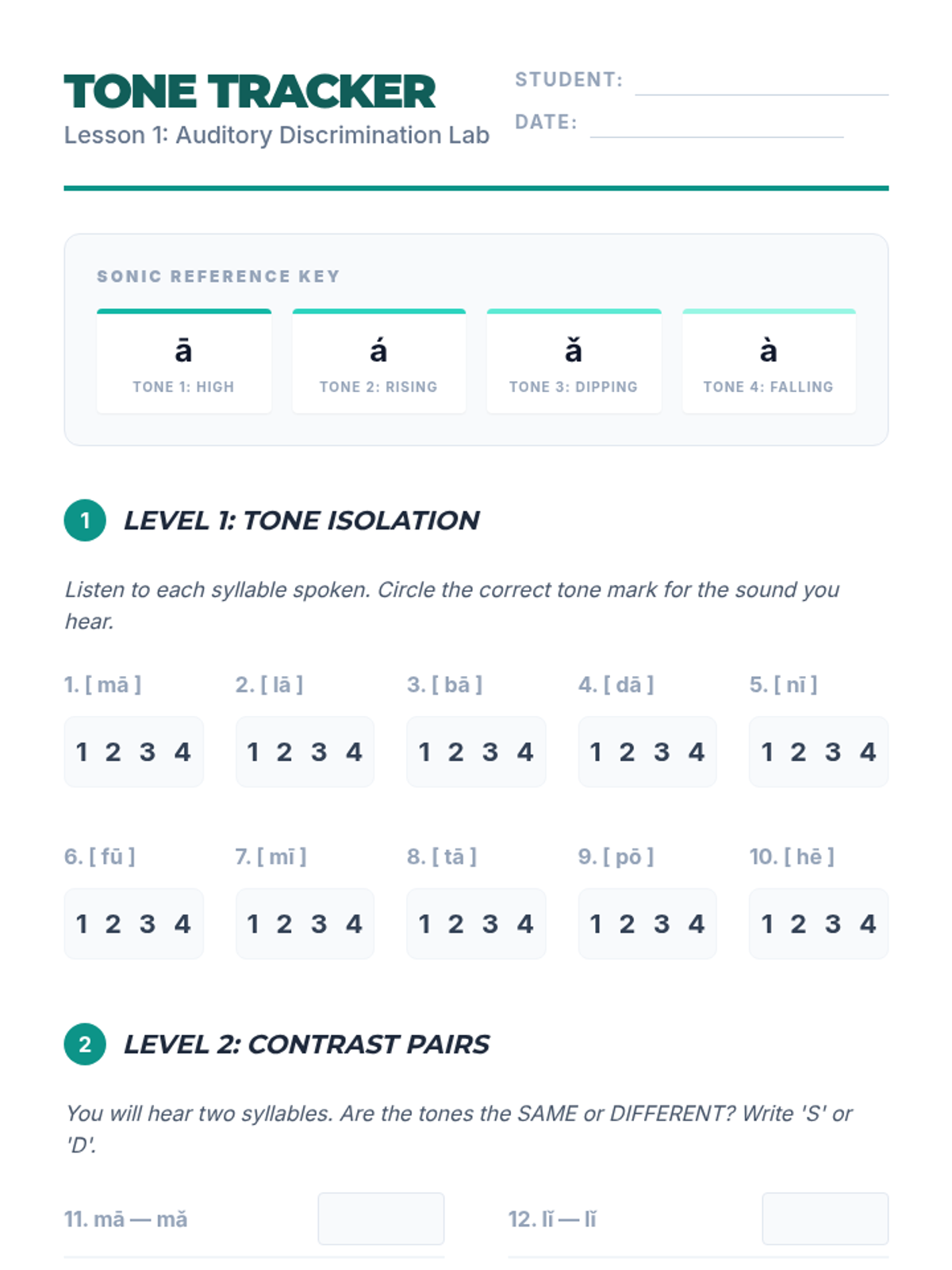 A foundational sequence for 12th-grade Mandarin students focusing on the auditory discrimination of the four tones, pinyin initials and finals, and tone sandhi rules. Students move from isolated sound recognition to full word transcription and auditory assessments.