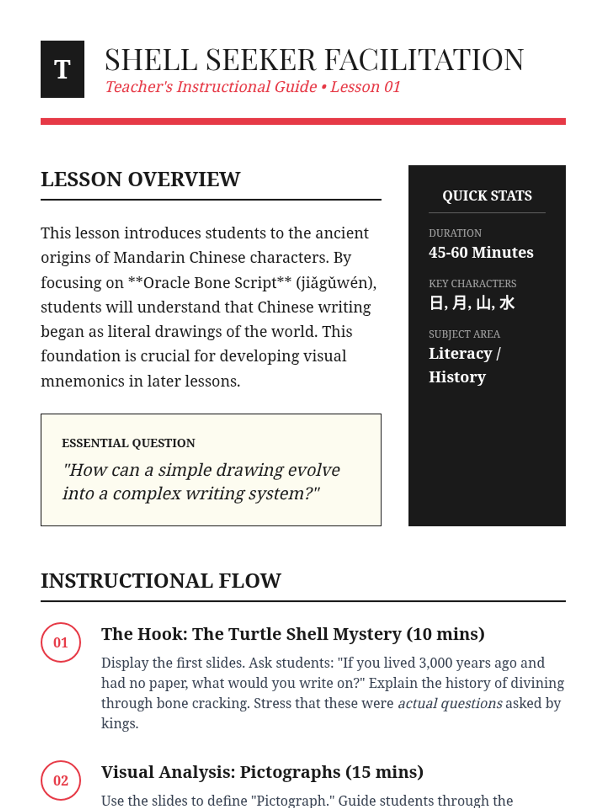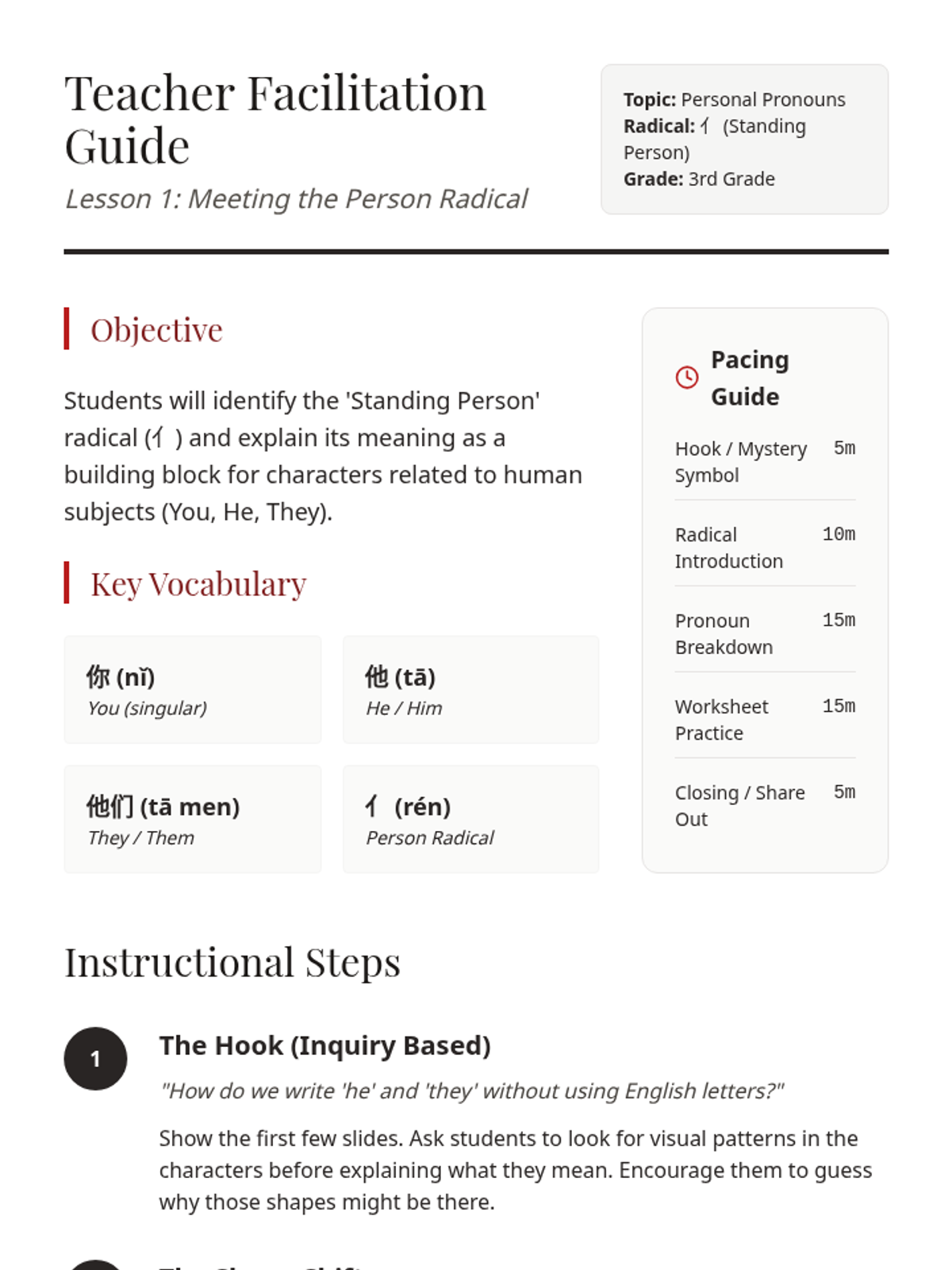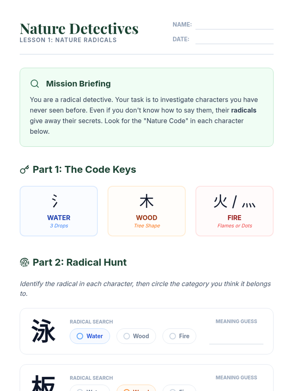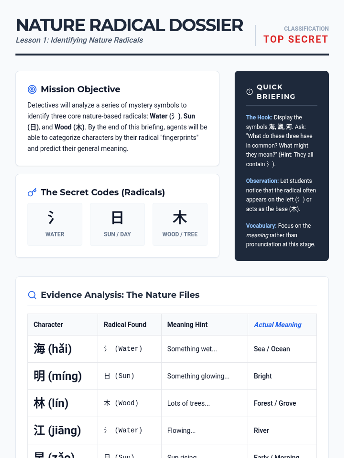 A 5-lesson inquiry-based sequence where 5th-grade students become 'Linguistic Detectives' to decode Mandarin Chinese characters by analyzing their radicals. Students move from simple nature-based radicals to complex compound characters, culminating in a real-world decoding challenge.