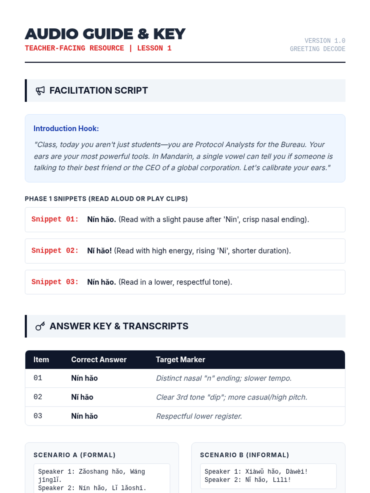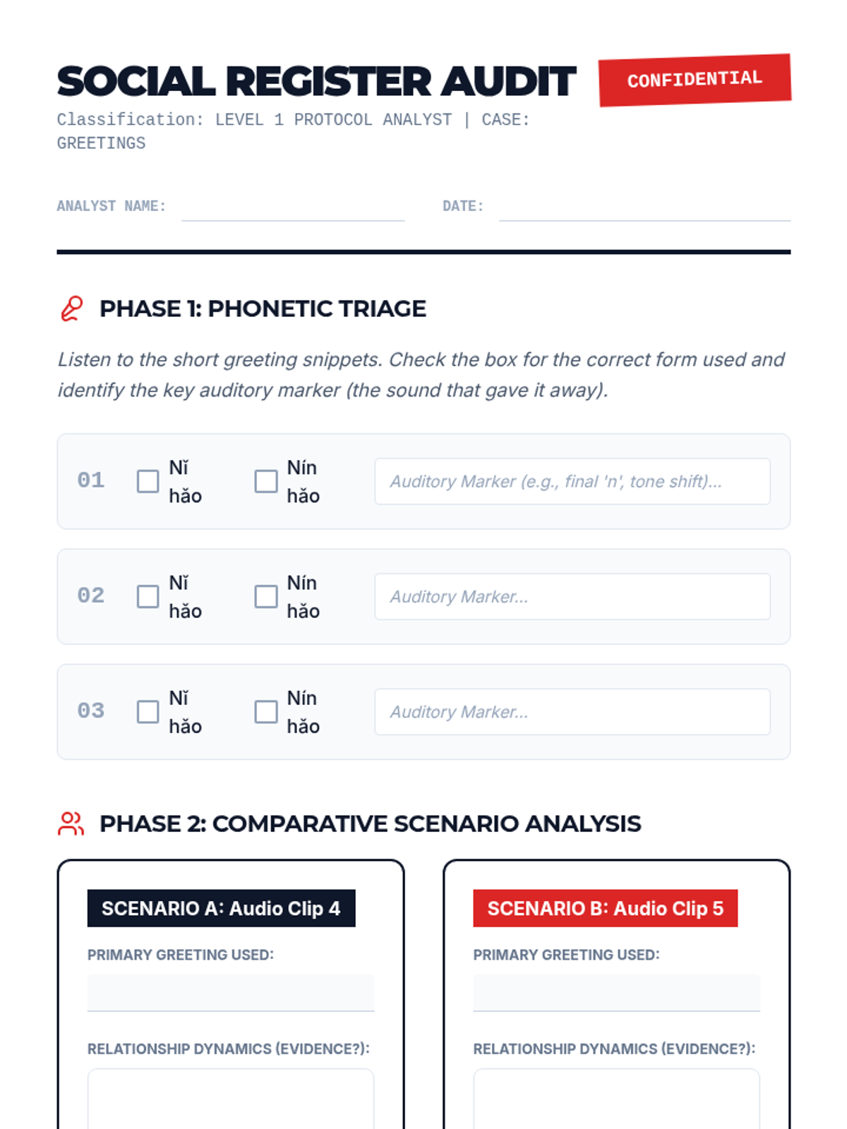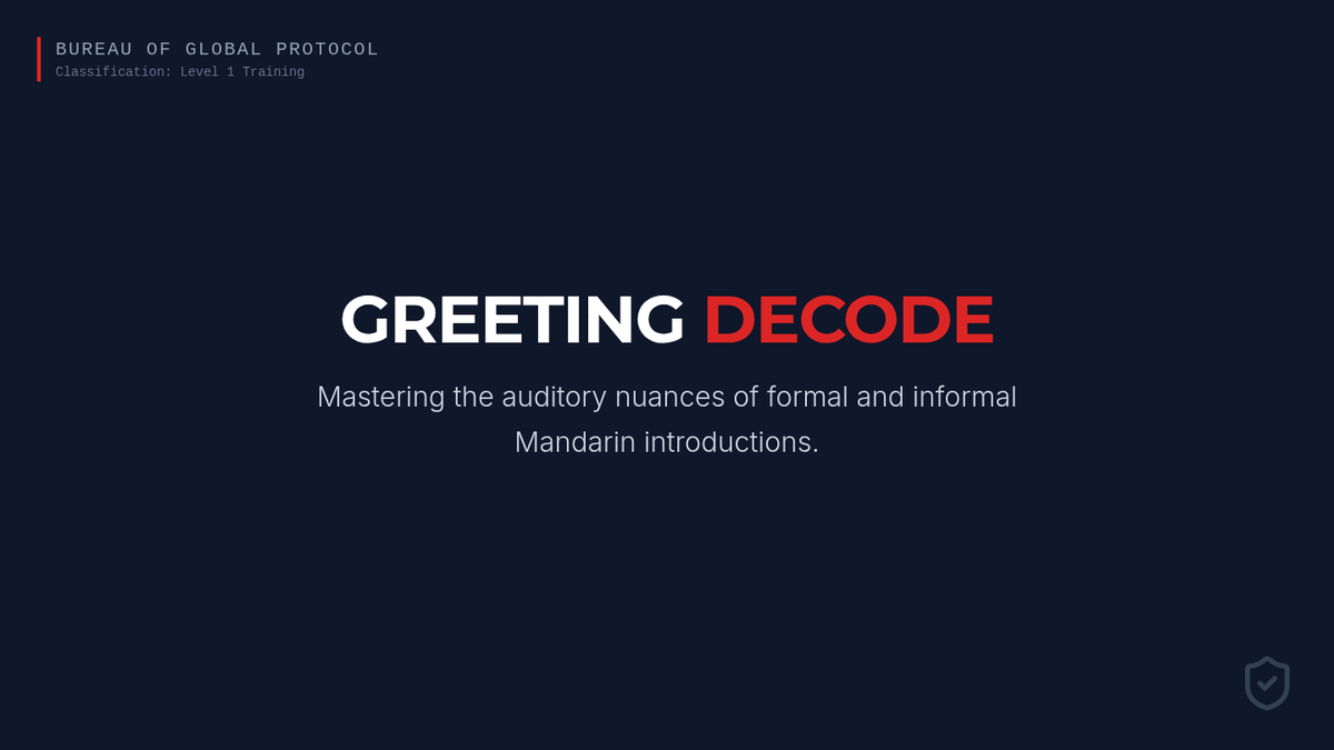 A high-stakes immersive sequence where 12th-grade students act as 'Protocol Analysts' to master Mandarin greetings and introductions. Students progress from basic register recognition to complex social deduction through simulated audio audits and role-play analysis.