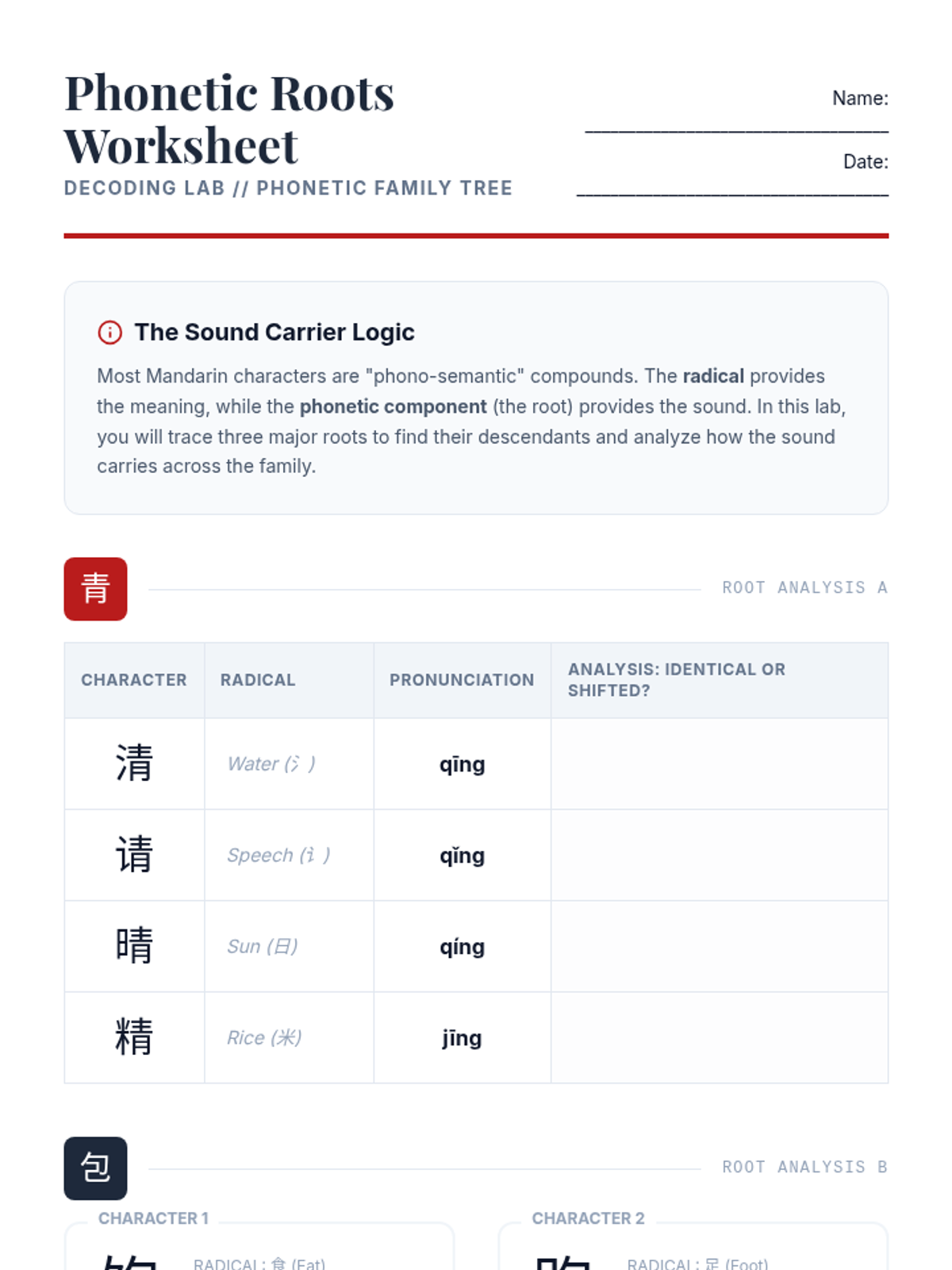 This advanced Mandarin Chinese sequence focuses on identifying phonetic components within compound characters. Students learn to decode pronunciation by recognizing 'sound carriers,' analyzing tone shifts, and navigating exceptions to improve reading fluency and predictive accuracy.