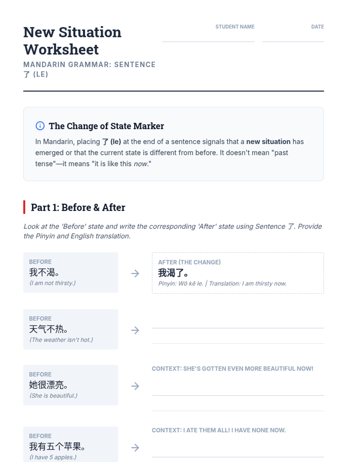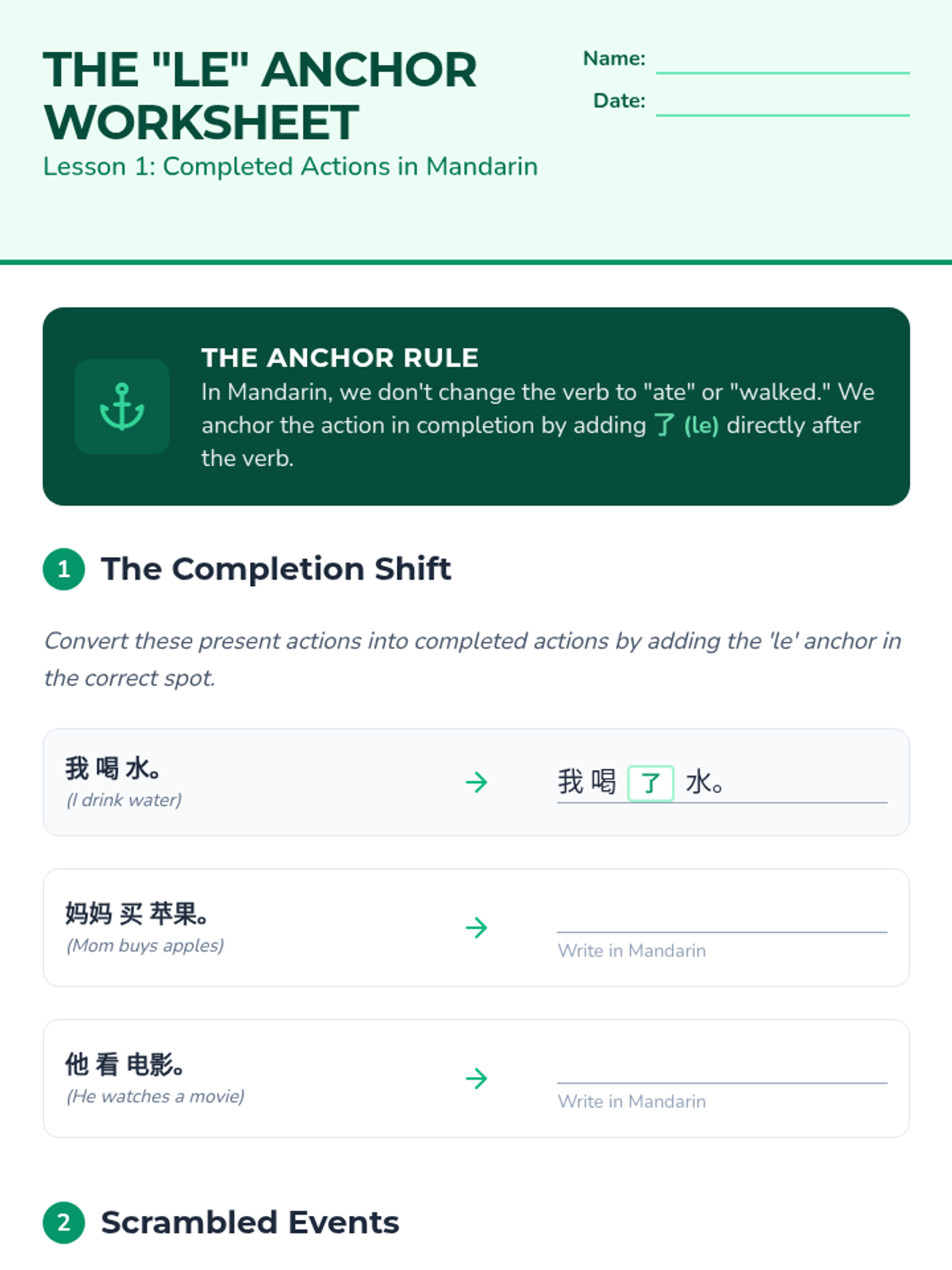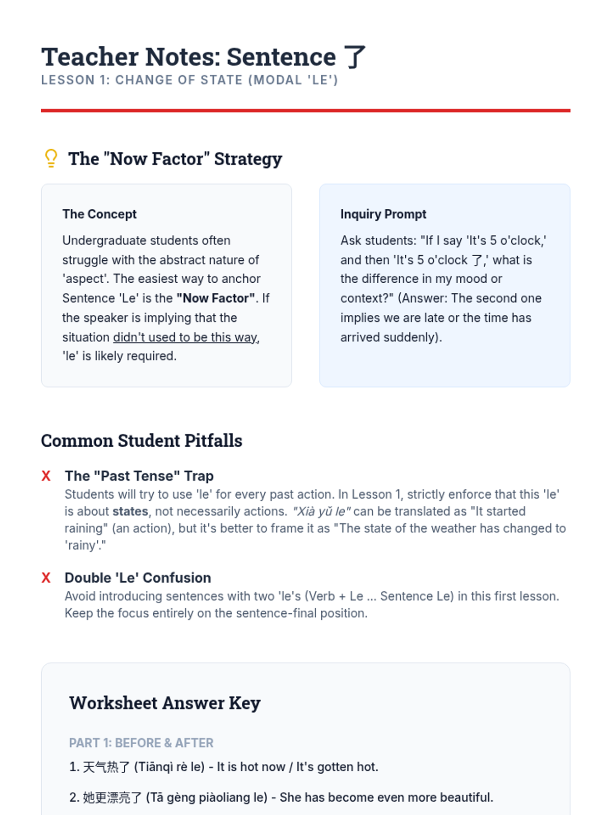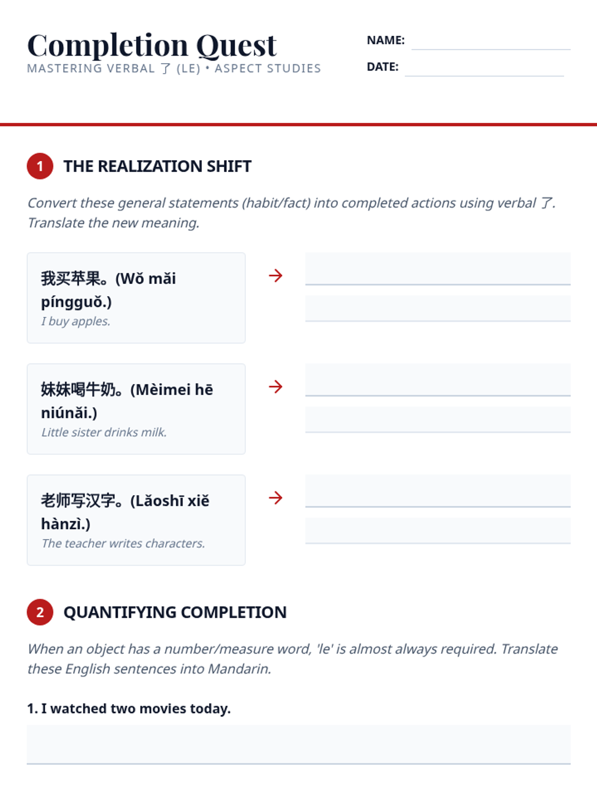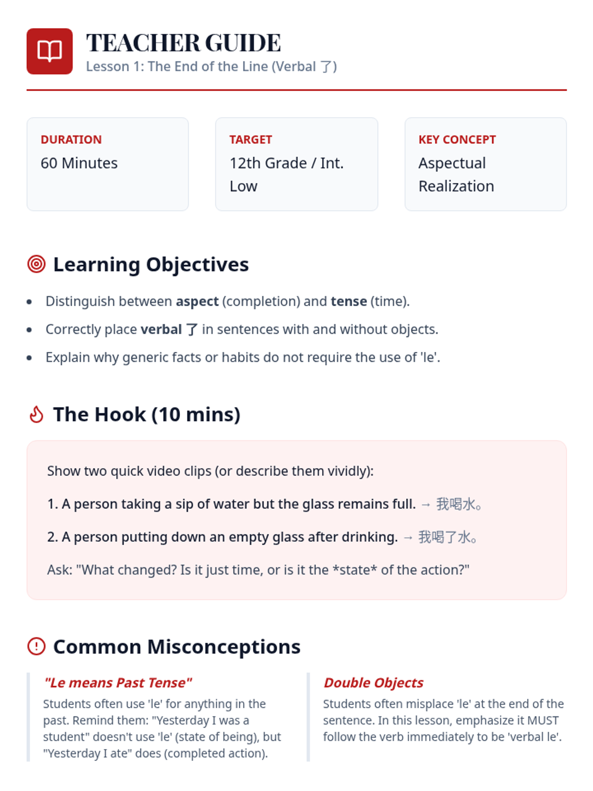 A comprehensive sequence for 12th-grade Mandarin students focusing on the versatile particle 'le'. Students will master its use for marking completed actions, changes of state, and duration while developing narrative skills through aspect-based storytelling.