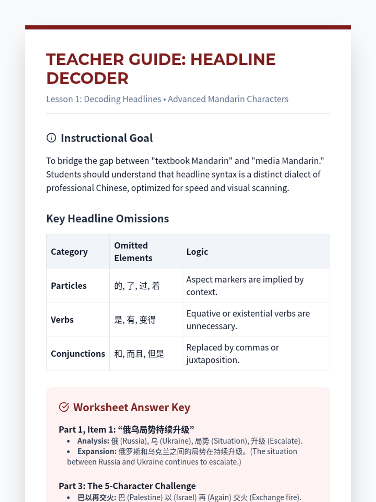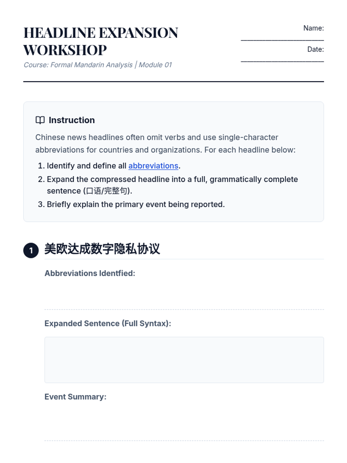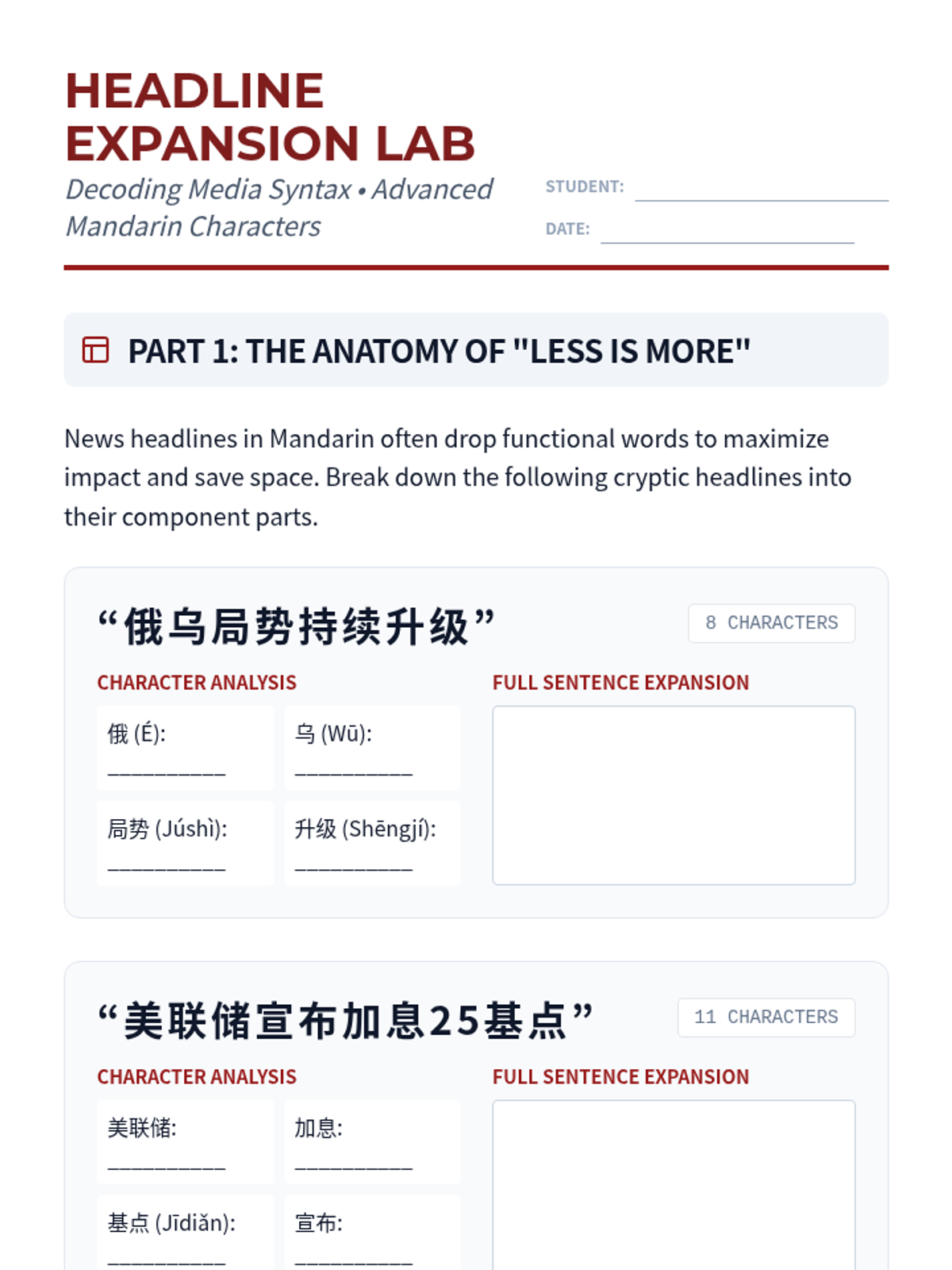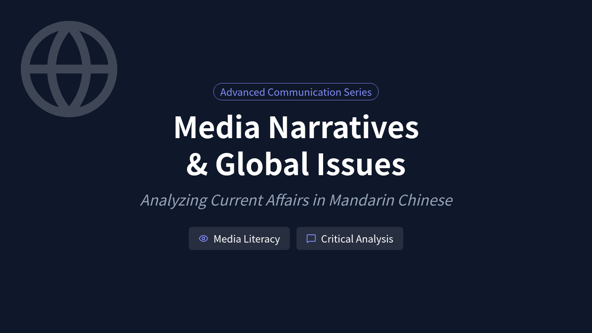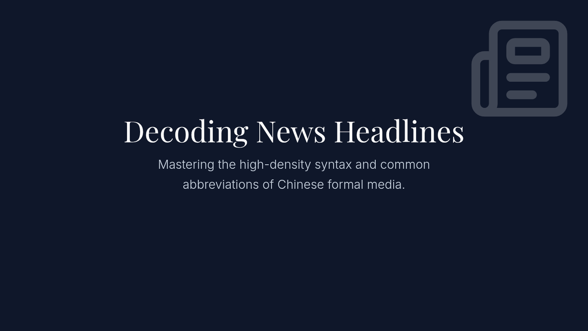 A specialized sequence for graduate students to master the formal register of Chinese news media. The course covers headline syntax, economic reporting logic, passive structures in incident reports, bias in editorials, and cross-regional news synthesis.