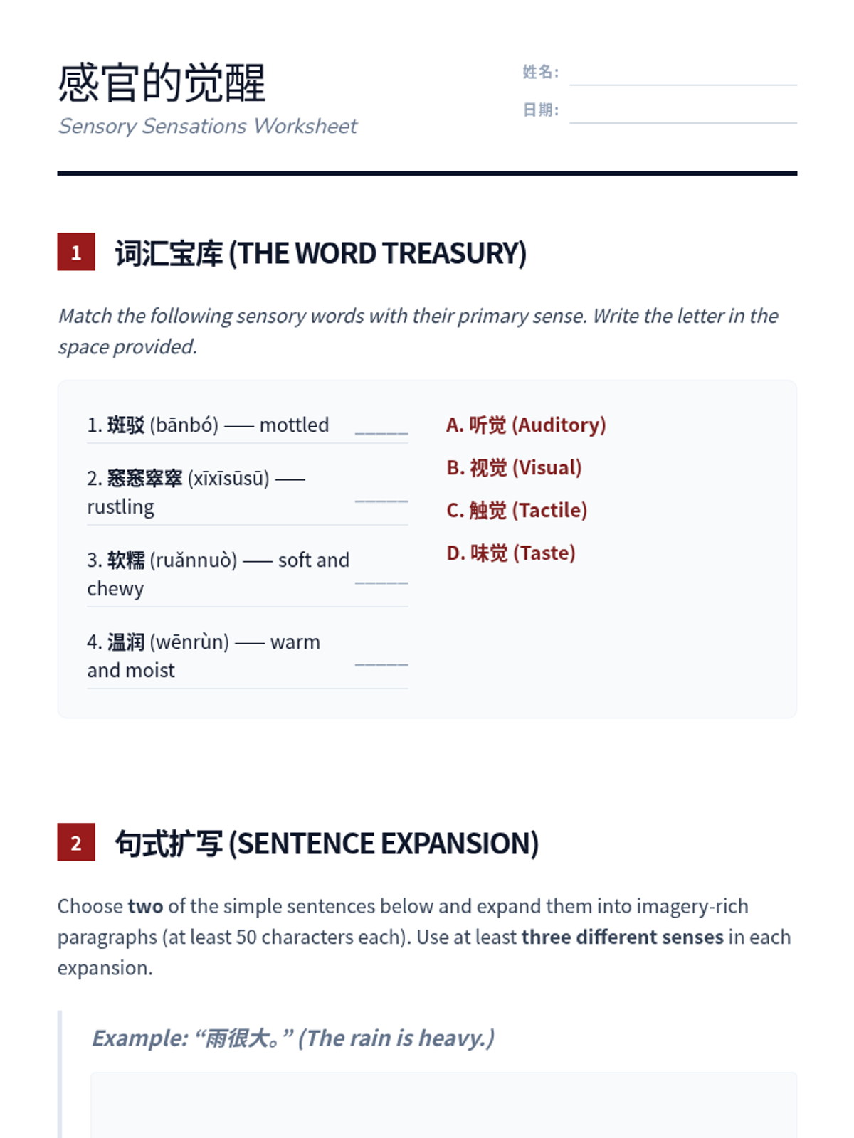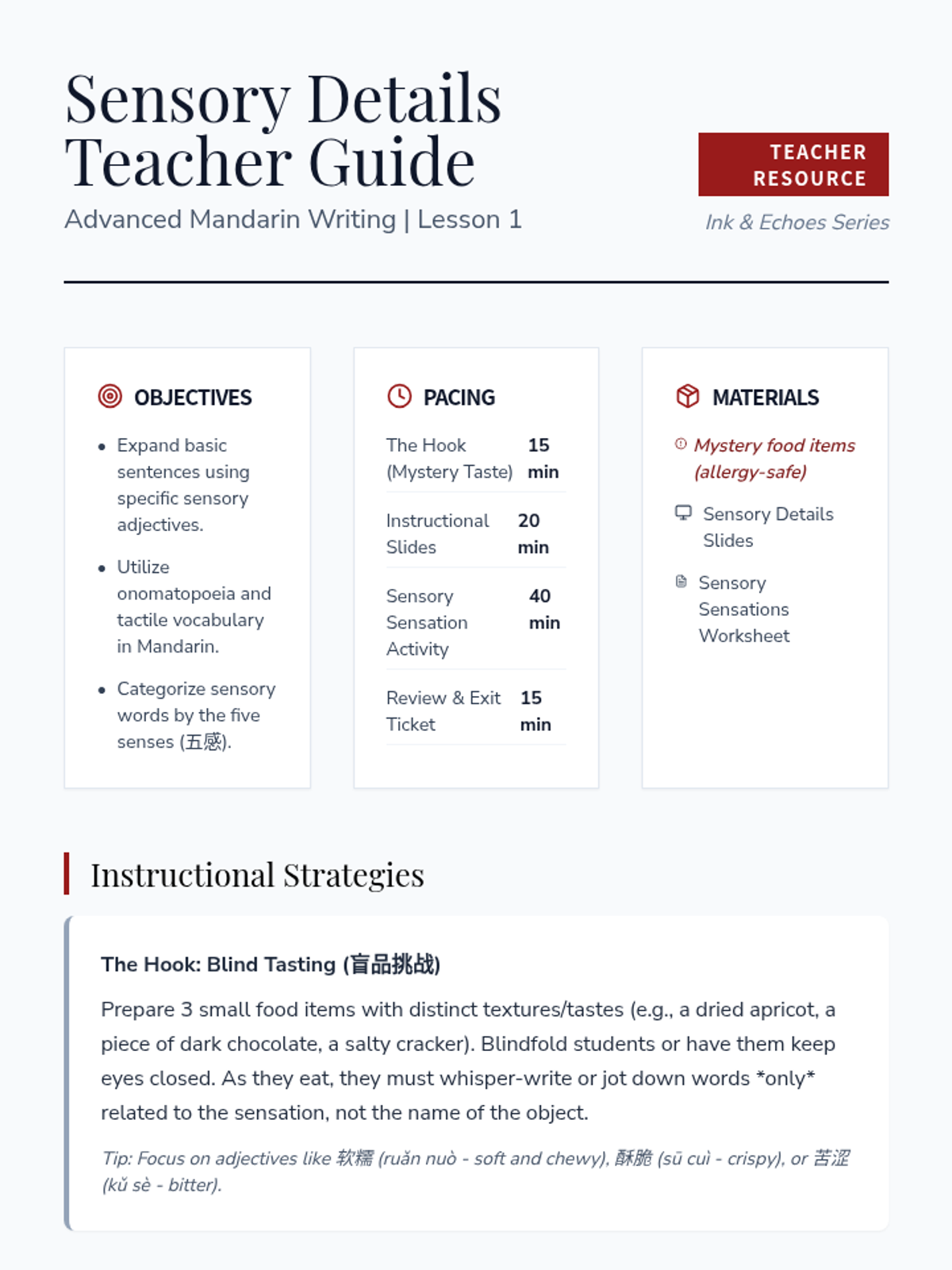A high school advanced Mandarin writing sequence focused on developing a narrative voice through sensory details, imagery, introspective vocabulary, and narrative structure. Students progress from descriptive exercises to a full reflective essay.