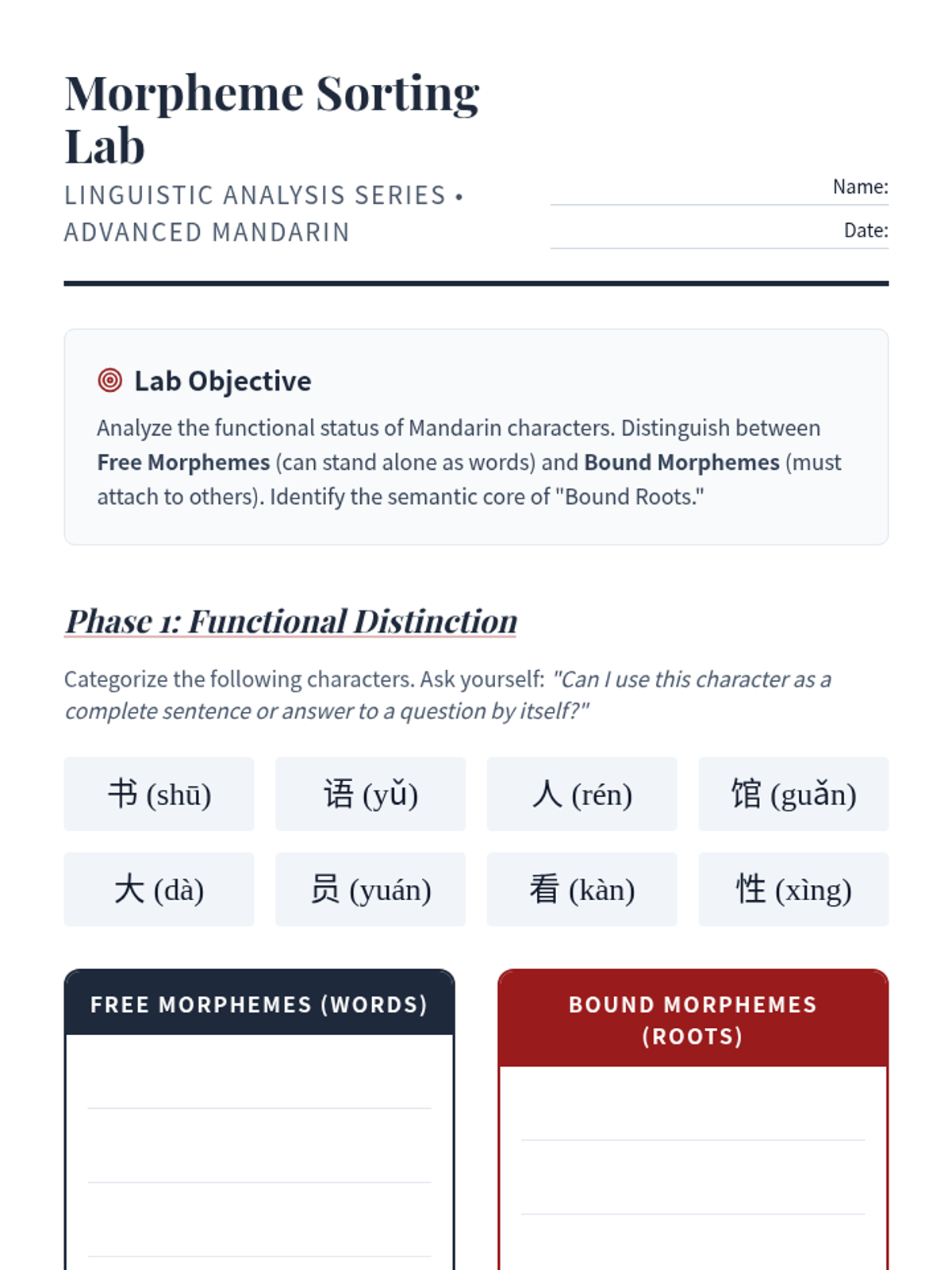 An advanced exploration of Mandarin Chinese morphology, focusing on how characters combine as bound and free morphemes to form complex vocabulary. Students will master word formation logic, quasi-affixes, and abbreviation strategies to decode unfamiliar terms and create neologisms.
