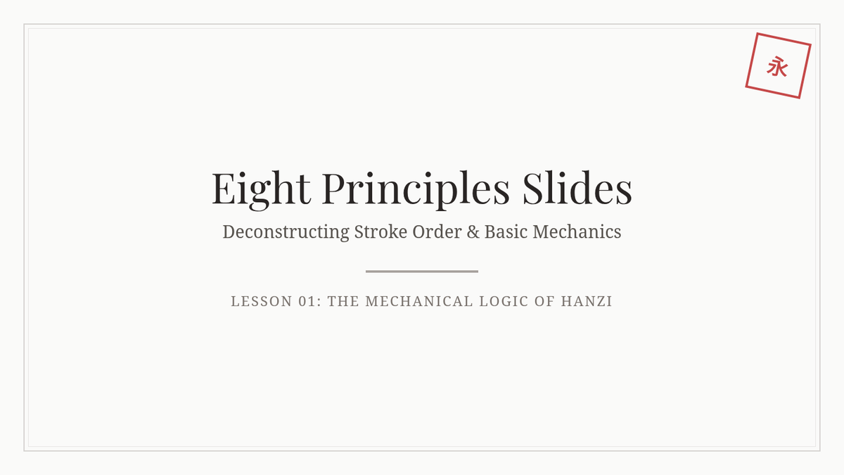 A deep analytical dive into the etymology and structural logic of the Chinese writing system for graduate-level adult learners. The sequence moves from basic mechanics and stroke order to complex phono-semantic decoding and aesthetic synthesis through calligraphy.