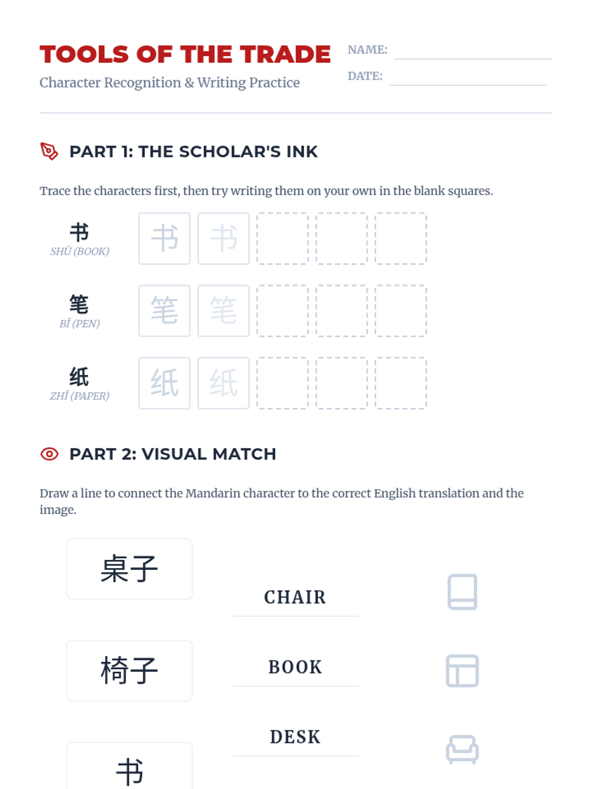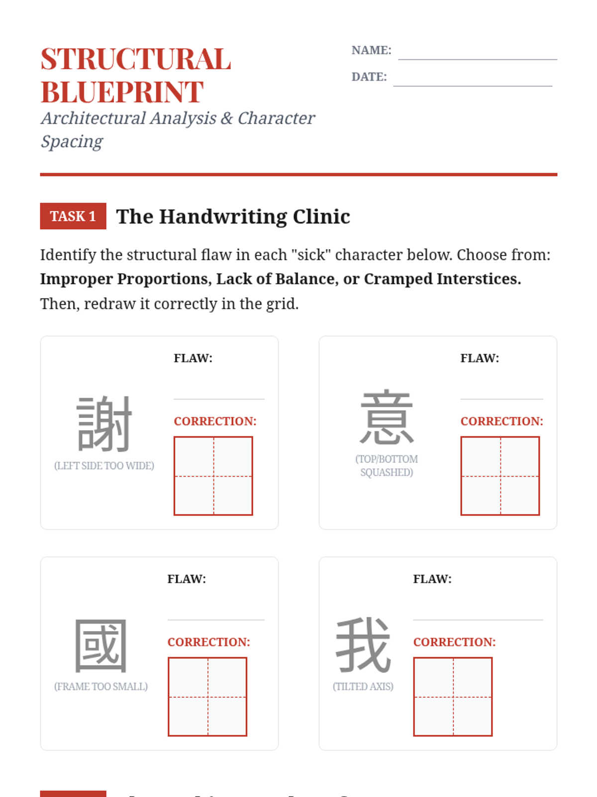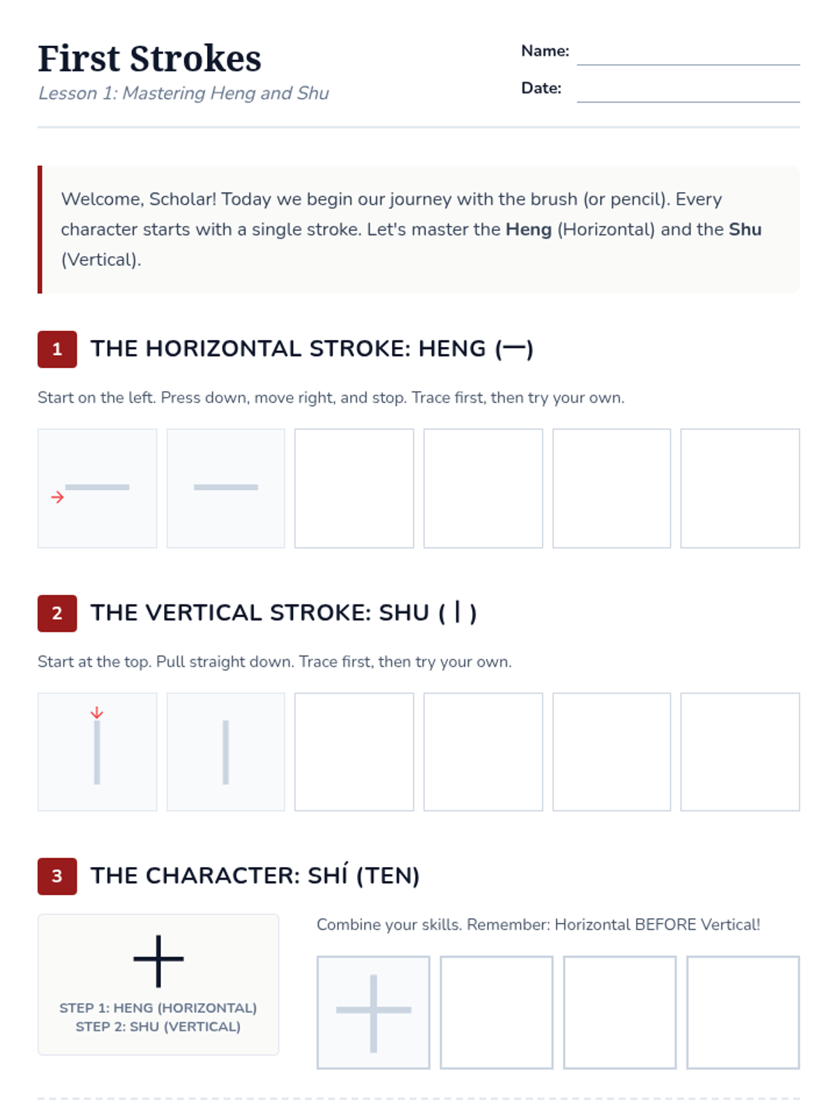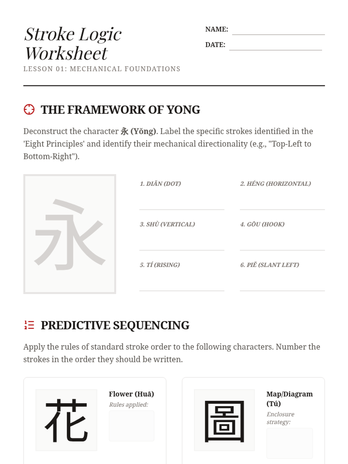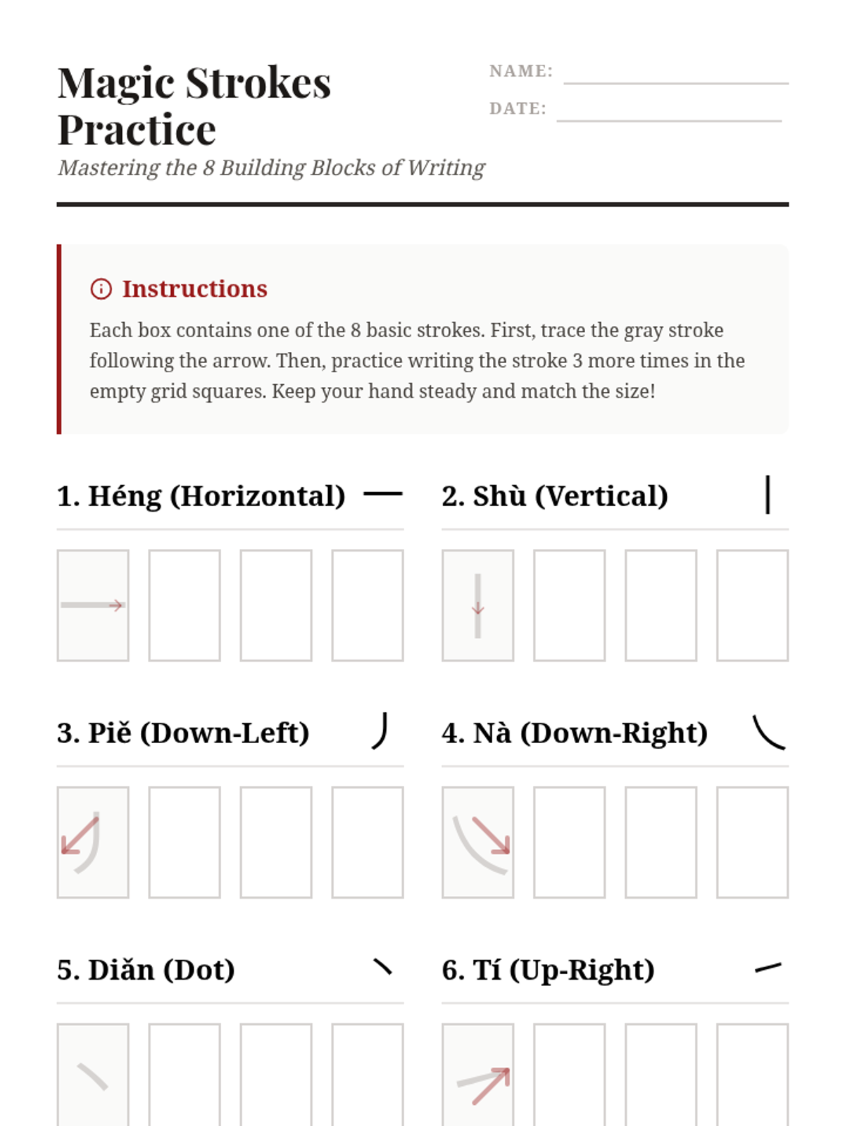 This workshop-style sequence focuses on the mechanics and aesthetics of writing intermediate Mandarin characters. Students refine their handwriting by mastering stroke order for complex characters and exploring structural balance using Tian Zi Ge grids, ultimately creating a calligraphic portfolio.